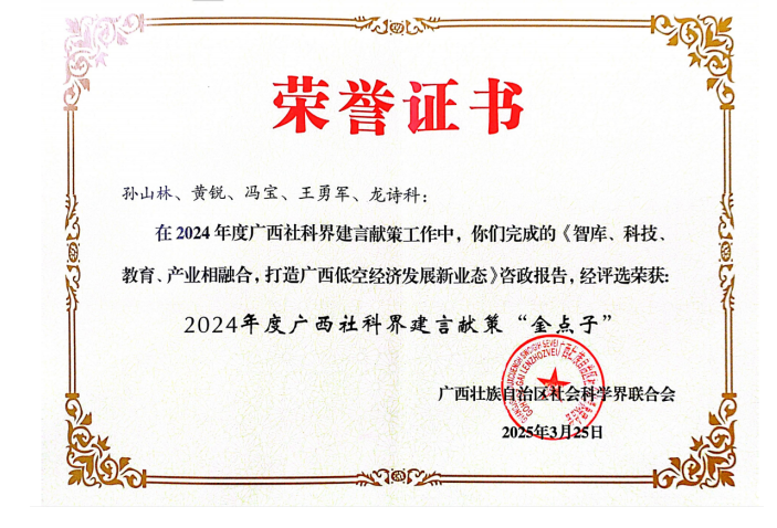 近期,广西壮族自治区社会科学界联合会公布了2024年度广西社科界“金点子”建言献策评选结果。由Beat365孙山林、黄锐、冯宝、王勇军、龙诗科等教师团队撰写的政府咨询报告《智库、科技、教育、产业相融合,打造广西...