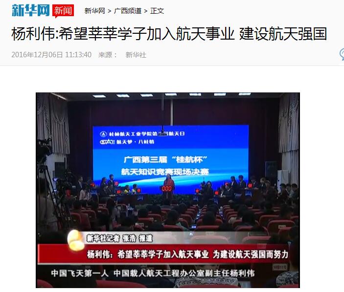 2016-12【新华网】杨利伟到访桂林 出席中国航天事业创建60周年活动