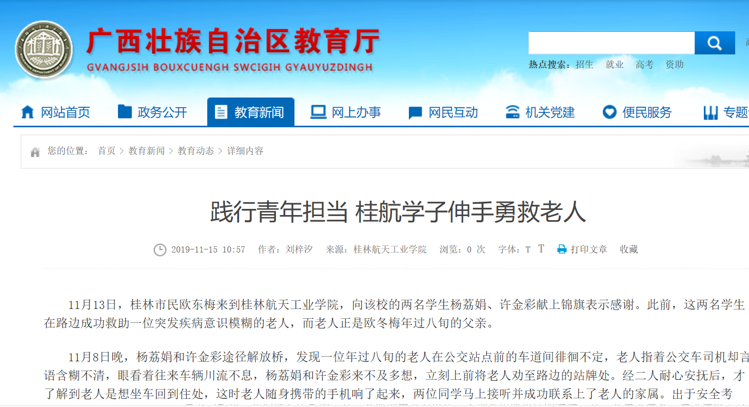2019-11【自治区教育厅】践行青年担当 桂航学子伸手勇救老人