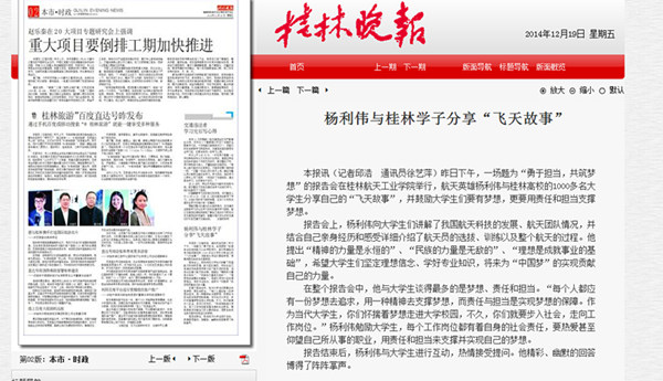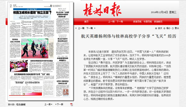 2014-12《桂林日报》:航天英雄杨利伟与桂林高校学子分享“飞天”经历