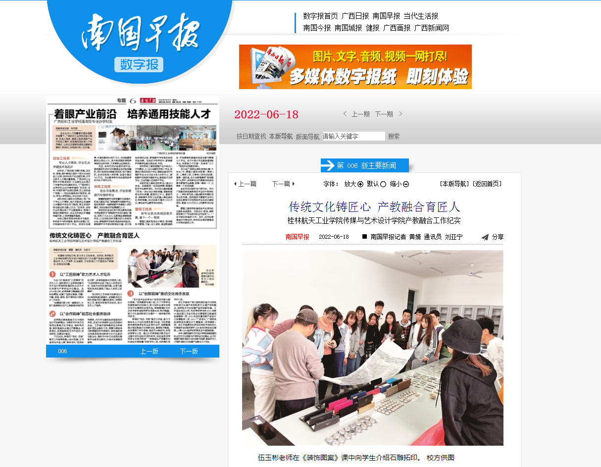 2022-06【南国早报】传统文化铸匠心 产教融合育匠人——桂林航天工业...