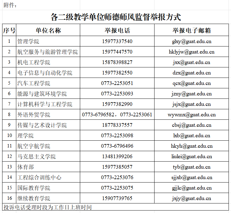 学校师德师风监督举报电话:0773-2253016;举报电子邮箱:jsgzb@guat.edu.cn。各二级教学单位师德师风监督举报方式详见附件,投诉举报请提供具体线索材料。