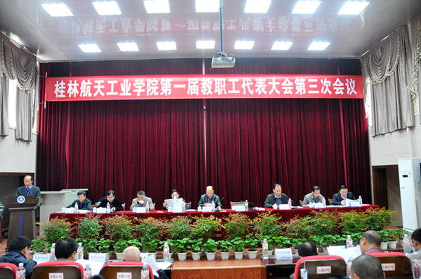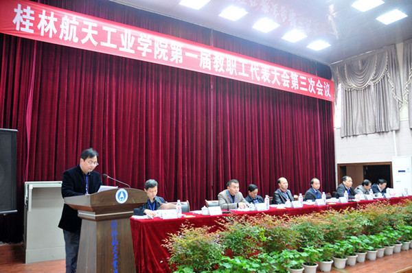 院长易忠在大会上作了工作报告。2014年,学校在师资队伍建设、科学研究、文化传承创新、人才培养等方面都取得了可喜的成绩。2015年,学校将深化改革、激发活力、迎评促建,同心开创转型提质新局面:一是要强化教学工作的中心地位,确保通过学士学位授权评估;二是要完善顶层设计,构建以学校章程为核心的现代大学制度体系;三是要全力推进回归航天进程,力争航天特色建设取得重大进展;四是要全面推进内涵发展,着力提高适应学校发展新常态的能力;五是要落实立德树人根本任务,着力提高学生教育管理水平;六是要协调推进“四个桂航”建设,着力提高校园民生保障能力。其余各项工作,均通过书面报告向代表们进行了说明。
