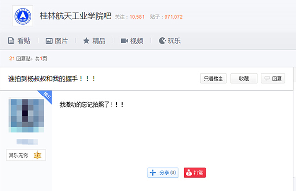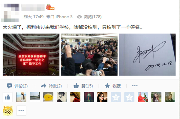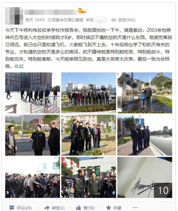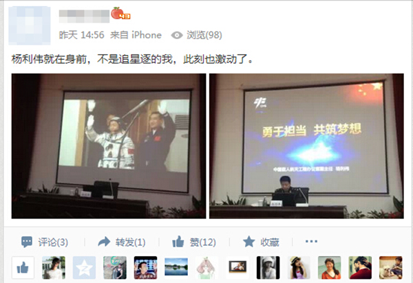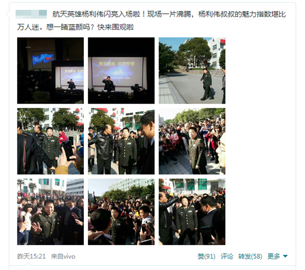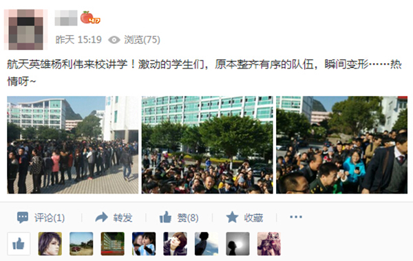 12月18日,“中国飞天第一人”杨利伟将军到访Beat365,在学生中引起的强烈反响,全校近万名师生与杨利伟将军面对面接触,感受到了航天英雄的风采。师生们纷纷通过微博、微信、论坛、QQ等社交媒体表达了内心的激动与喜悦,现收集了部分代表性的信息与大家分享。