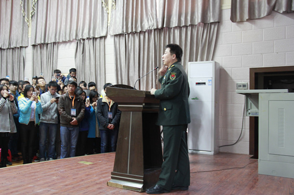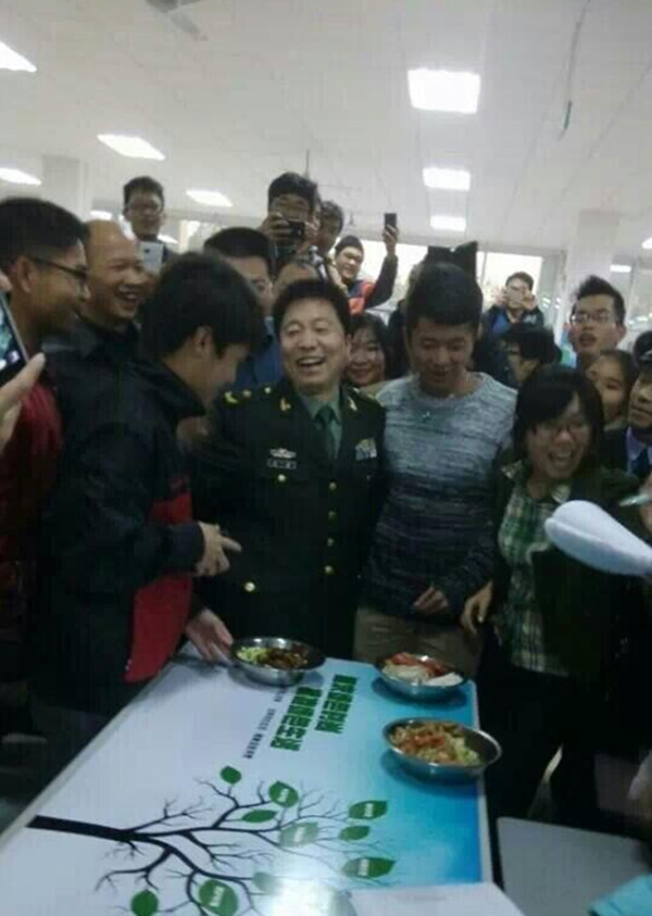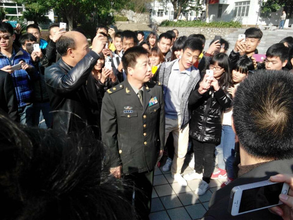 报告会结束后,杨利伟将军来到教学楼前、实训车间、学生公寓、餐厅等亲切看望热情的师生,掀起了一波波欢迎的热潮。实训车间里,身着蓝色服装的学生正翘首等待着,杨将军一出现,大家就按耐不住内心的狂热,拥挤到了一起;在学生公寓,有学生说,“幸福来得太突然了,竟然来了我们宿舍”……