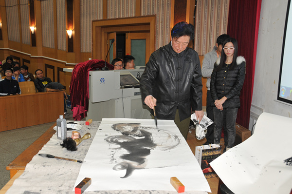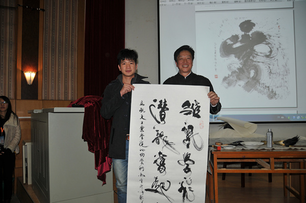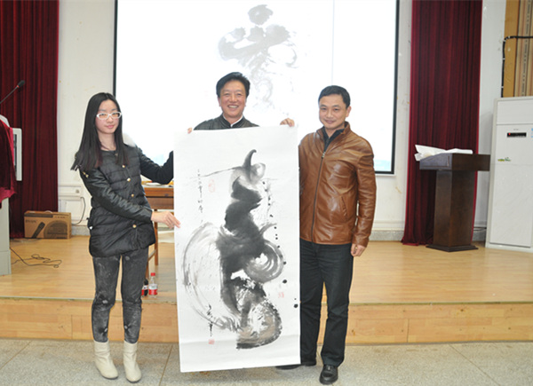 陈沛彬先生结合自己几十年的书法创作实践,介绍了中国书法创作的起源、流变,分析了中国书法艺术深厚的文化底蕴,高度肯定了书法艺术在中华民族传统文化中所占有的重要地位。同时,他还结合自己的作品,为大家展示了他潜心研究多年的四种书法创意——“甲骨印象”、“破笔书法”、“沛彬一笔”、“人体书法”,他为大家详细讲述了自己创作艺术作品的心路历程,他说,书法创作代表了艺术与感悟的升华,创作者在创造的过程中要学会呼唤远古,放眼未来,用心用笔去整合,才能创造出好的作品。