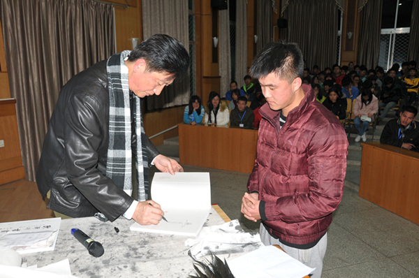 陈沛彬先生还指出,要写好书法,必须在人品、功力和学养三个方面下苦功夫,为此,他告诫同学们要养成高尚的品格,多揣摩、多练习,同时要多读书、广读书,转益多师,开拓眼界,丰富知识,汲取养分。