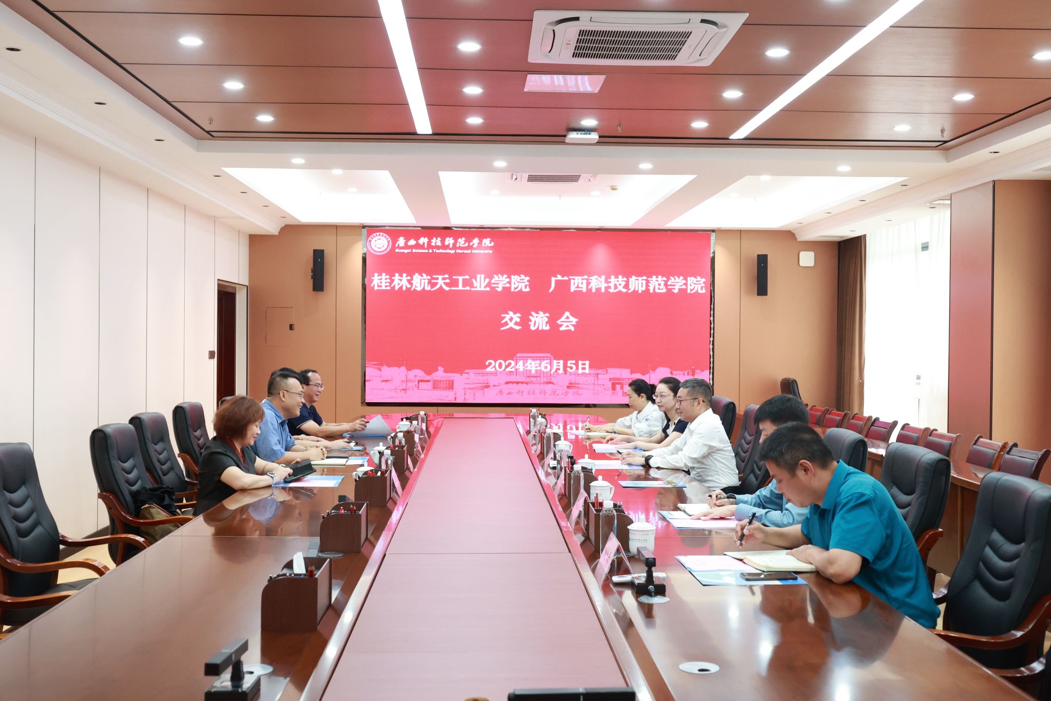 6月5日,校长吴尽昭一行赴广西科技师范学院调研交流,党校办、财务处、基建处负责人参加调研。广西科技师范学院党委书记杨杰、纪委书记莫碧珍热情接待了吴尽昭一行。