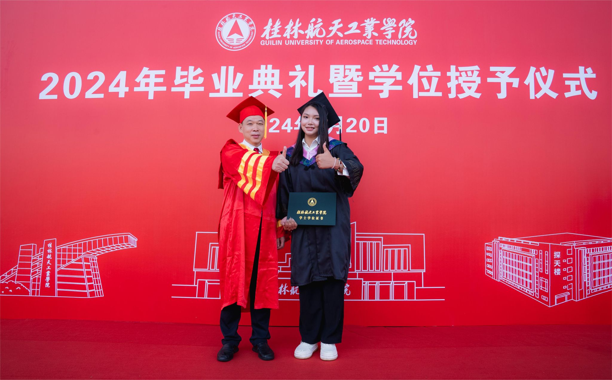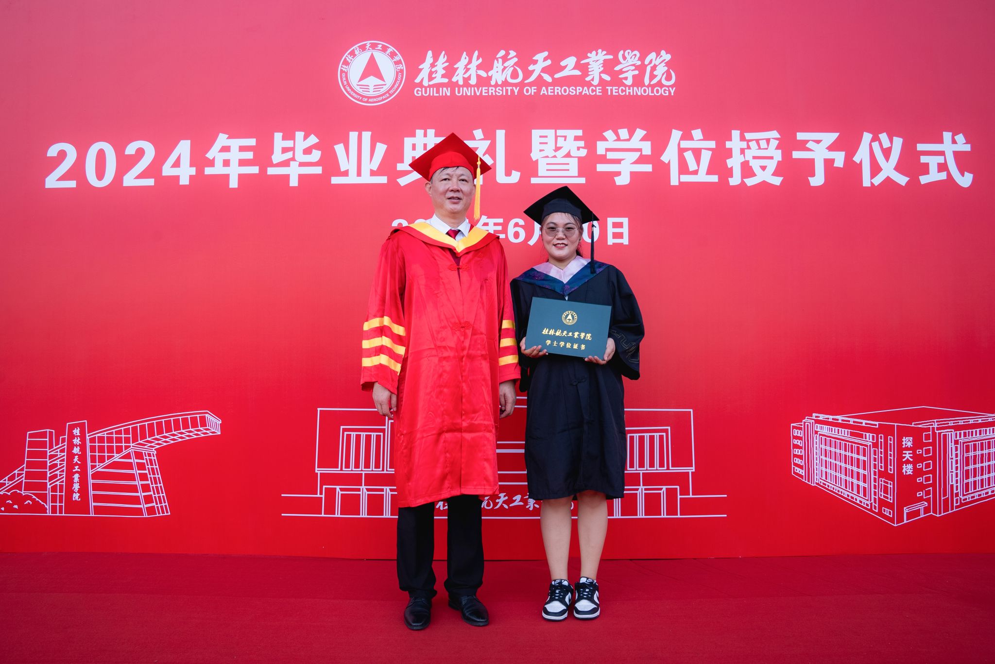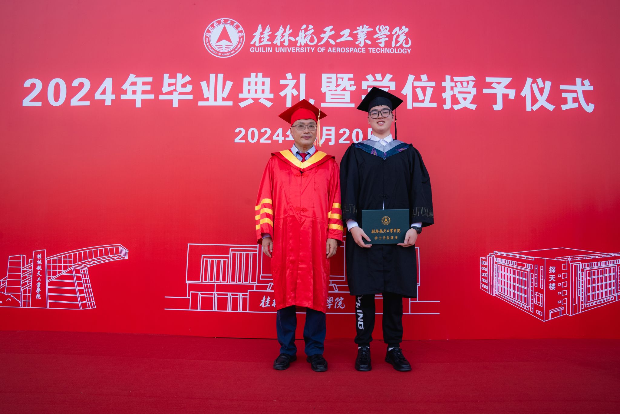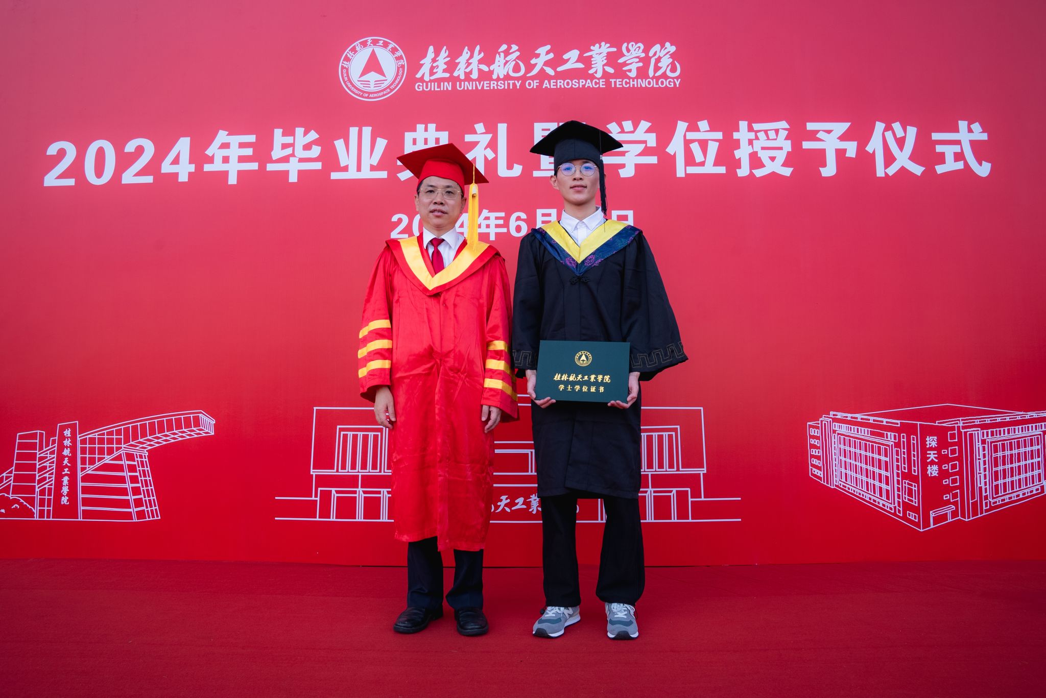 校长吴尽昭发表了题为《保持本真,臻于至善》的致辞。他说,大家在桂航求学的日子里,我们留下了与祖国同行、与时代共进的记忆。我们一同亲历祖国极不平凡的新成就,一同见证并参与了学校的快速发展,也一同完成了个人成长的新跨越。当下,面对纷繁复杂的世界,消费主义和泛娱乐化盛行,人们容易迷失方向,忘记自己内心的真实需求。如何在这个时代安身立命、建功立业,创造出一番成绩?临别之际,他把“保持本真,臻于至善”八个字送给全体毕业生。一是要永葆纯真。曾国藩有云:“天下惟忘机可以消众机,惟懵懂可以祓不祥。”希望大家在未来能够坚守初心的本真,知行合一,说真话、干实事、下硬功,不摆“花架子”,不做“两面人”,实事求是、善始善终。二是要自信自立。希望大家在面对困难和质疑时,做一名自信的舵手,紧握生命的罗盘,以自信的姿态、自立的决心、自强不息的意志,向着心中的光辉彼岸坚定航行。三是要终身学习。希望大家毕业后在社会的大学里继续学习,掌握真才实学,增益其所不能,腹有诗书气自华,要让终身学习成为扬帆远航的动力,让增长本领成为青春搏击的能量。四是要坚守底线。希望大家常怀敬畏之心,堂堂正正做人、光明磊落做事,以云淡风轻面对得与失,以平静温和面对质疑与嘲笑,做到“有守”和“有为”有机统一。纯真使人真诚,自信使人笃定,学习使人明辨,底线使人坦荡,四者合一,方能做到“保持本真,臻于至善”。希望毕业生能够继续弘扬“艰苦奋斗,自强日新”的桂航精神,笃定“保持本真,臻于至善”的态度和行动,在全面建设社会主义现代化国家的新篇章中,在实现中华民族伟大复兴的中国梦中写下浓墨重彩的一笔!