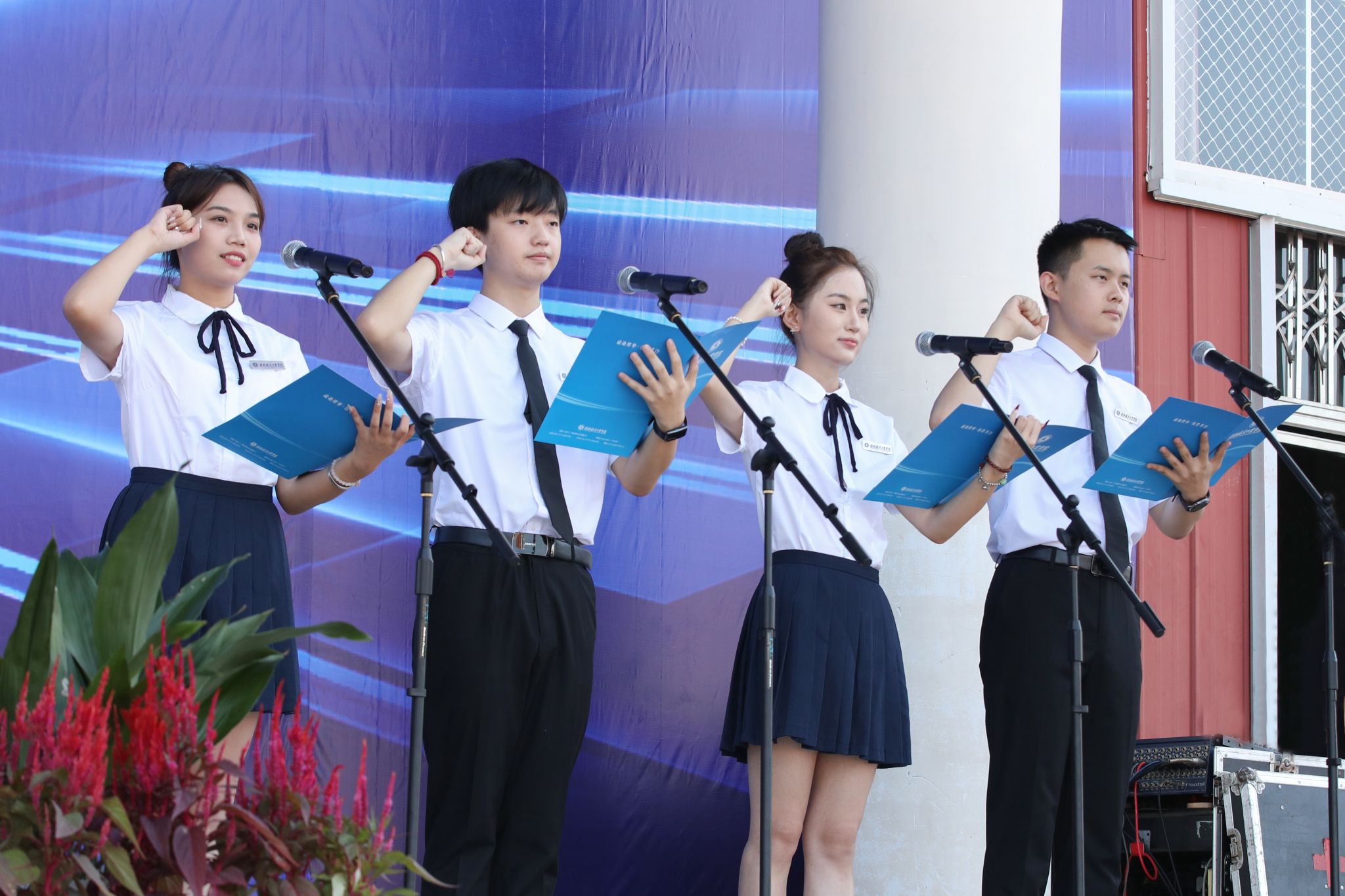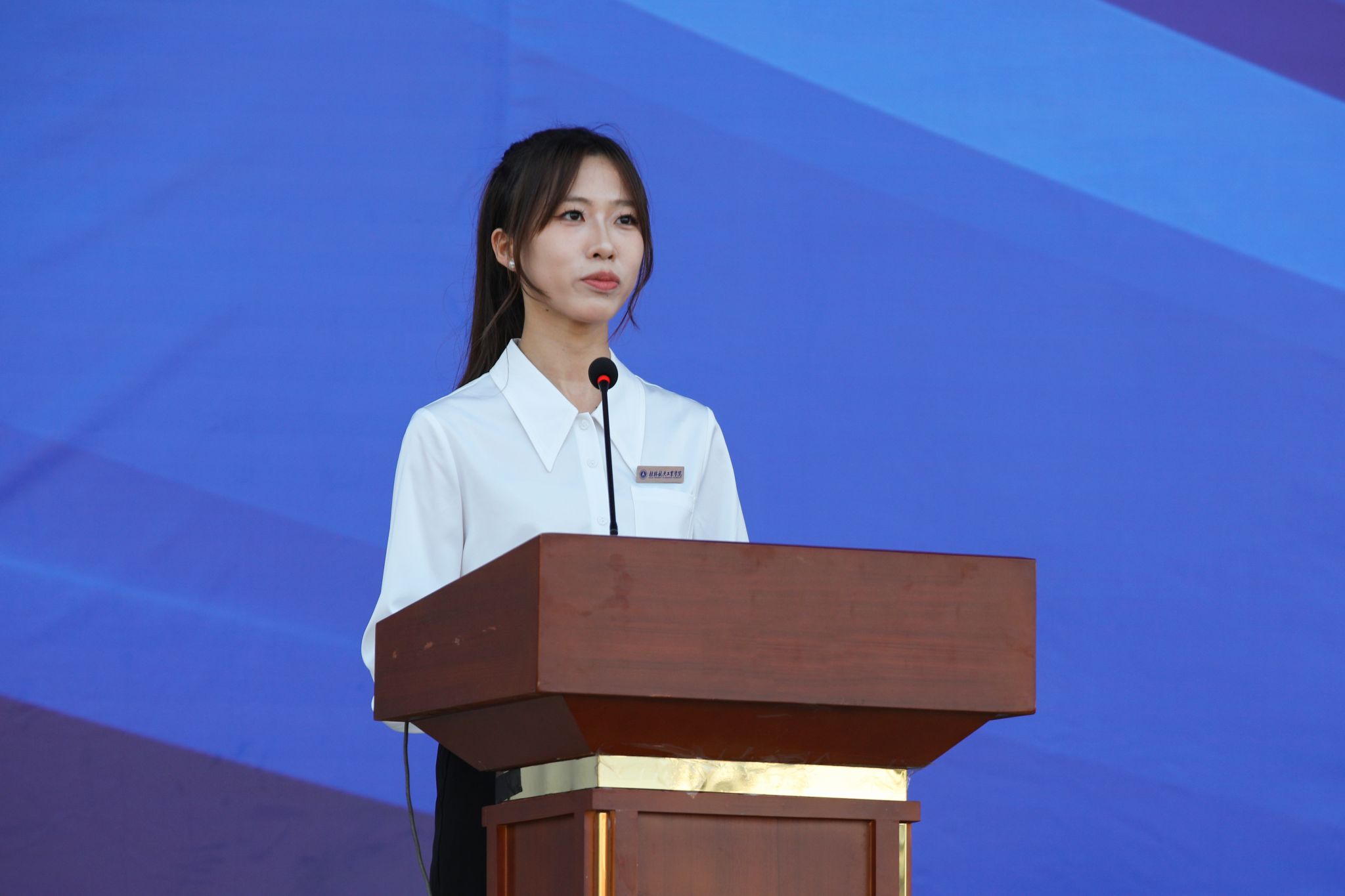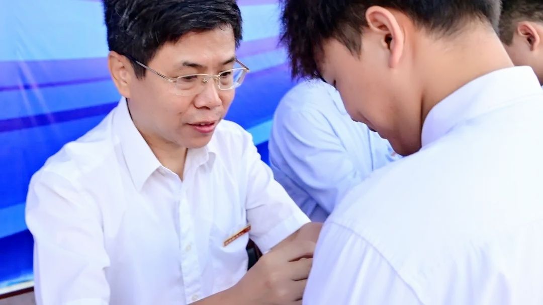典礼上,全体校领导为2024级新生代表佩戴校徽。