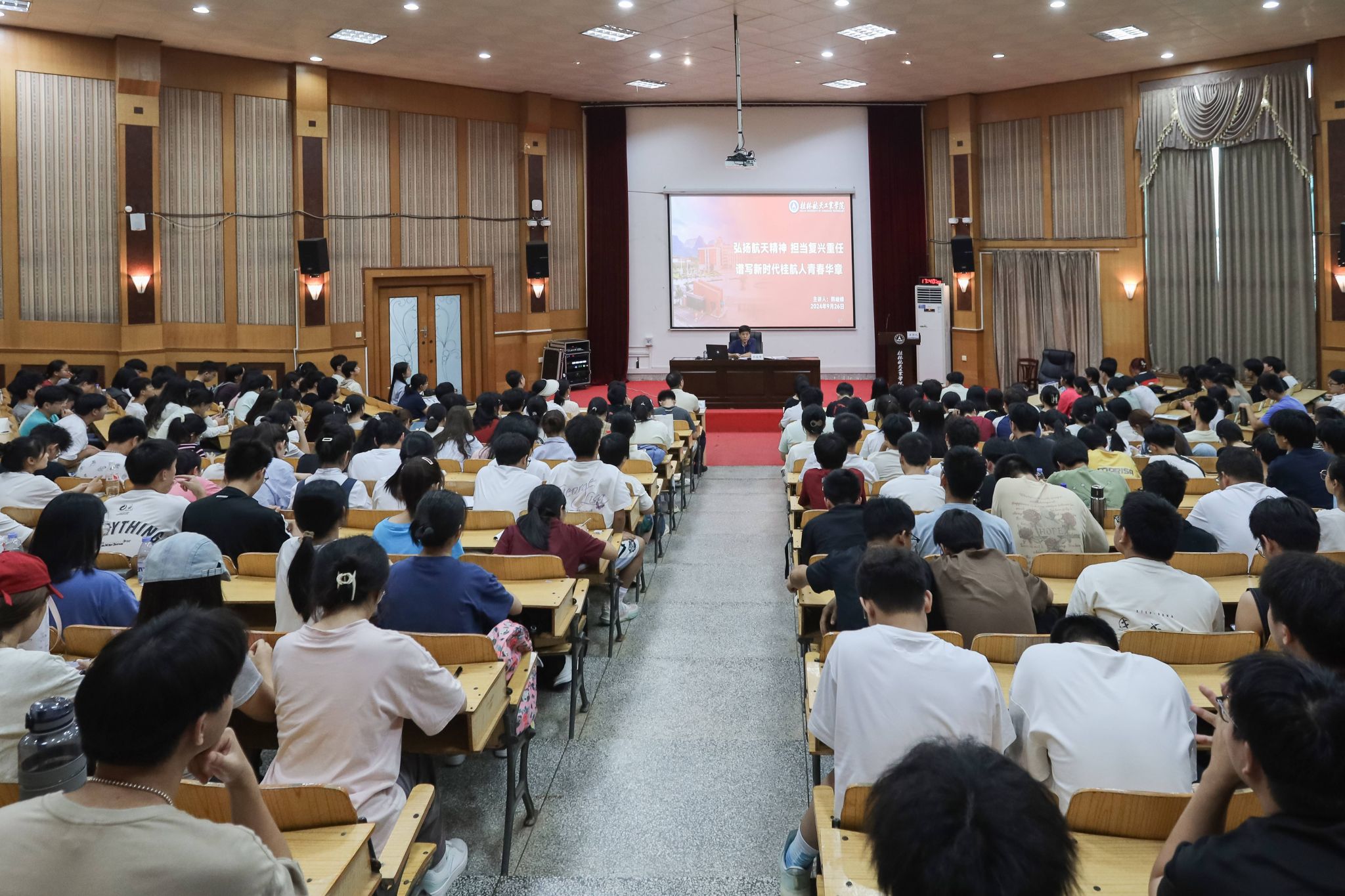 韩峻峰结合中国共产党人精神谱系当中的航天精神、学校45年的发展历史、学校航天文化育人特色、优秀教师代表以及党的二十届三中全会精神,从“回顾历史成就,感悟航天精神”“赓续历史文脉,传承航天精神”“秉承航天精神,书写青春华章”3个方面为新生讲授“开学第一课”。