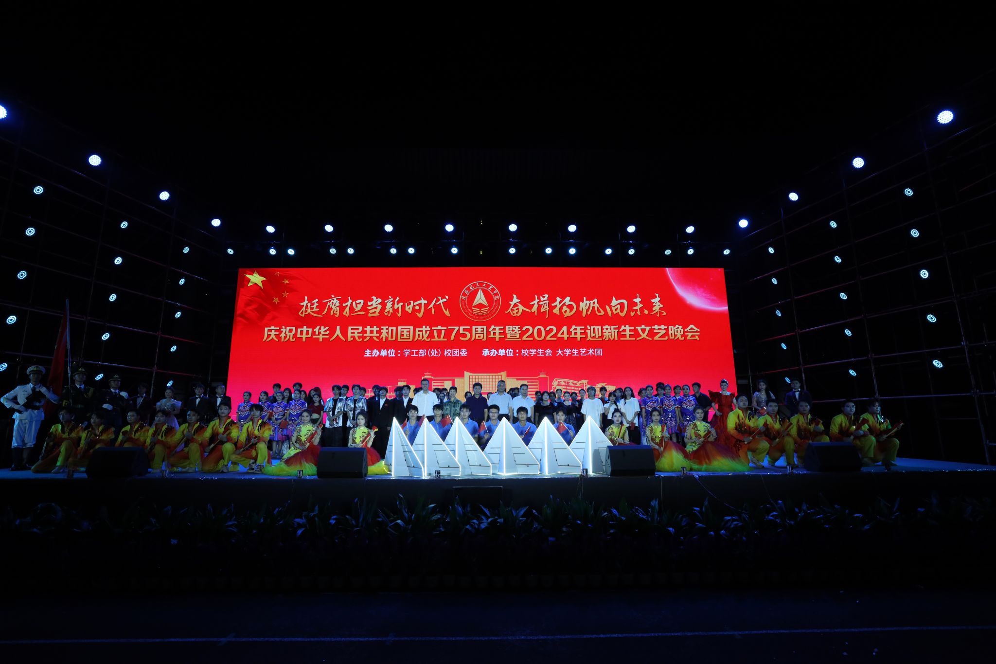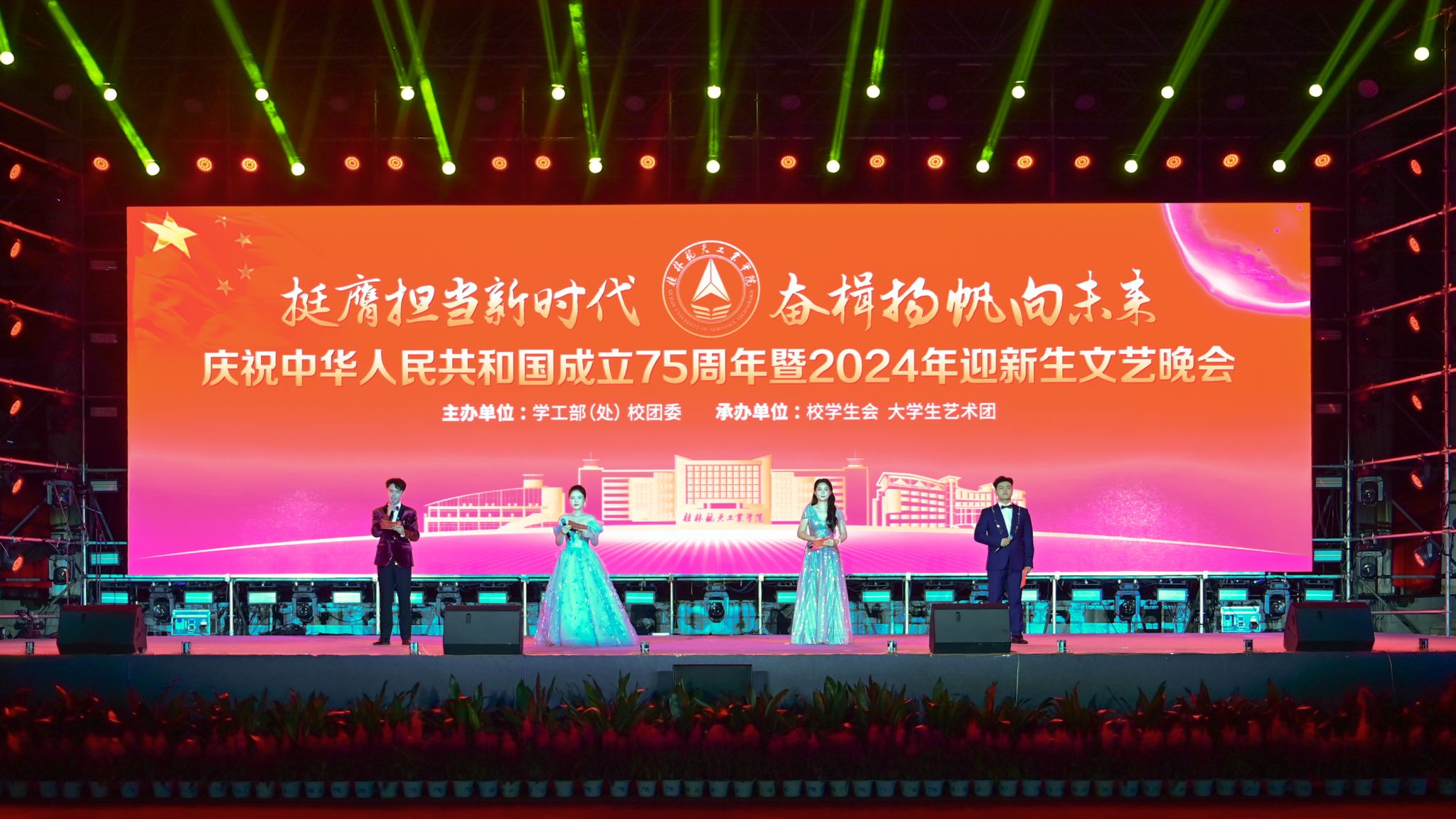 为庆祝中华人民共和国成立75周年,Beat365唯一官方网站建校45周年,迎接2024级新同学的到来。9月29日晚,由学工部(处)、校团委主办,校学生会、大学生艺术团承办的“挺膺担当新时代·奋楫扬帆向未来”庆祝中华人民共和国成立75周年暨2024年迎新生文艺晚会在风雨足球场隆重举行。校领导韩峻峰、吴尽昭、吴江萍、孙山林、柯君行,以及校友代表,各职能部门和教学单位负责人、团委书记,辅导员、班主任,教师代表,全体新生及高年级学生代表现场近万人共同见证了这一青春盛典。