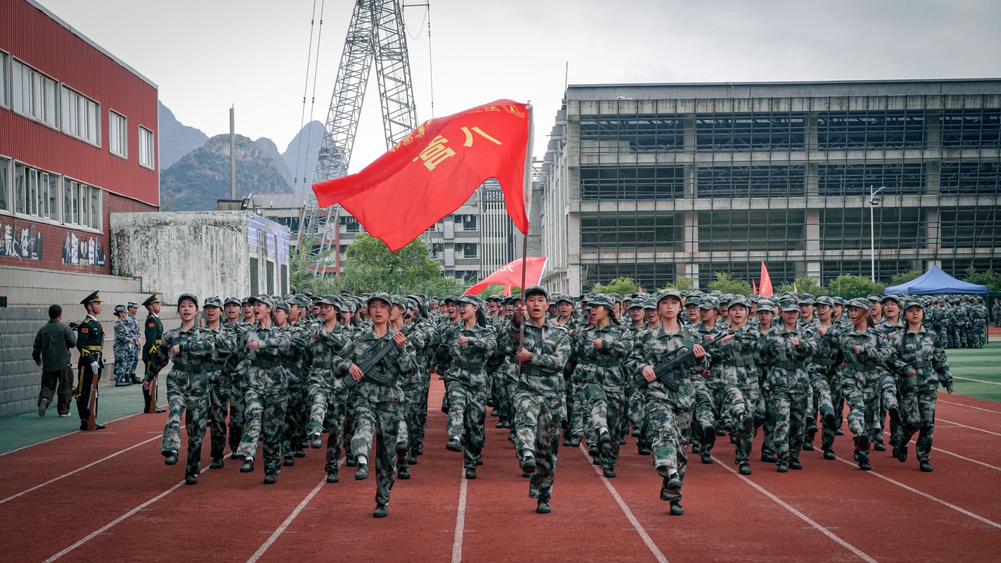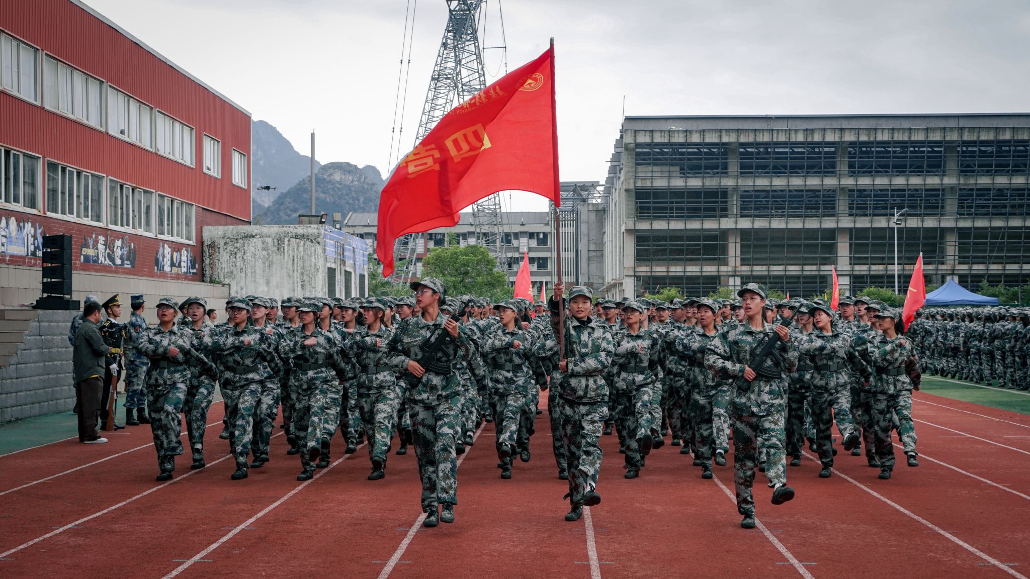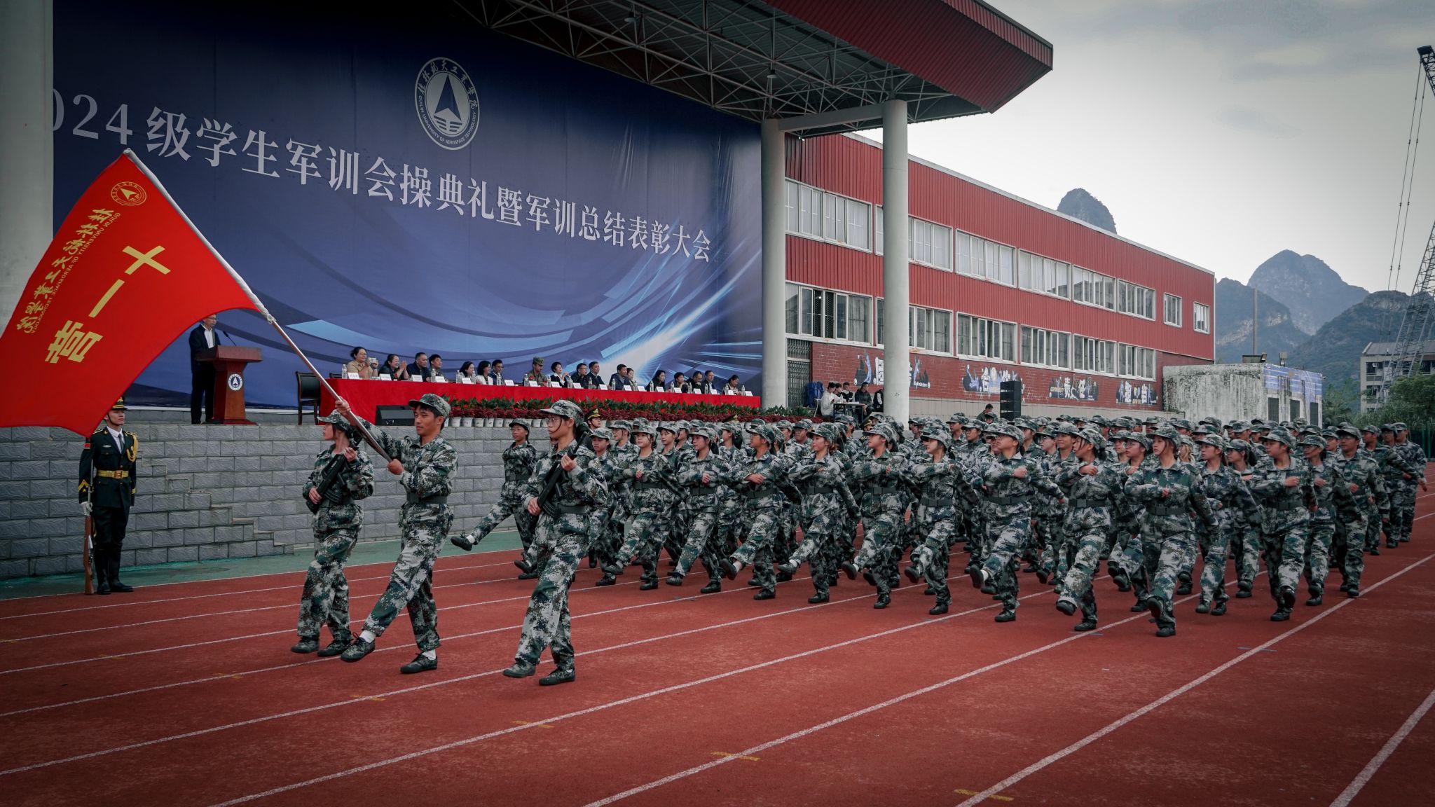 在雄壮的国歌声中,2024级学生军训会操典礼正式拉开帷幕。伴随着分列式进行曲的铿锵节奏,分列式展演正式开始。十一个分列式方阵喊着嘹亮的口号依次通过主席台,他们步伐坚定,身姿挺拔,目光坚毅,精神抖擞,展现着青春活力与拼搏精神。