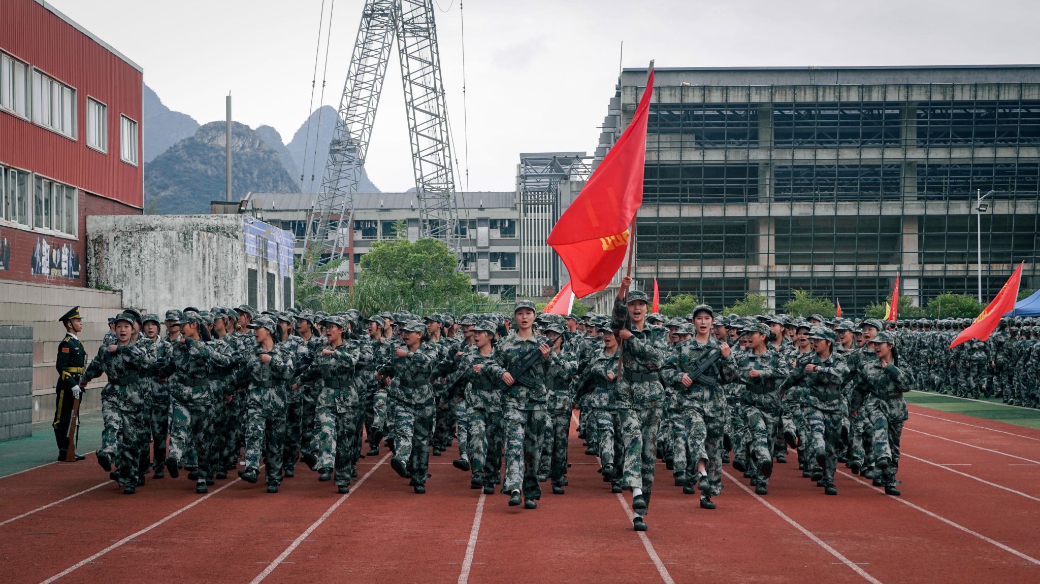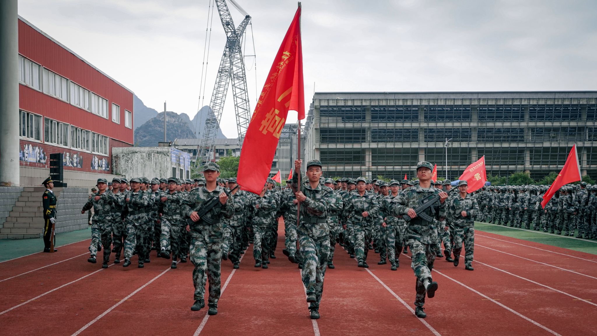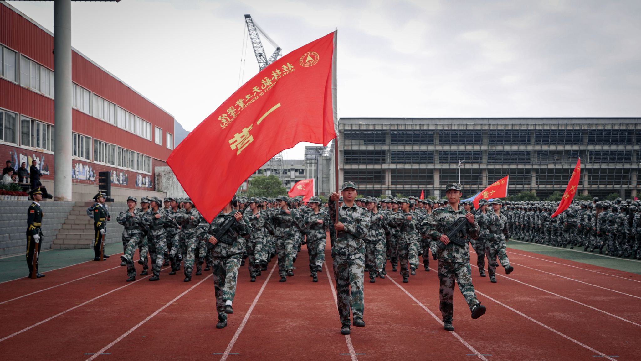 在雄壮的国歌声中,2024级学生军训会操典礼正式拉开帷幕。伴随着分列式进行曲的铿锵节奏,分列式展演正式开始。十一个分列式方阵喊着嘹亮的口号依次通过主席台,他们步伐坚定,身姿挺拔,目光坚毅,精神抖擞,展现着青春活力与拼搏精神。