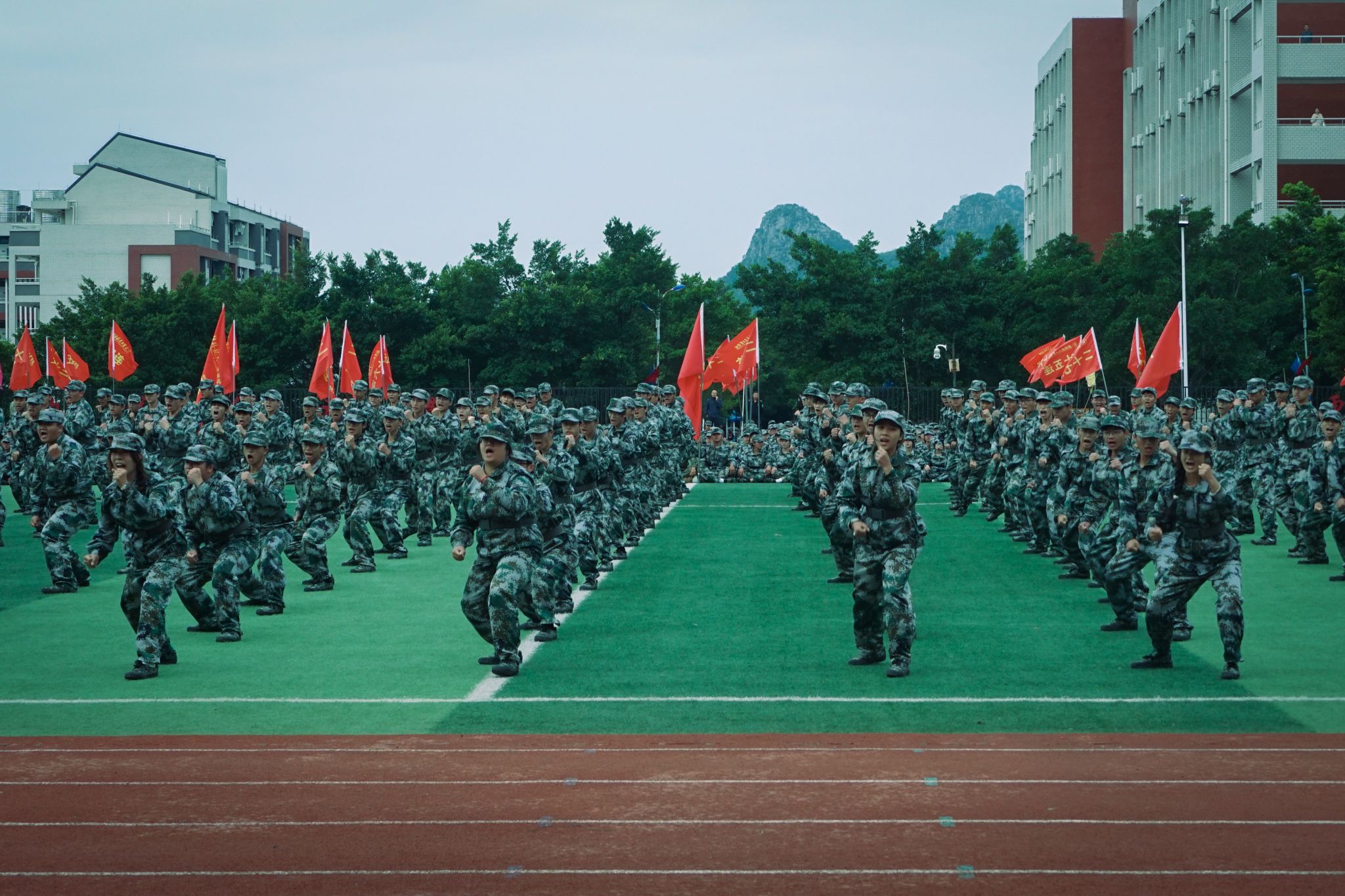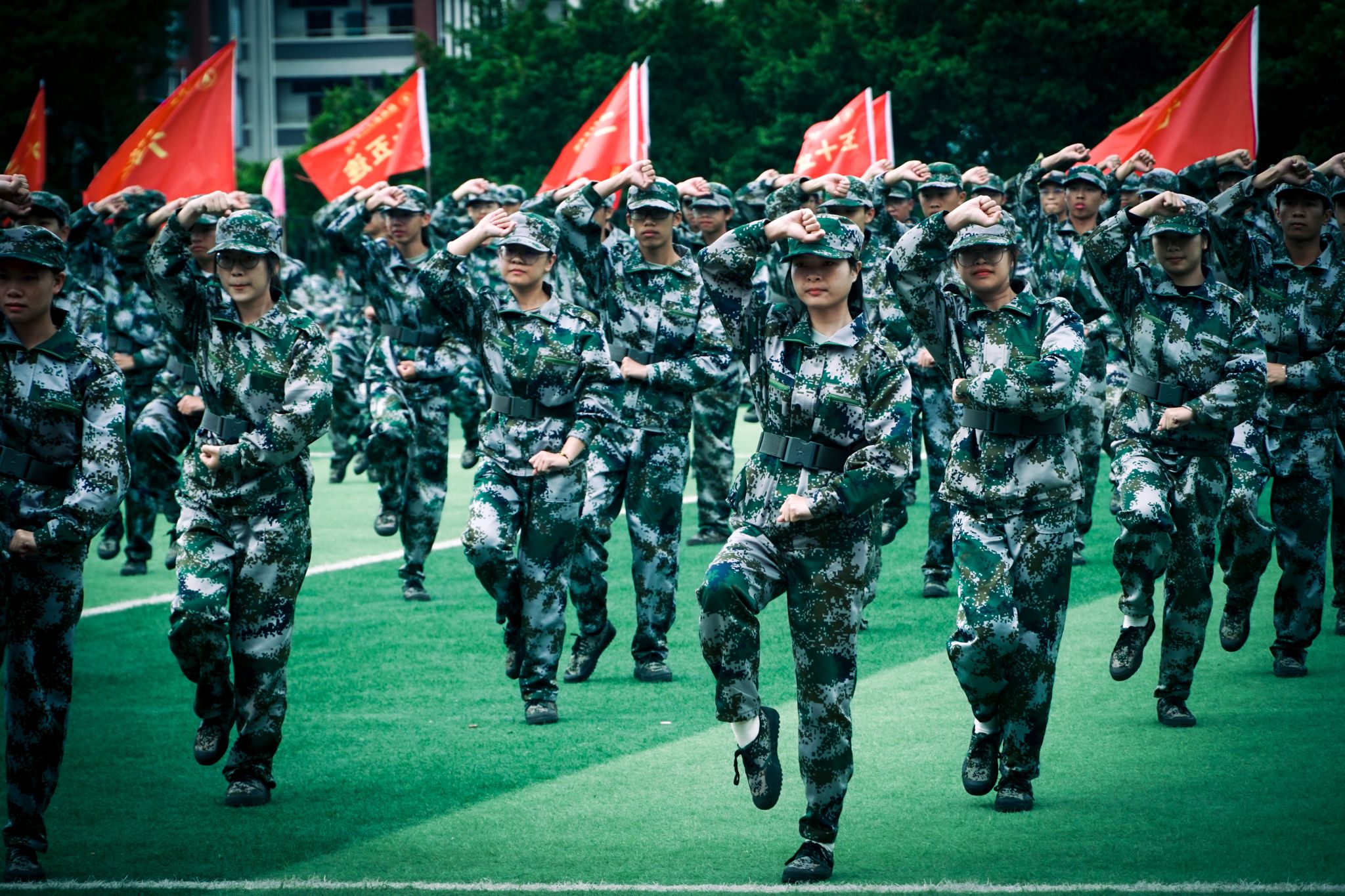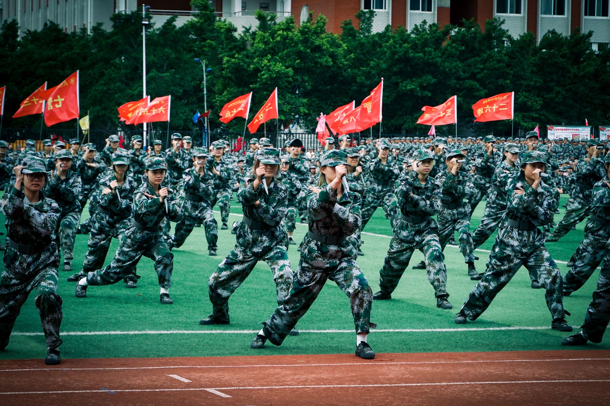分列式后,五个方队依次进行了军体拳、匕首操、捕俘拳、擒敌拳、战术展示等汇报表演,同学们动作整齐刚劲,眼神坚定果敢,战术配合紧密,每一个动作都凝聚着汗水与拼搏,每一次呐喊都彰显着勇气与信念,同学们用饱满的热情和昂扬的斗志展示了丰硕的军训成果。他们的精彩表现赢得了现场师生们热烈的掌声。