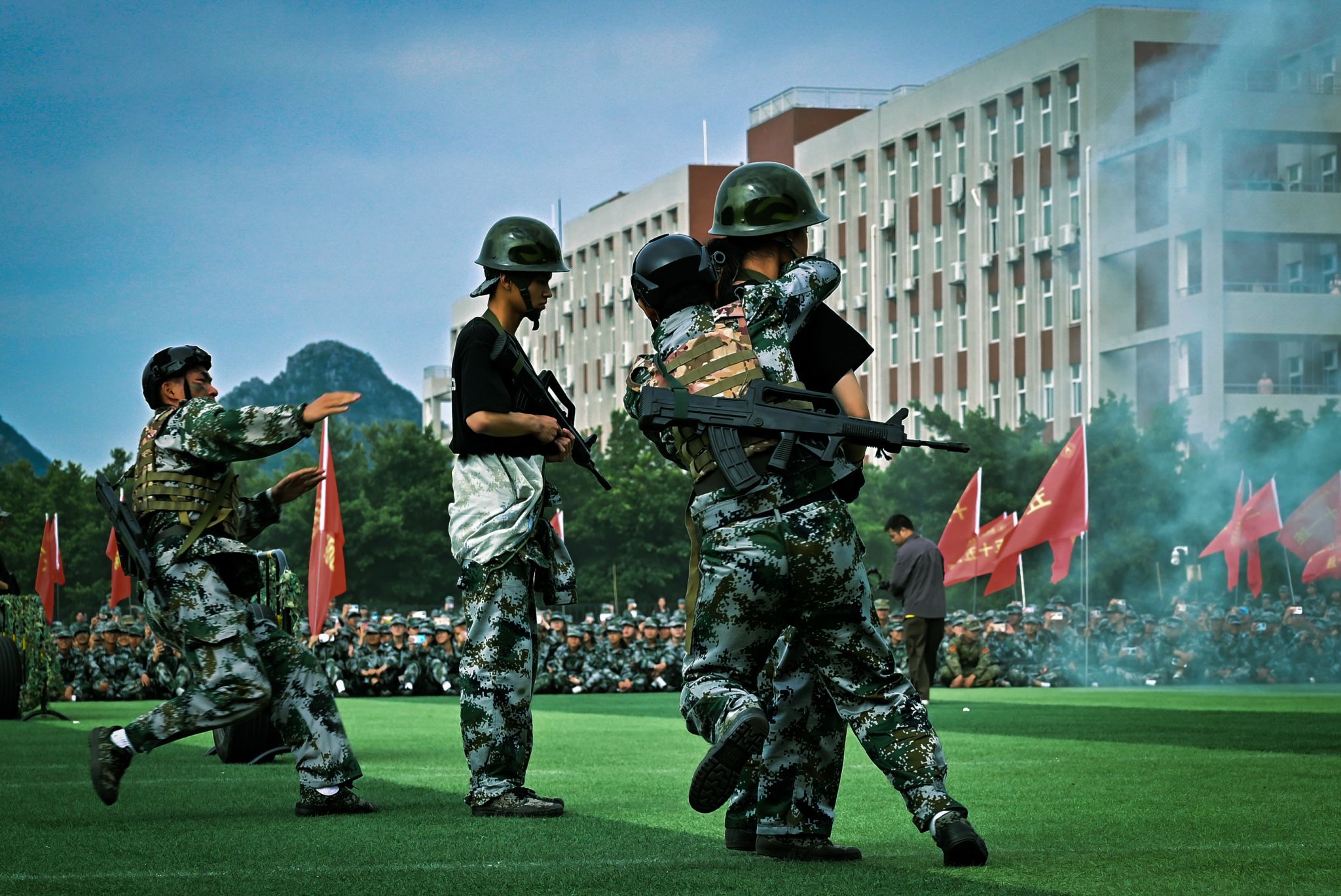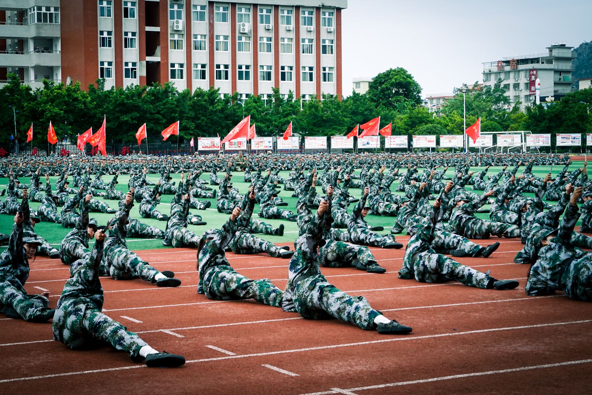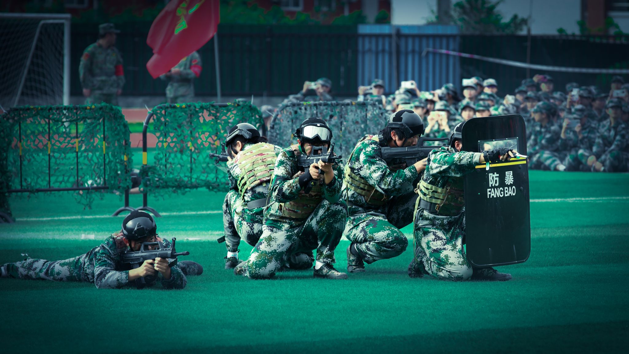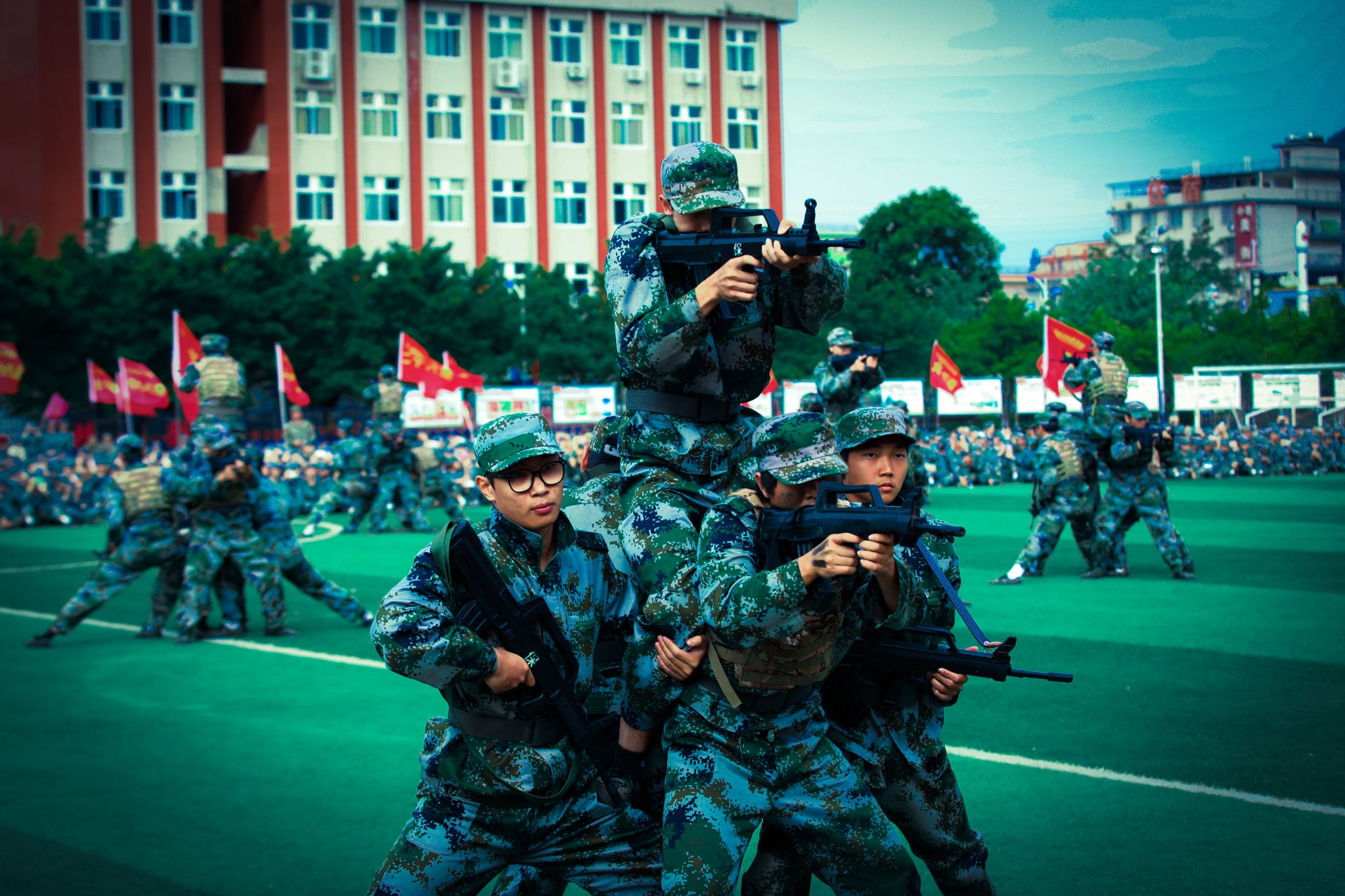 分列式后,五个方队依次进行了军体拳、匕首操、捕俘拳、擒敌拳、战术展示等汇报表演,同学们动作整齐刚劲,眼神坚定果敢,战术配合紧密,每一个动作都凝聚着汗水与拼搏,每一次呐喊都彰显着勇气与信念,同学们用饱满的热情和昂扬的斗志展示了丰硕的军训成果。他们的精彩表现赢得了现场师生们热烈的掌声。