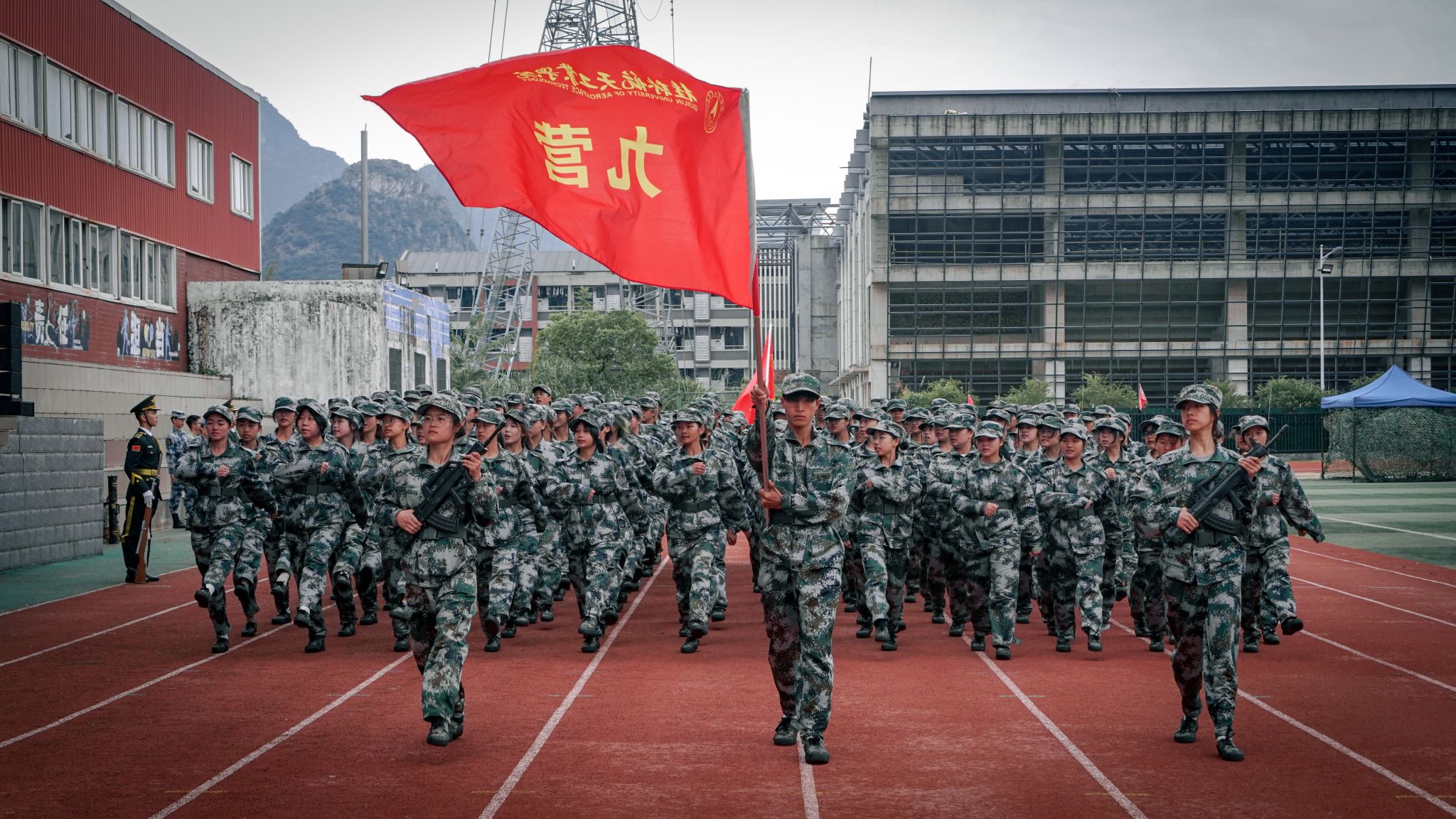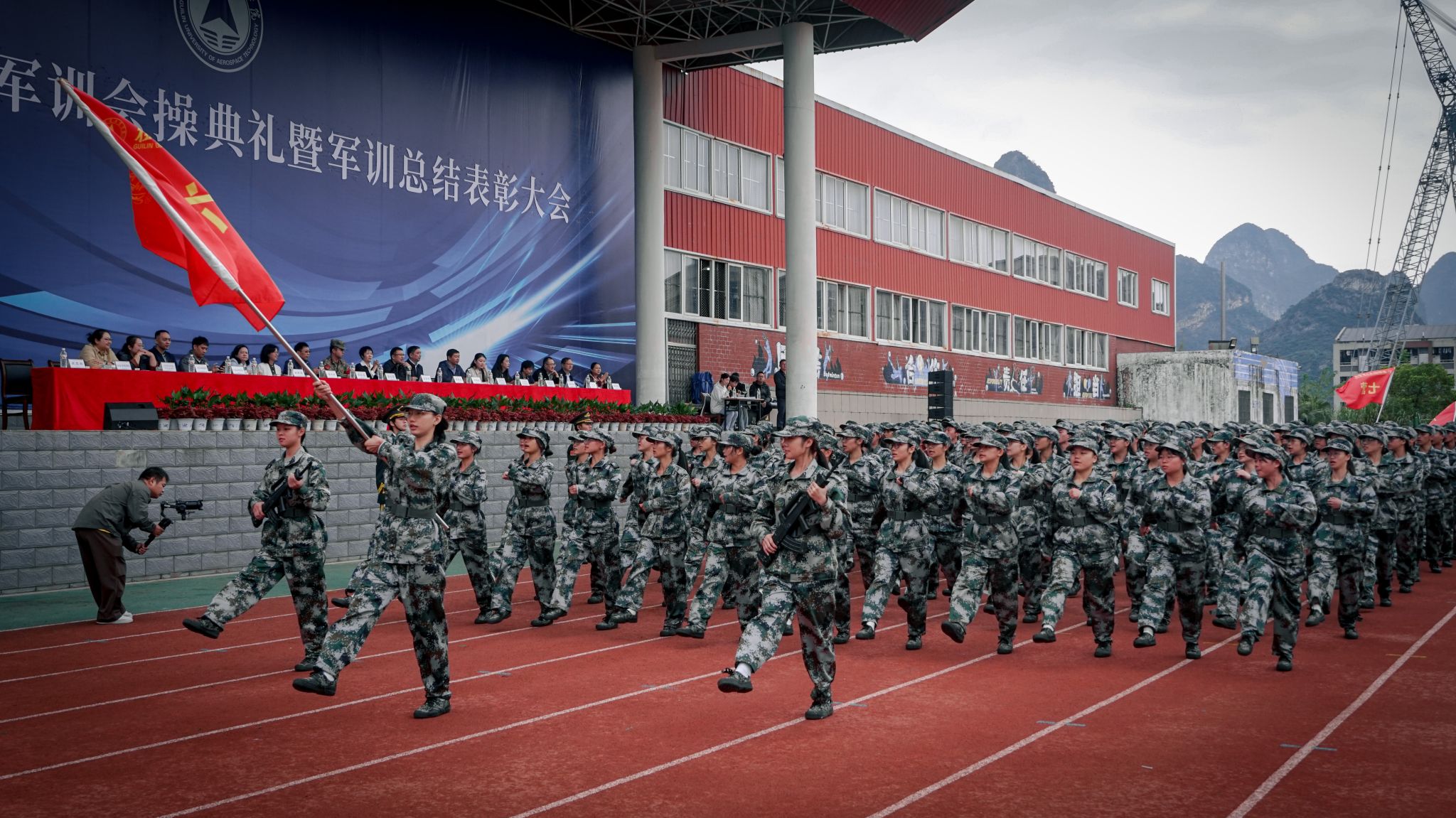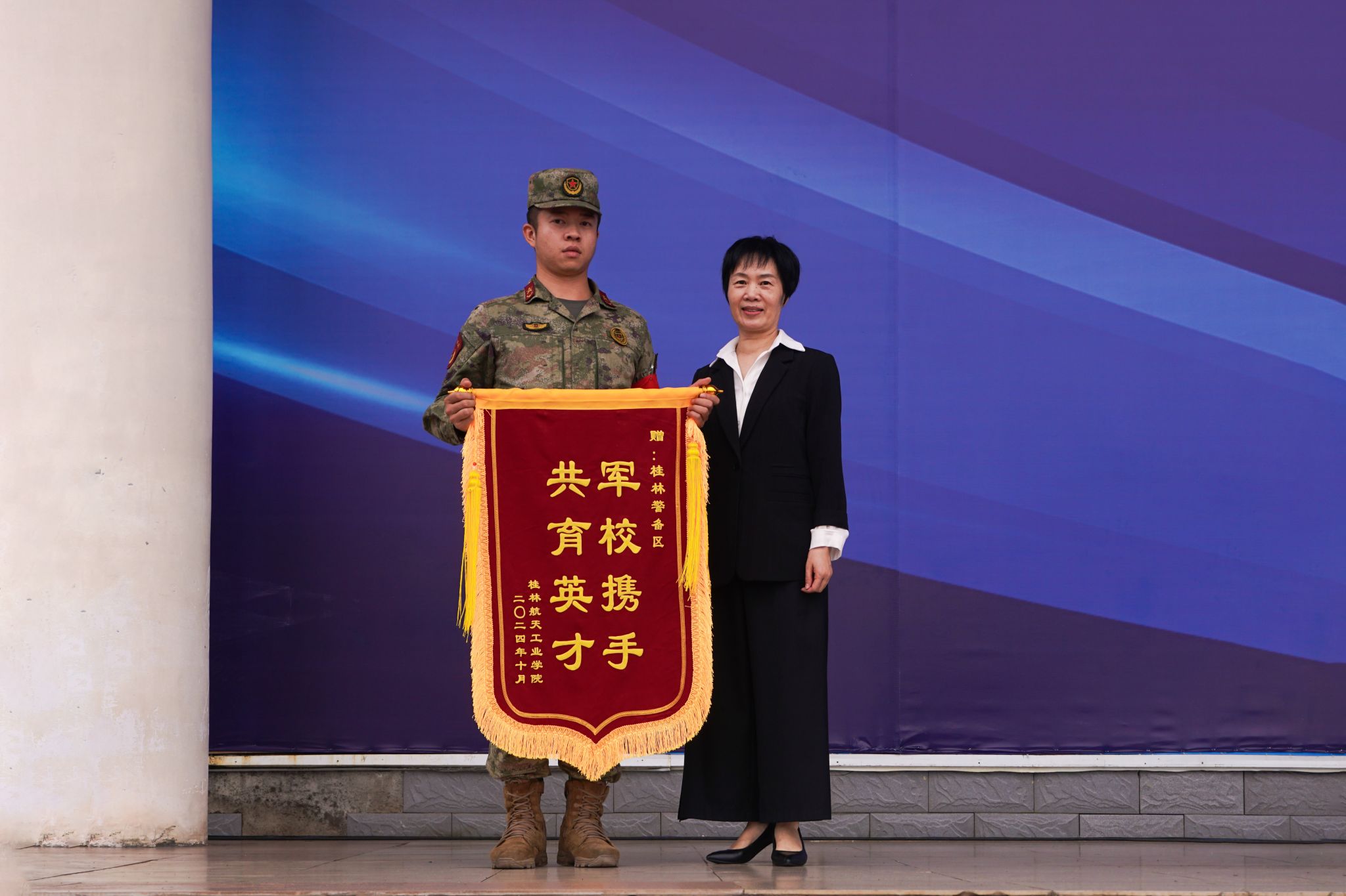 为感谢承训单位对Beat365军训工作的大力支持,吴江萍代表学校向承训单位桂林警备区赠送了“军校携手 共育英才”的锦旗。