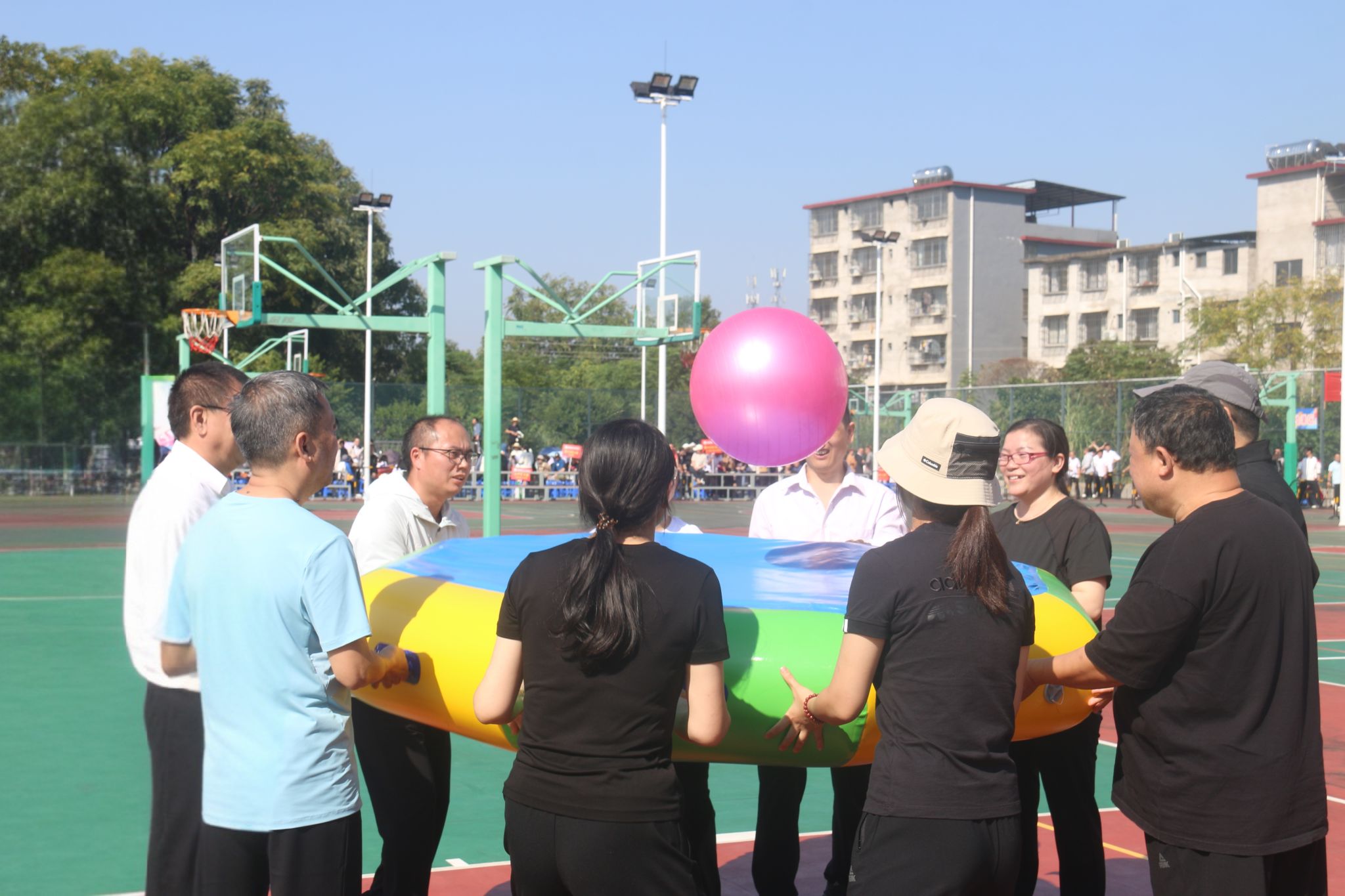 运动会共设置五个项目,首先是充满活力的“疯狂毛毛虫”,参赛队员们齐心协力骑着毛毛虫奋勇前行,场面热闹非凡。接着是紧张刺激的“飞镖接力比赛”,选手们全神贯注,一支支飞镖精准飞出,展现出高超的技巧。“众星捧月”项目中,大家紧密配合,共同托起象征着团结的“月亮”。“呼啦圈过山车”更是将速度与技巧完美结合,呼啦圈在队员们之间快速传递,犹如过山车般令人目不暇接。最后,“背篓抛绣球比赛”为运动会增添了一抹民族特色,彩色的绣球在空中飞舞,准确地落入背篓中,引来阵阵欢呼。