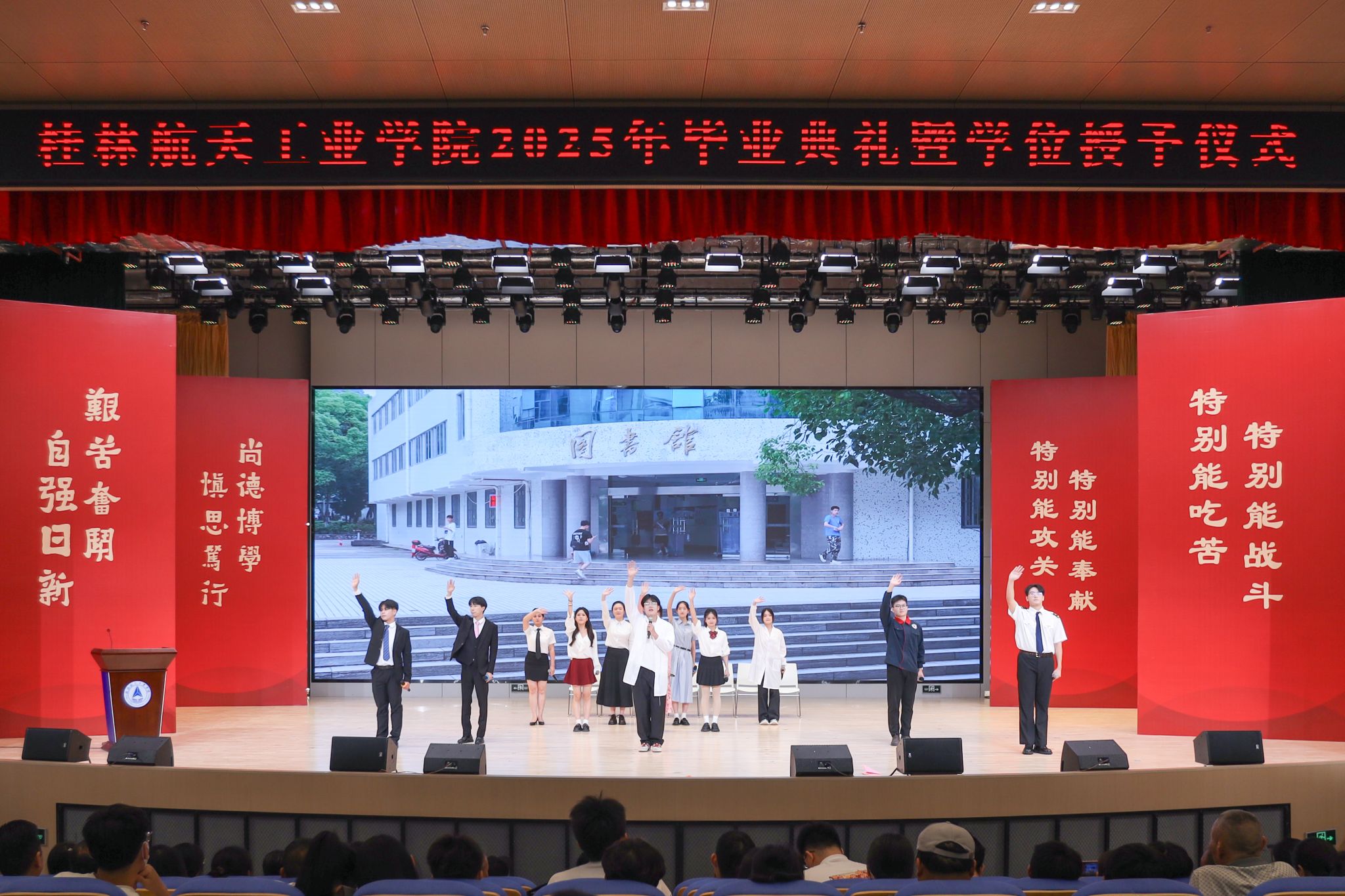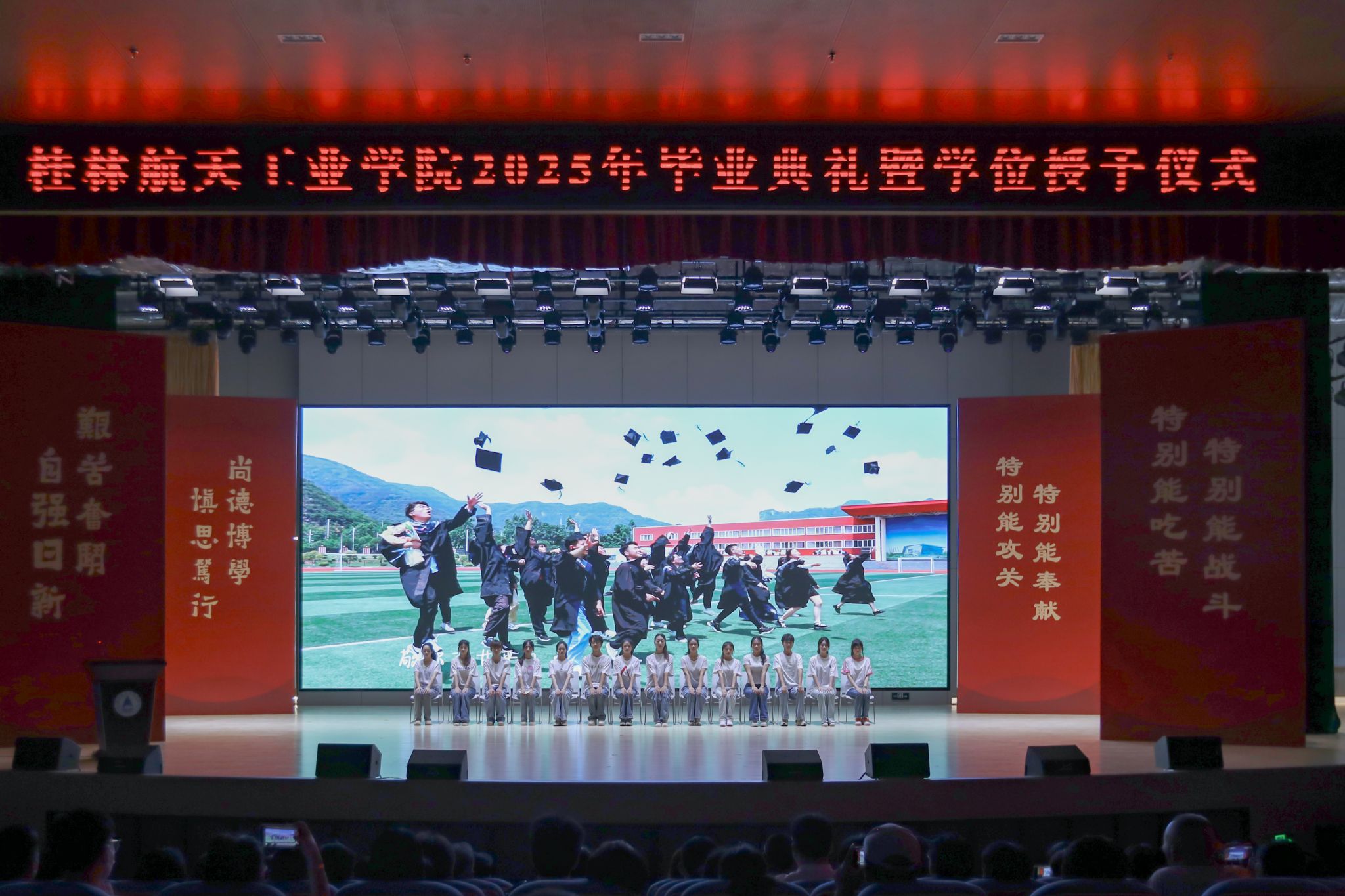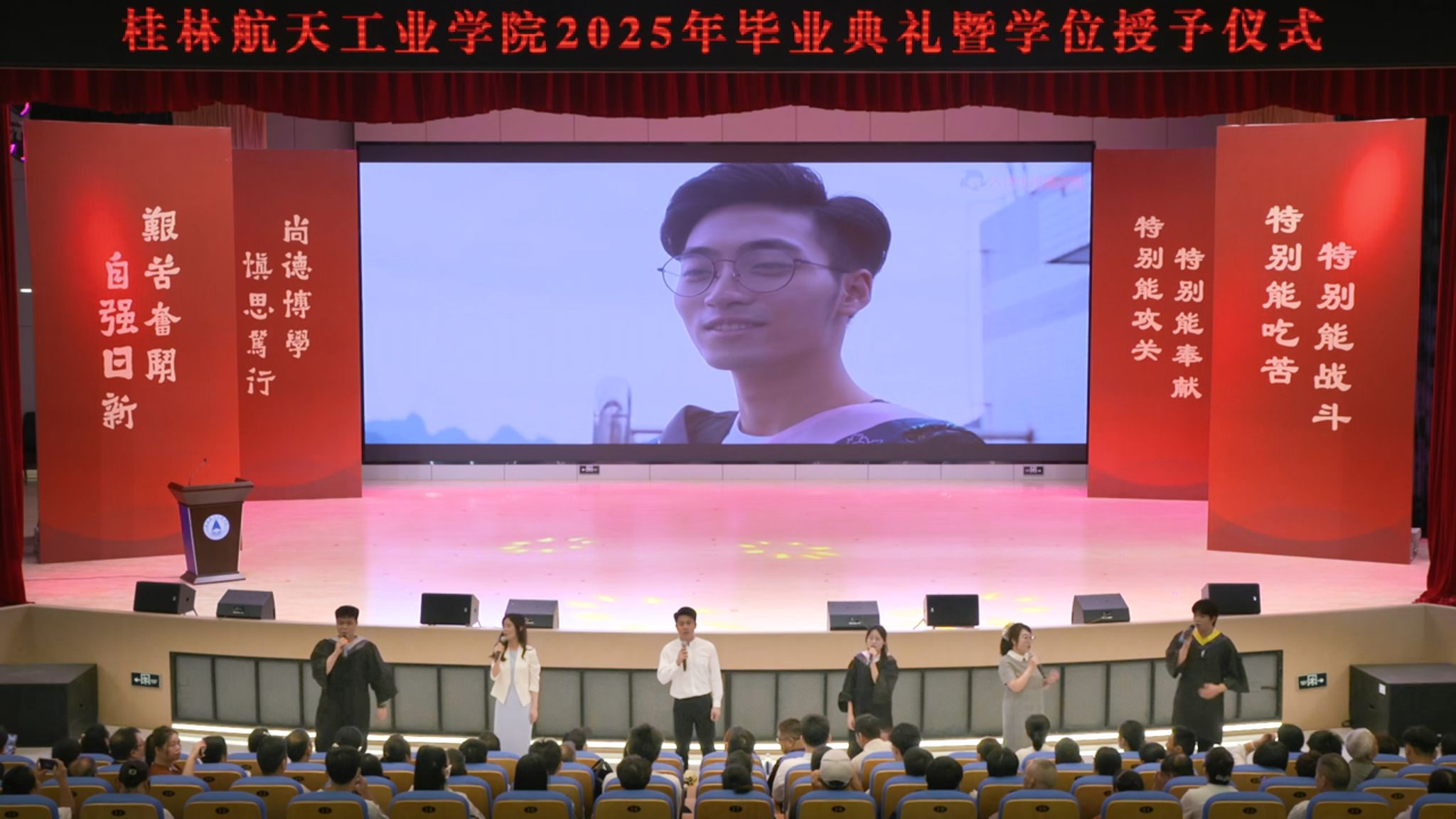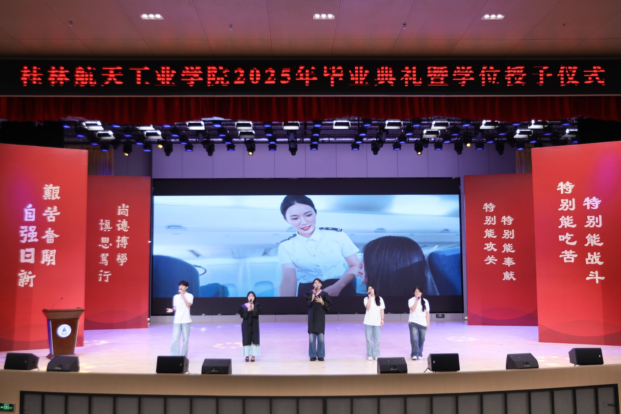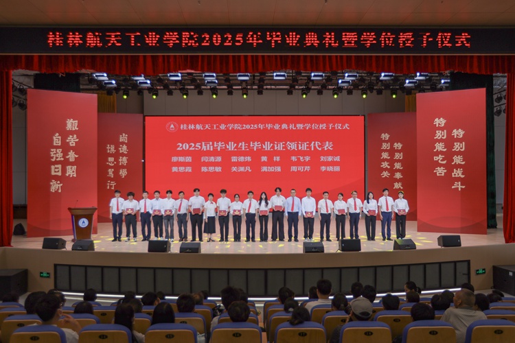 典礼上,精彩的情景剧《在盛夏告别》和朗诵《航天精神·桂航星辰》,展现了桂航学子的青春风采和航天精神。在感恩环节中,毕业生代表向专任教师、辅导员、教学秘书、实验室管理员、宿舍管理员、安全保卫员等校园各岗位工作人员献花,感谢他们多年来的默默坚守与无私奉献。四位教师带来歌曲《故事的最终》,以歌声表达不舍与祝福。