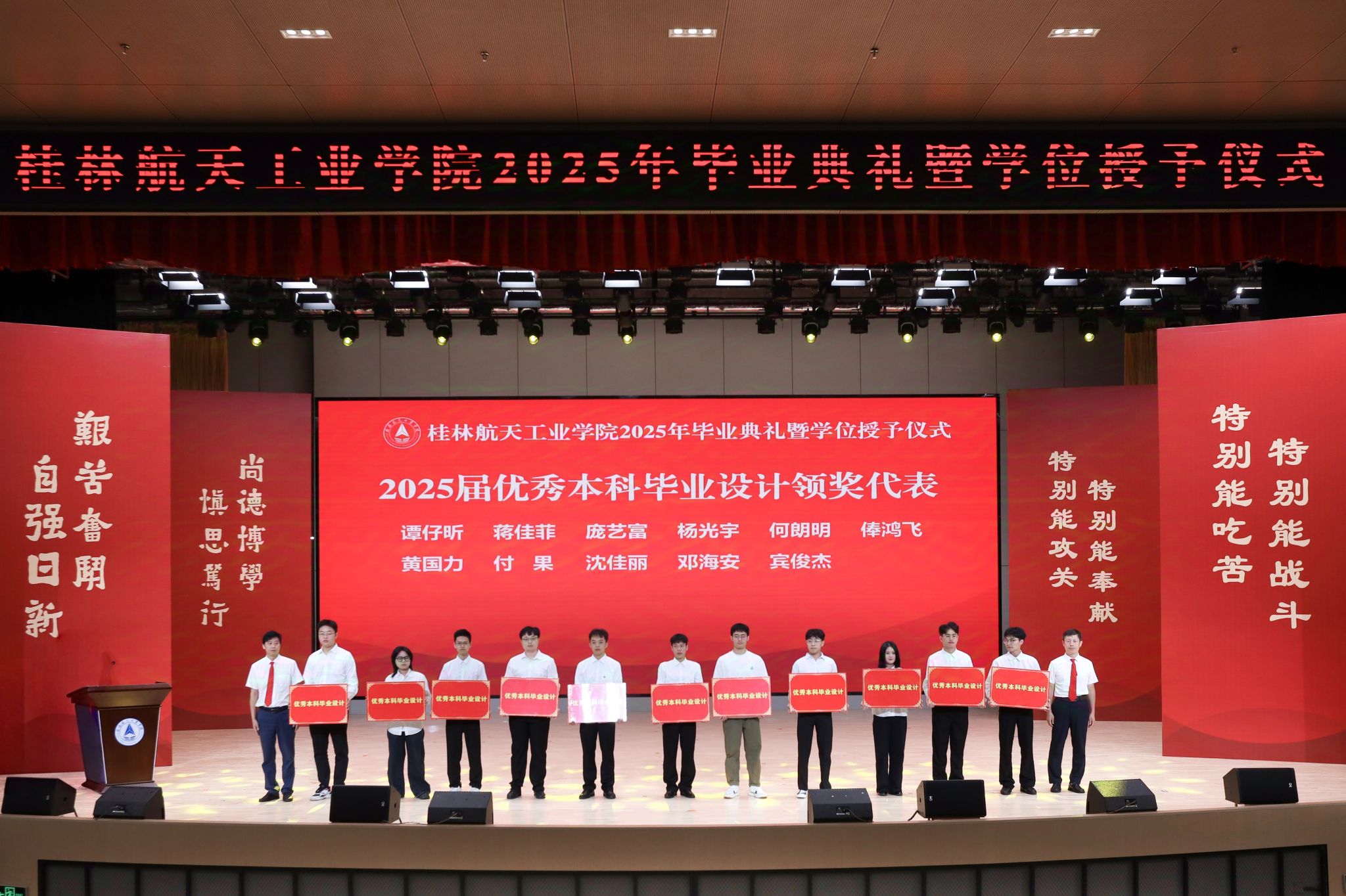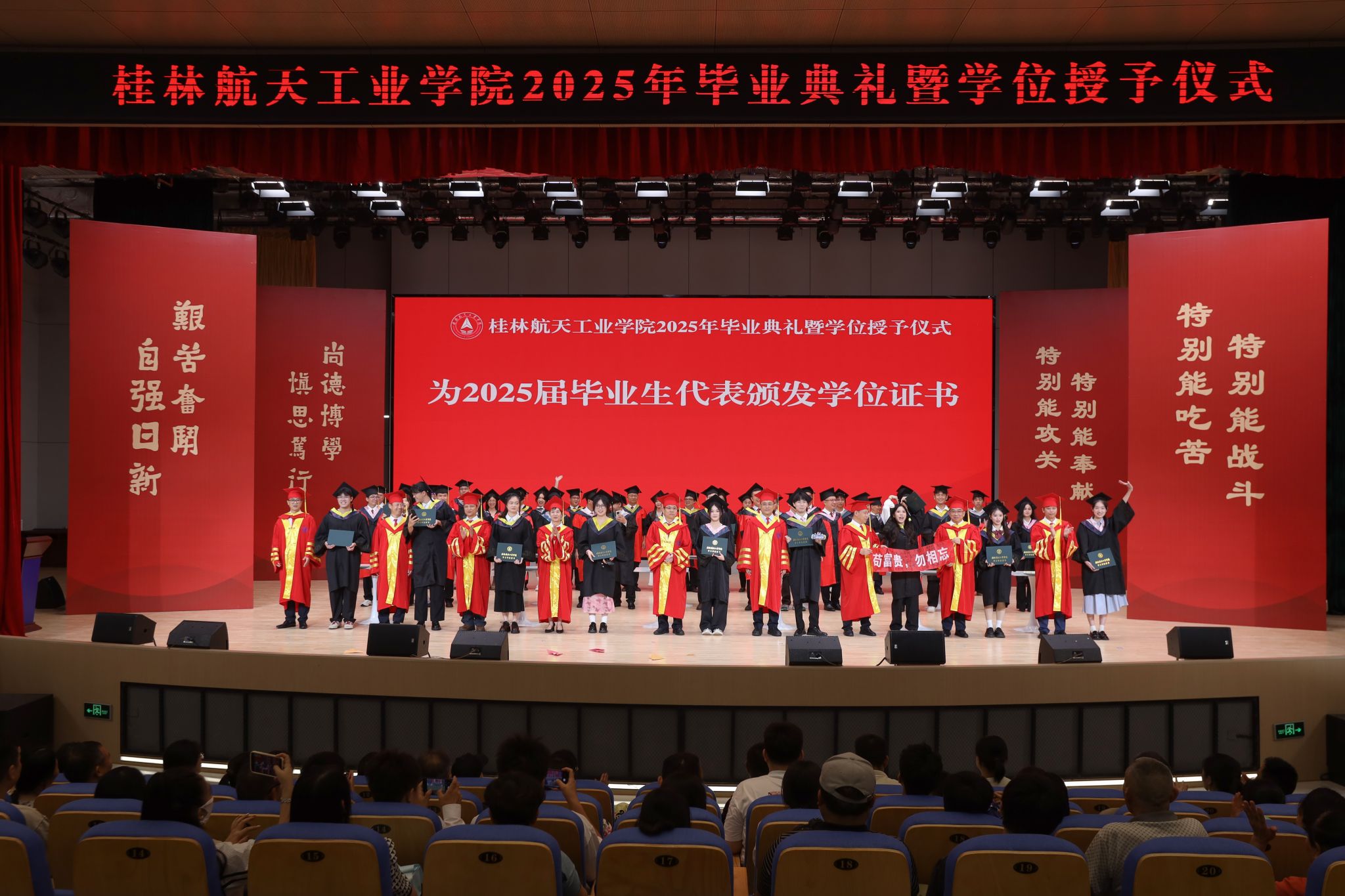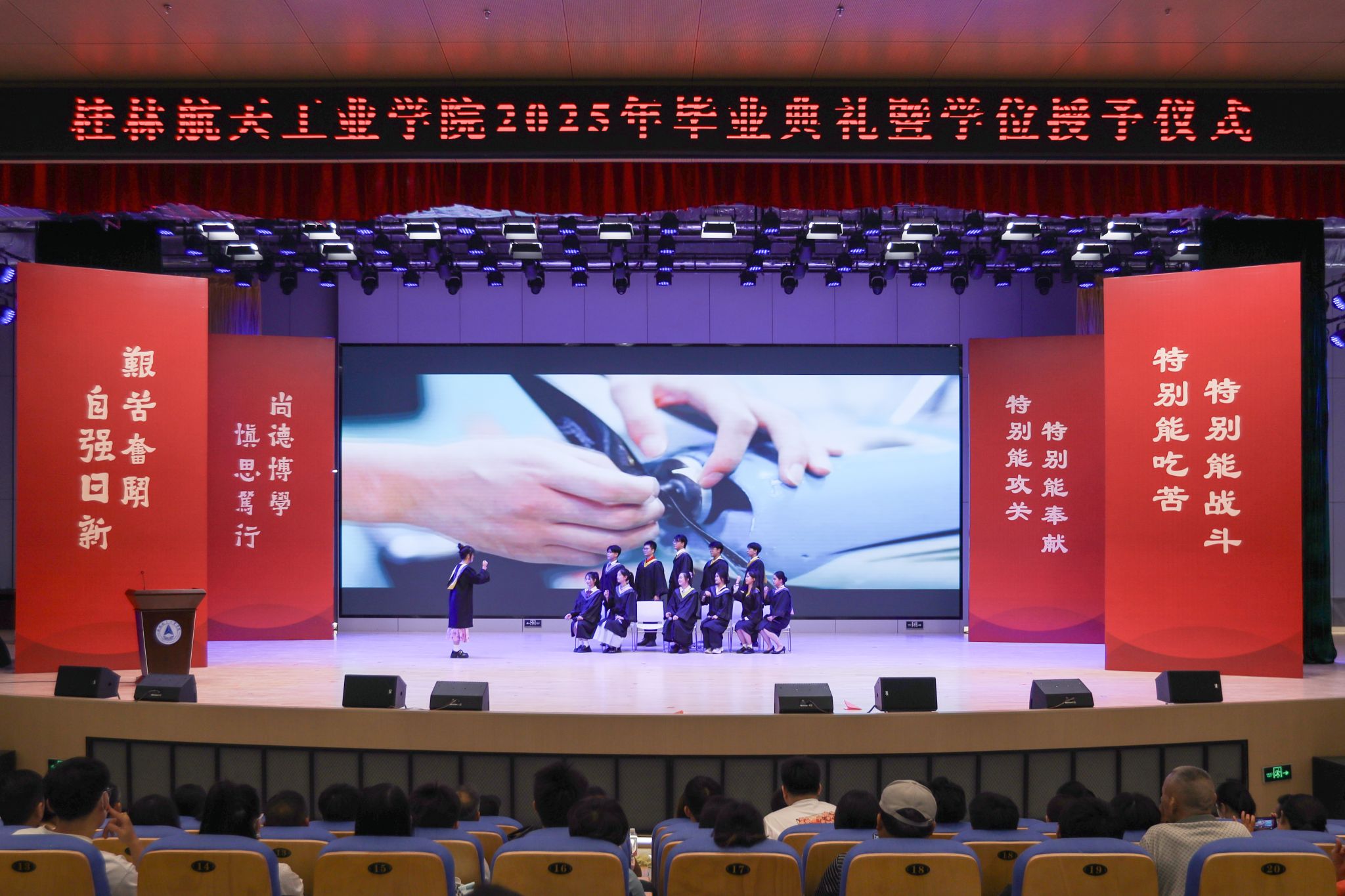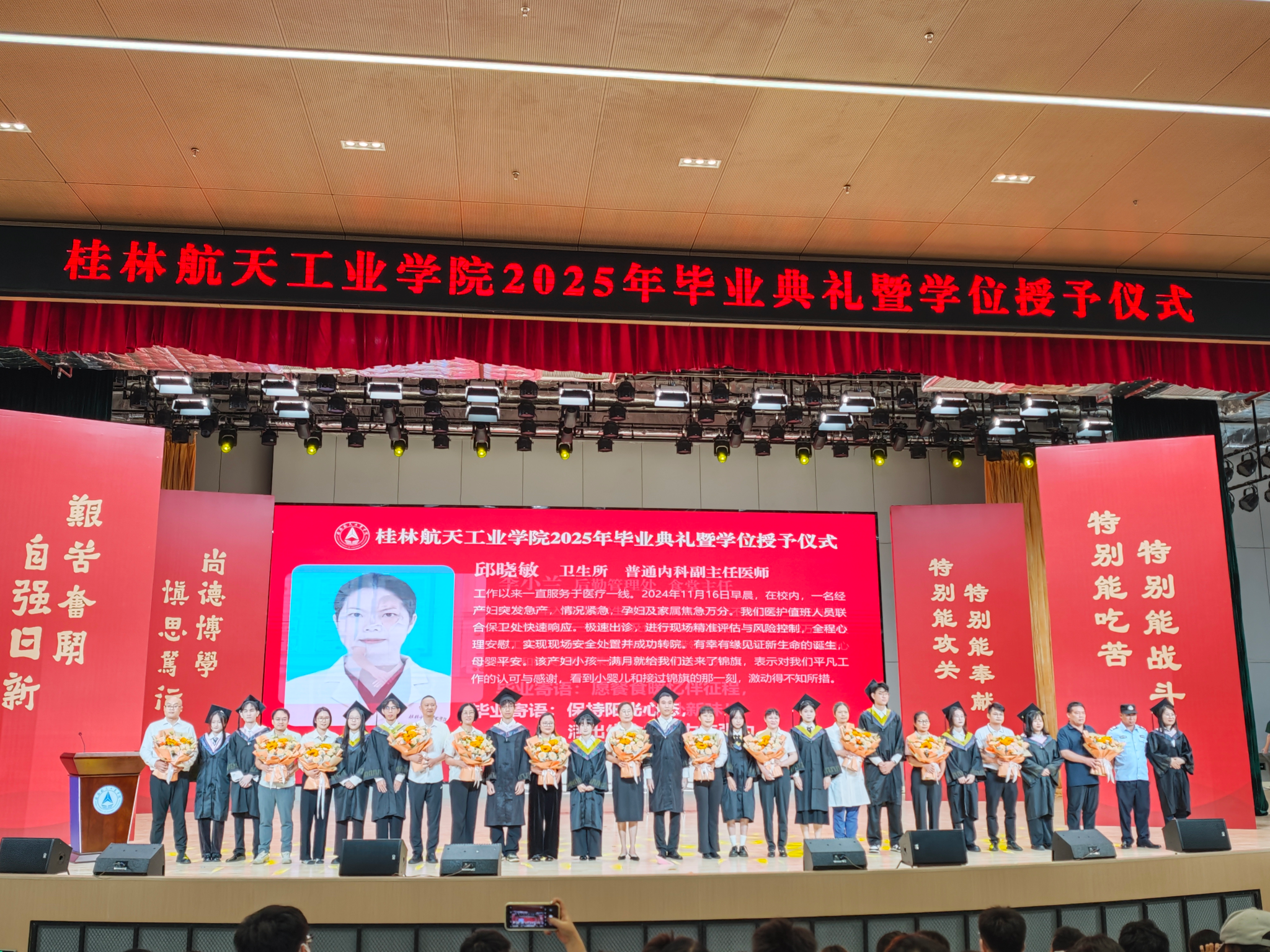 典礼上,精彩的情景剧《在盛夏告别》和朗诵《航天精神·桂航星辰》,展现了桂航学子的青春风采和航天精神。在感恩环节中,毕业生代表向专任教师、辅导员、教学秘书、实验室管理员、宿舍管理员、安全保卫员等校园各岗位工作人员献花,感谢他们多年来的默默坚守与无私奉献。四位教师带来歌曲《故事的最终》,以歌声表达不舍与祝福。
