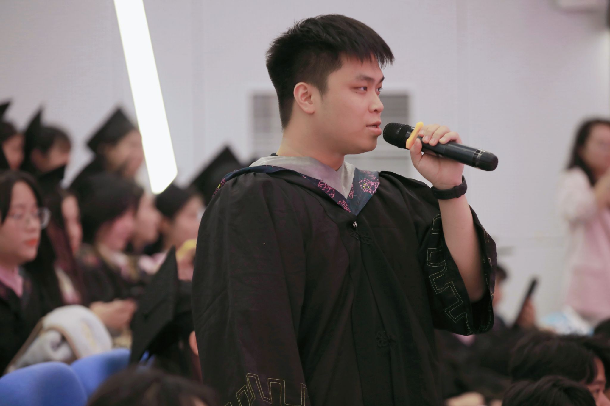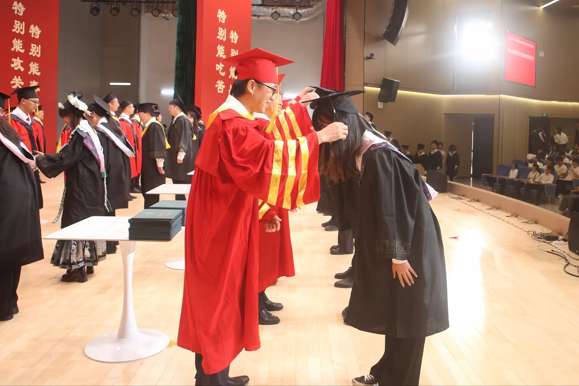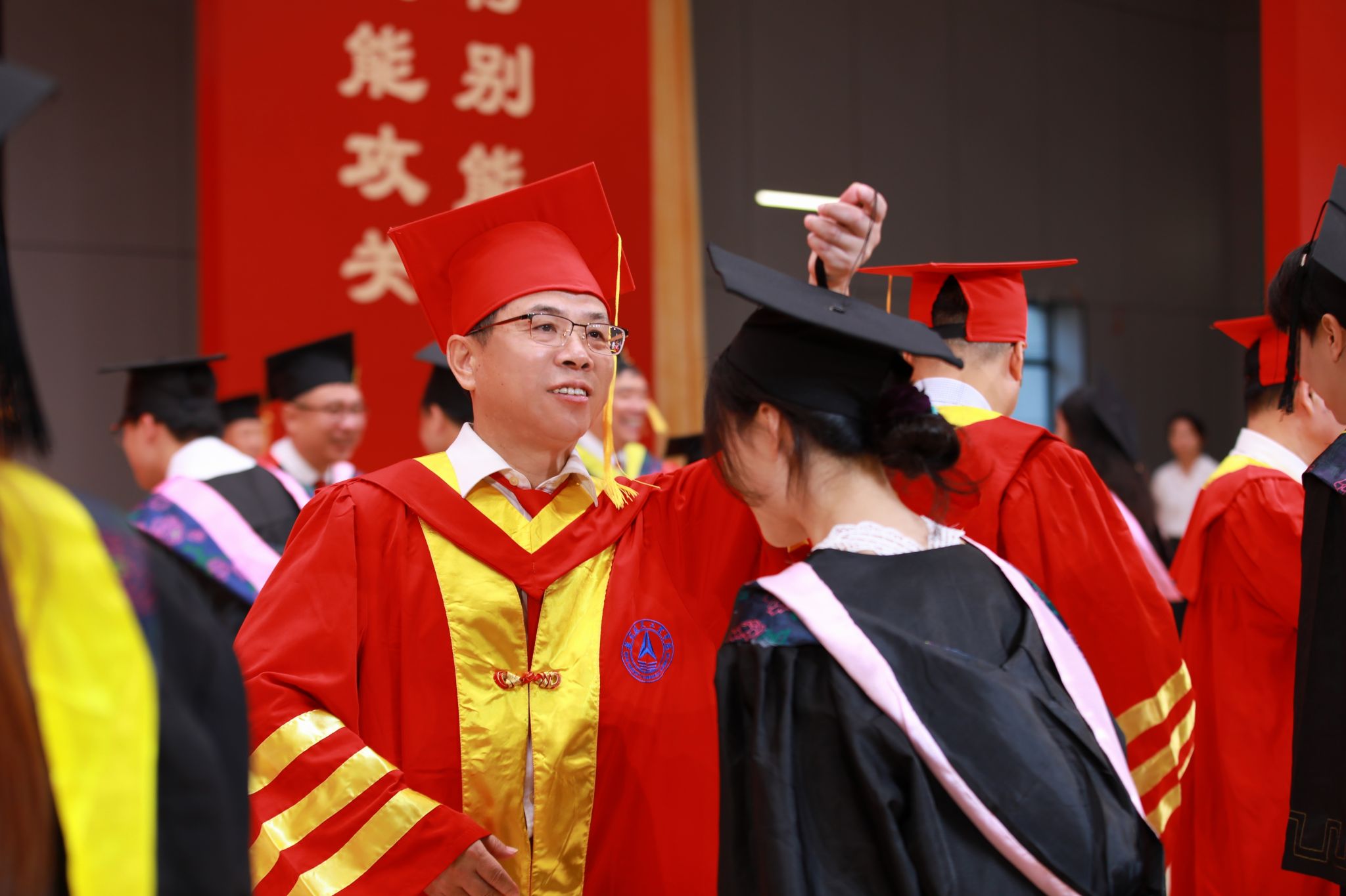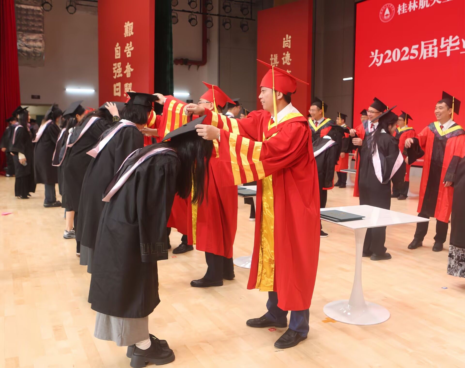 随后,李智宣读学士学位授予仪式文件,学校导师团为2025届获得学士学位的毕业生代表颁发学位证书、正冠拨穗。