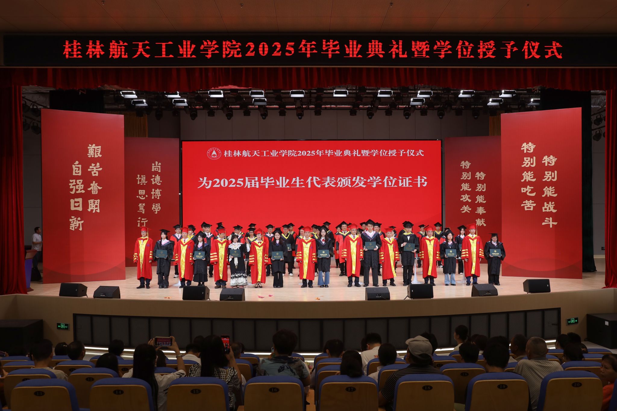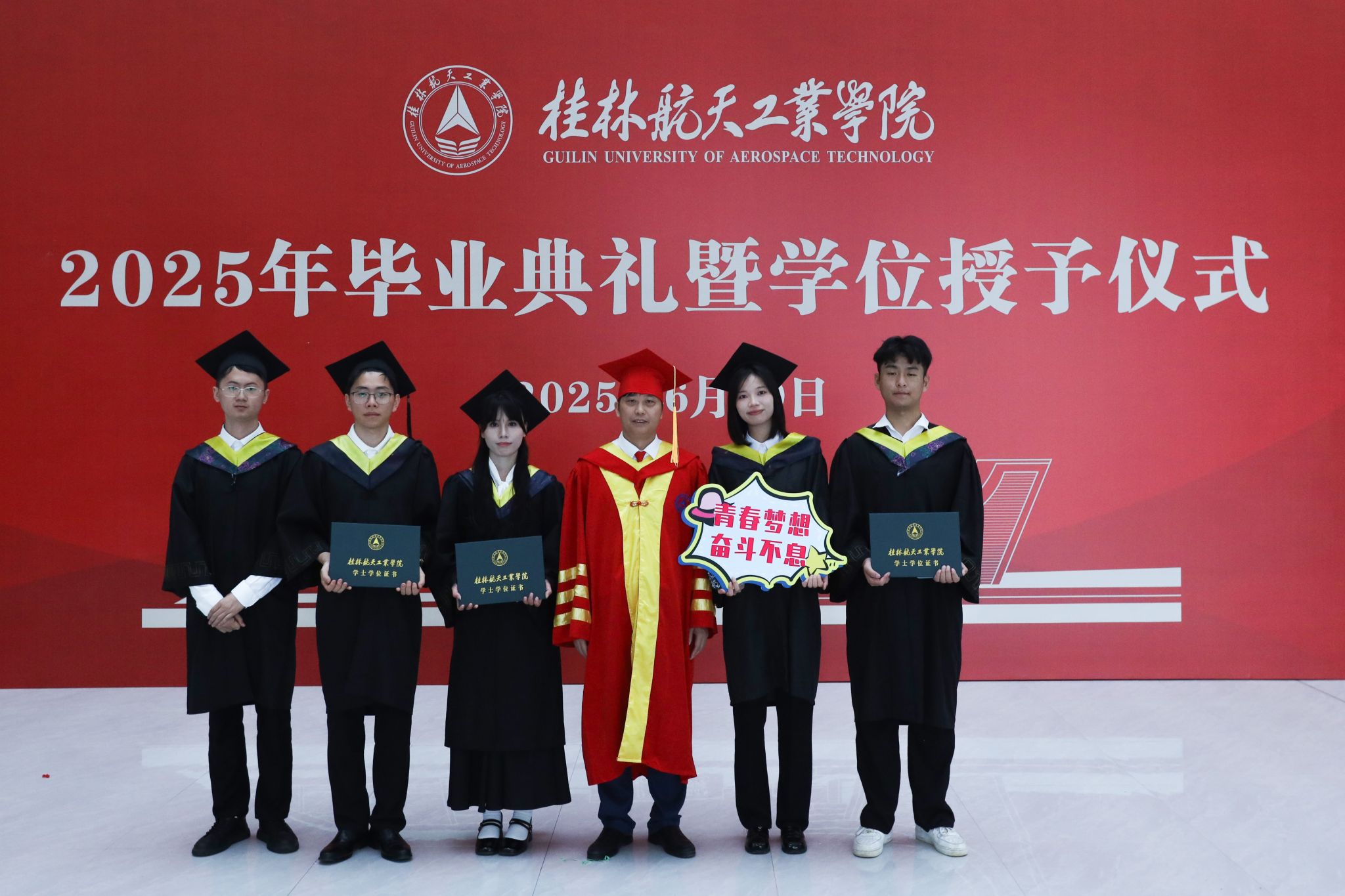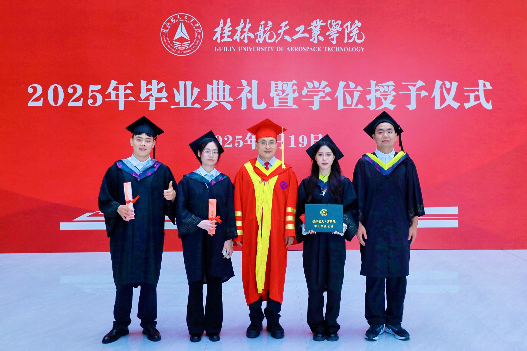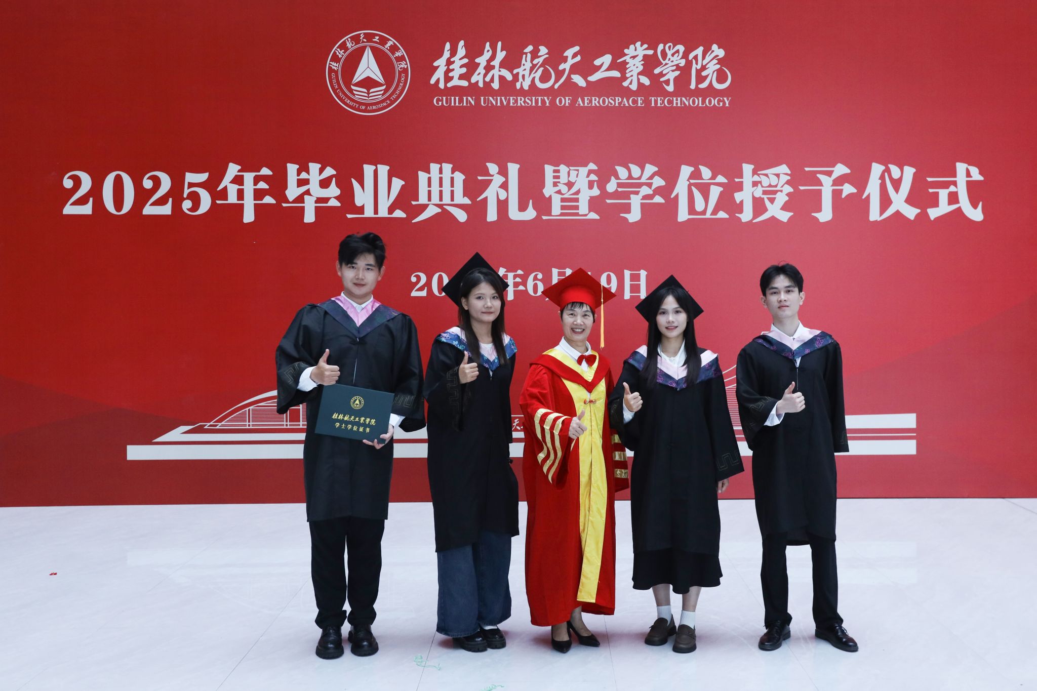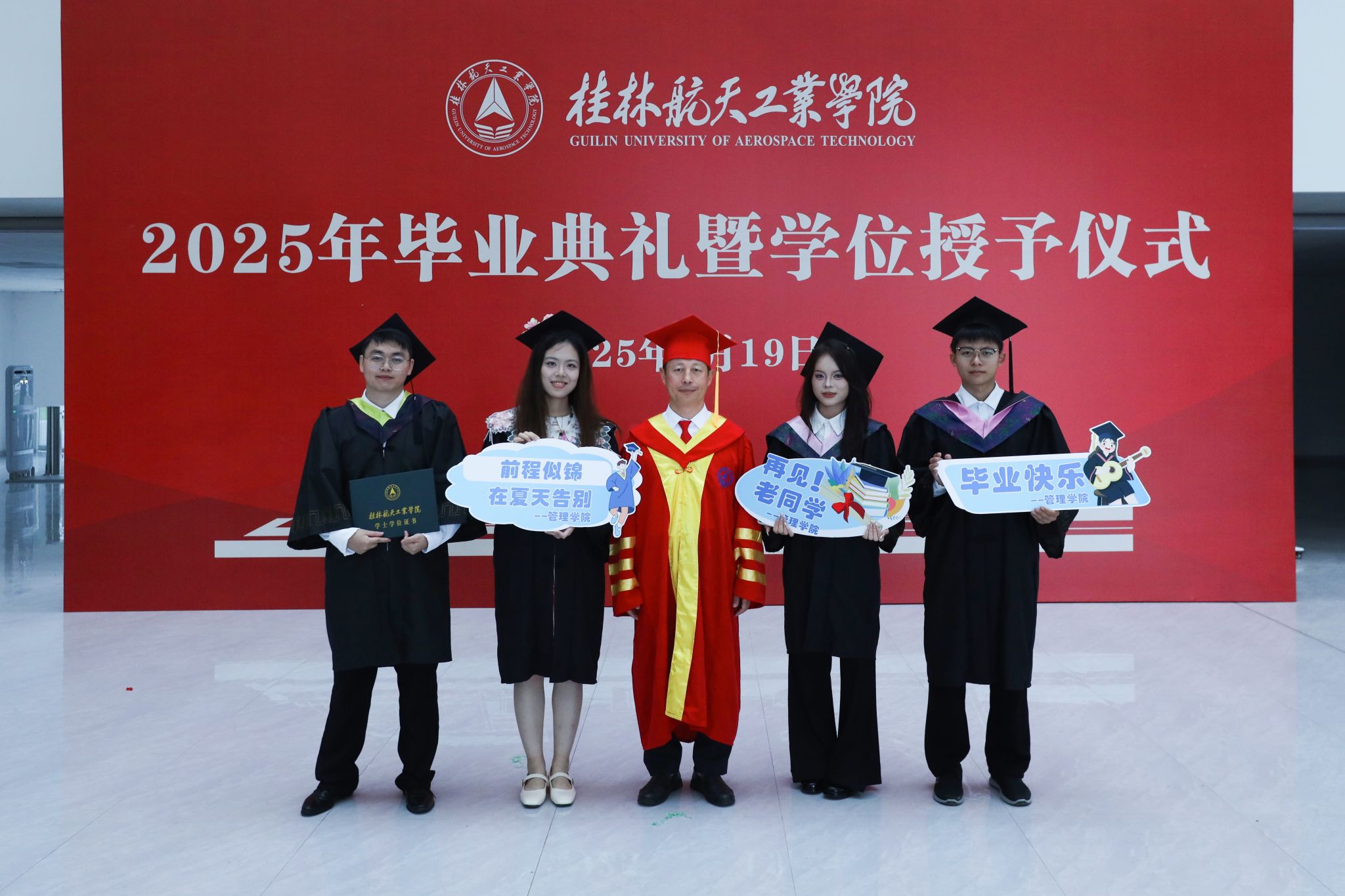 典礼在校歌《蓝天,是我们永远的向往》的歌声中圆满结束。全体毕业生高举证书,拍摄毕业合影,为在桂航的美好学习生活画上圆满的句号。