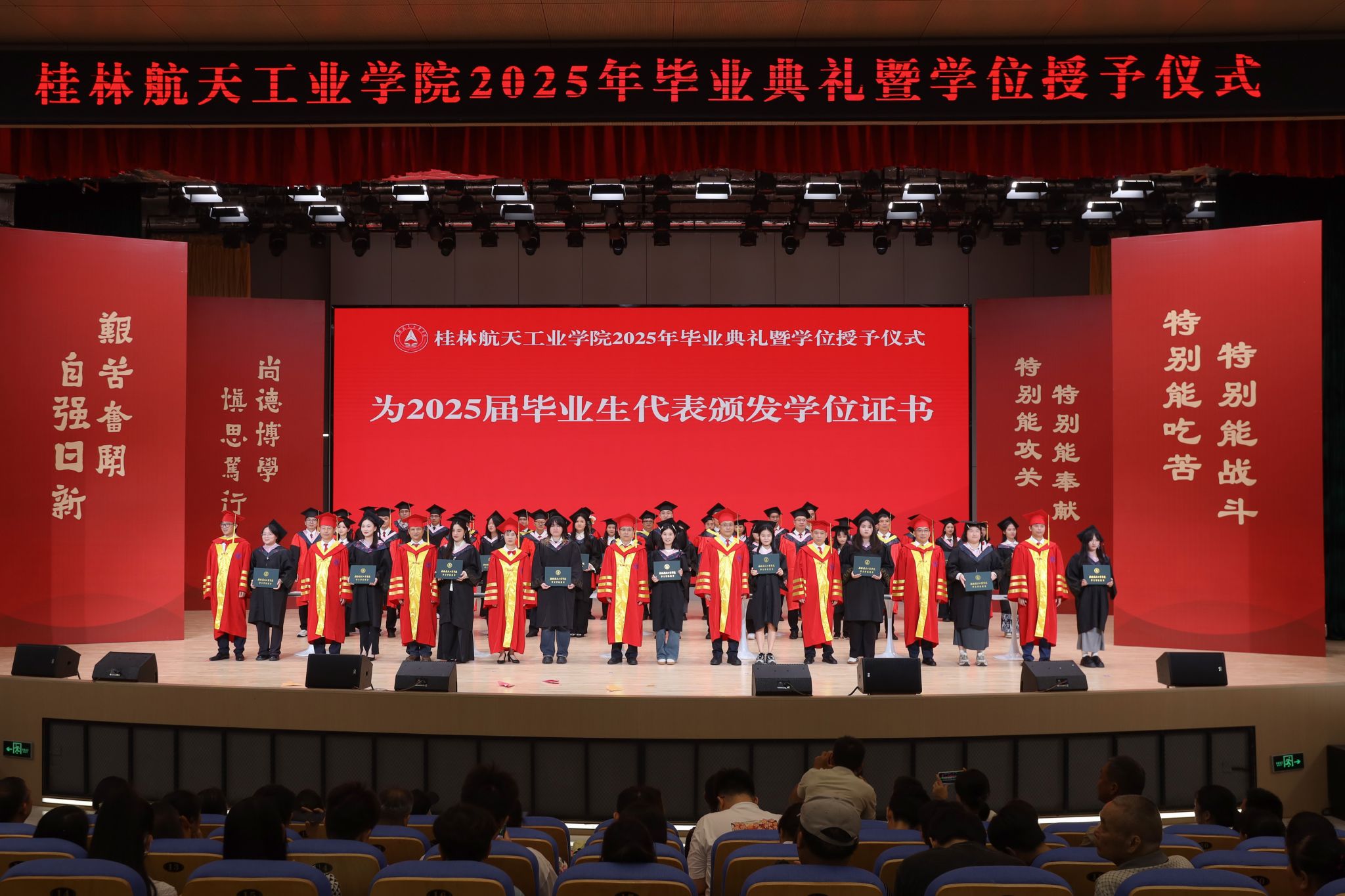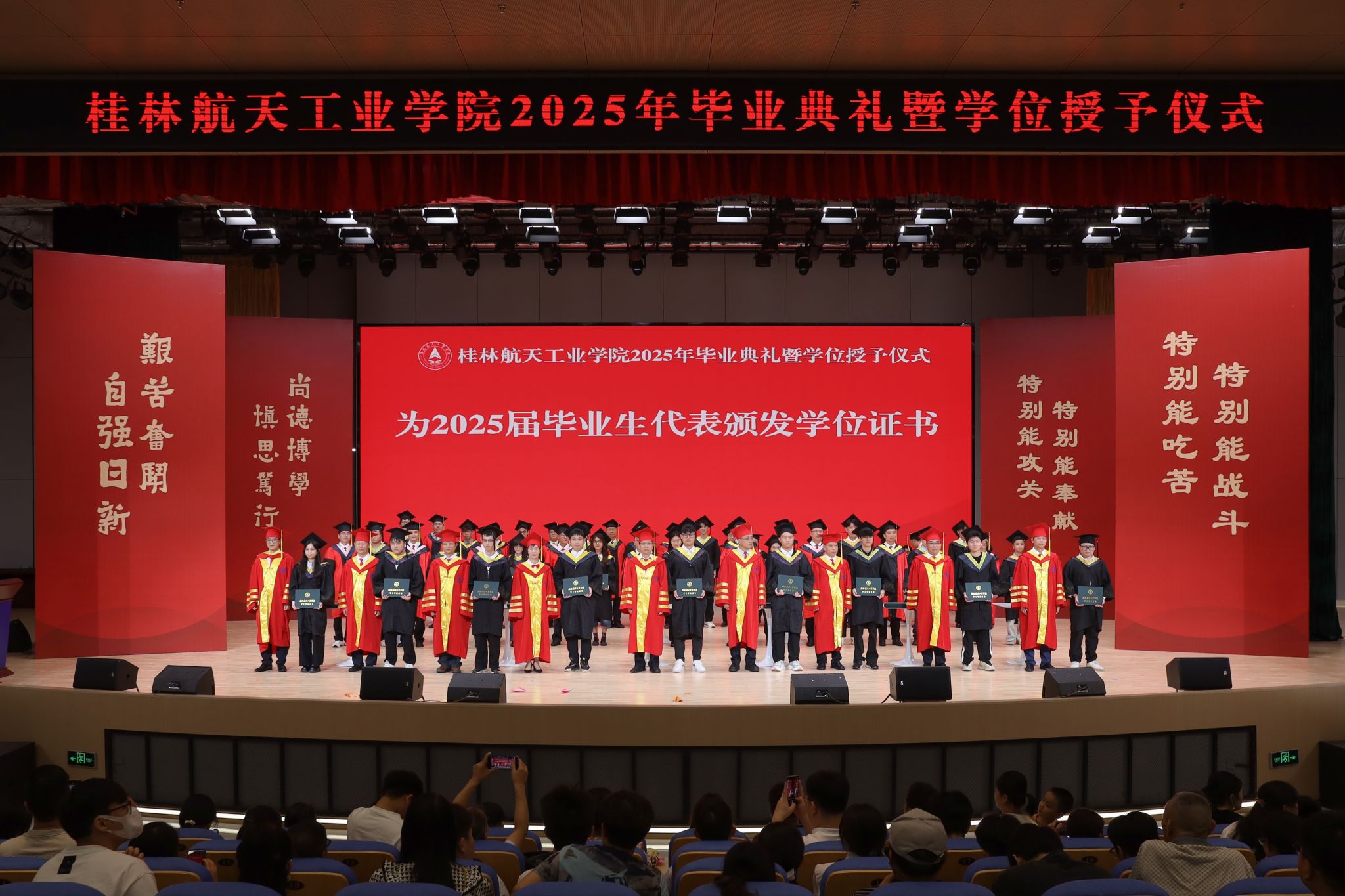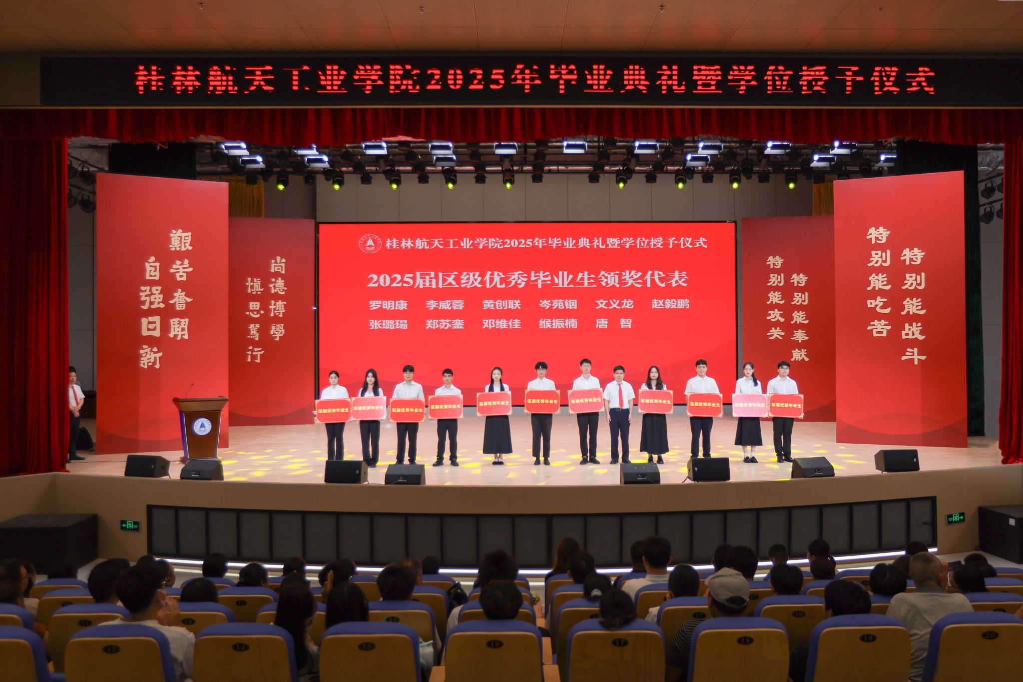毕业典礼伴随着庄严的国歌声正式开始。党委副书记、纪委书记吴江萍宣读表彰文件,校领导和校友代表为获得“2025届优秀本科毕业设计奖”“2025年硕士研究生”“2025届毕业生奖学金”“2025届校级优秀毕业生”和“2025届自治区级优秀毕业生”等荣誉的毕业生代表颁奖。