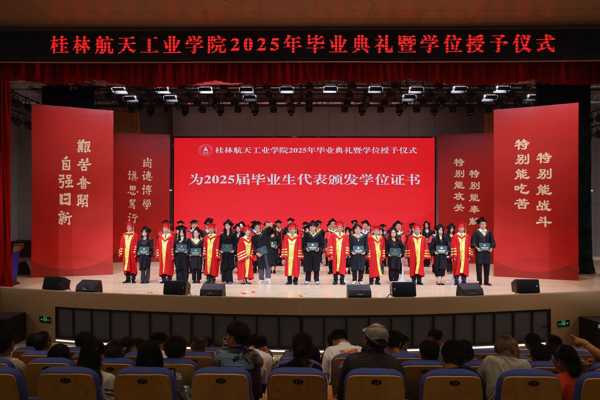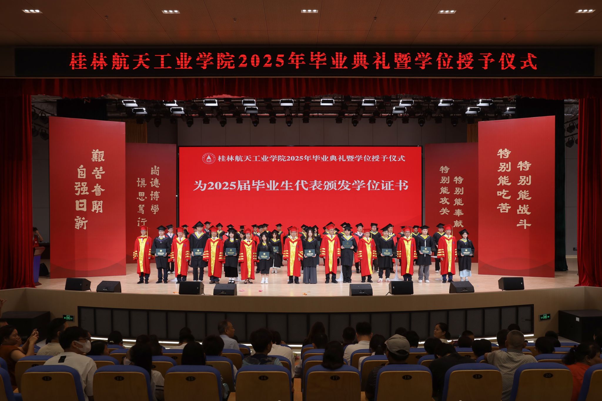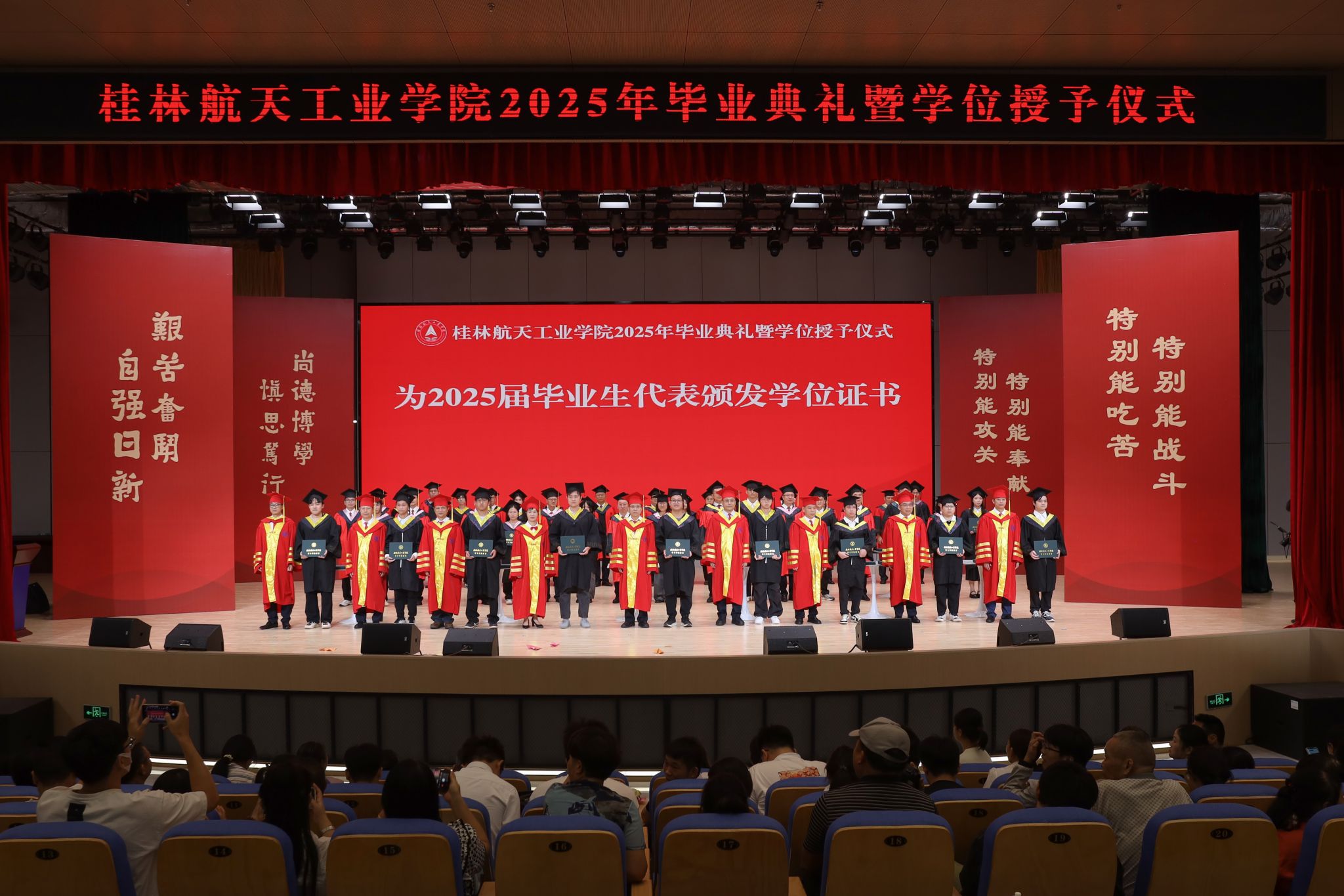 毕业典礼伴随着庄严的国歌声正式开始。党委副书记、纪委书记吴江萍宣读表彰文件,校领导和校友代表为获得“2025届优秀本科毕业设计奖”“2025年硕士研究生”“2025届毕业生奖学金”“2025届校级优秀毕业生”和“2025届自治区级优秀毕业生”等荣誉的毕业生代表颁奖。