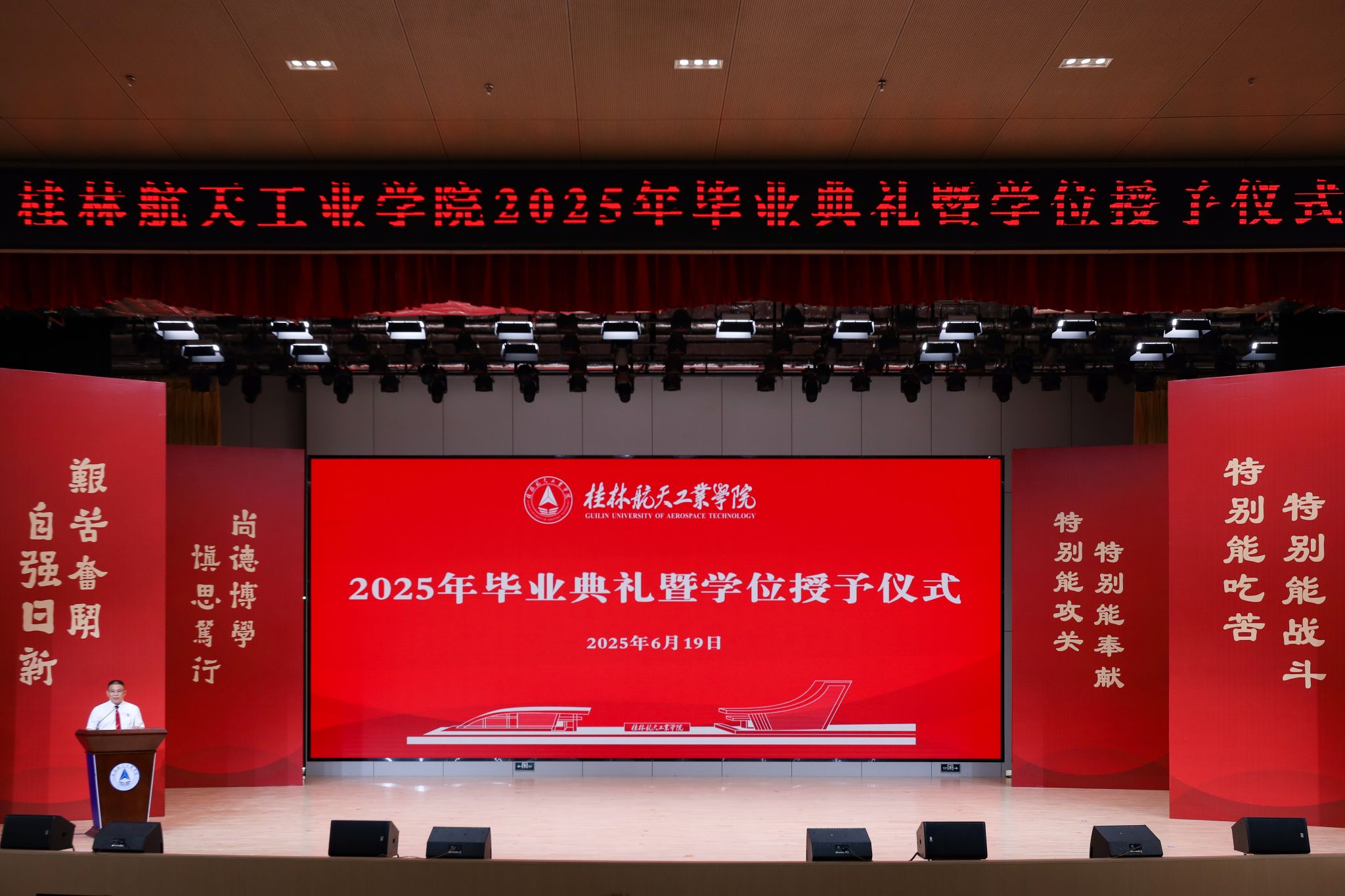 校长吴尽昭发表了题为《格物致知,思辨启新》的讲话。他深情回顾了同学们在桂航的青春足迹,肯定了大家的成长与成绩,并以“格物致知,思辨启新”八个字为主题,与毕业生分享了四点建议:一是要格物求知,坚持终身学习的态度,保持求知的欲望,持续更新知识结构;二是要思辨前行,始终保持独立思考的能力,不随波逐流,不盲从权威;三是要勇于创新,以“自强日新”的精神面对科技革命与产业变革的历史机遇;四是要笃行担当,将理想付诸行动,将使命熔铸于家国情怀。他希望全体毕业生带着母校的荣光,铭记“鲜衣怒马少年时,不负韶华行且知”的诗意嘱托,在人生新征程上绽放属于自己的精彩华章。