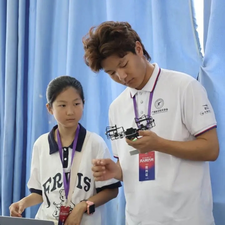 据悉,本届大赛是深入贯彻落实习近平总书记关于 “在教育‘双减’中做好科学教育加法” 重要指示精神的关键实践。作为教育部2022-2025学年面向全国中小学生的44项自然科学素养类竞赛之一,本次竞赛通过设立操控类、编程类、组合类、虚拟类和创意类共五大类24个赛项,锻造青少年系统工程思维,为航空航天领域储备后备力量,探索“减负”与“提质”协同推进路径。周竞赛在参观比赛现场后点评:“本次赛事汇集了来自广西十三地市的少年精英,印证了广西青少年科技教育从‘知识传授’向‘素养生成’的转型成效,这正是‘科学教育加法’最生动的课堂!”
