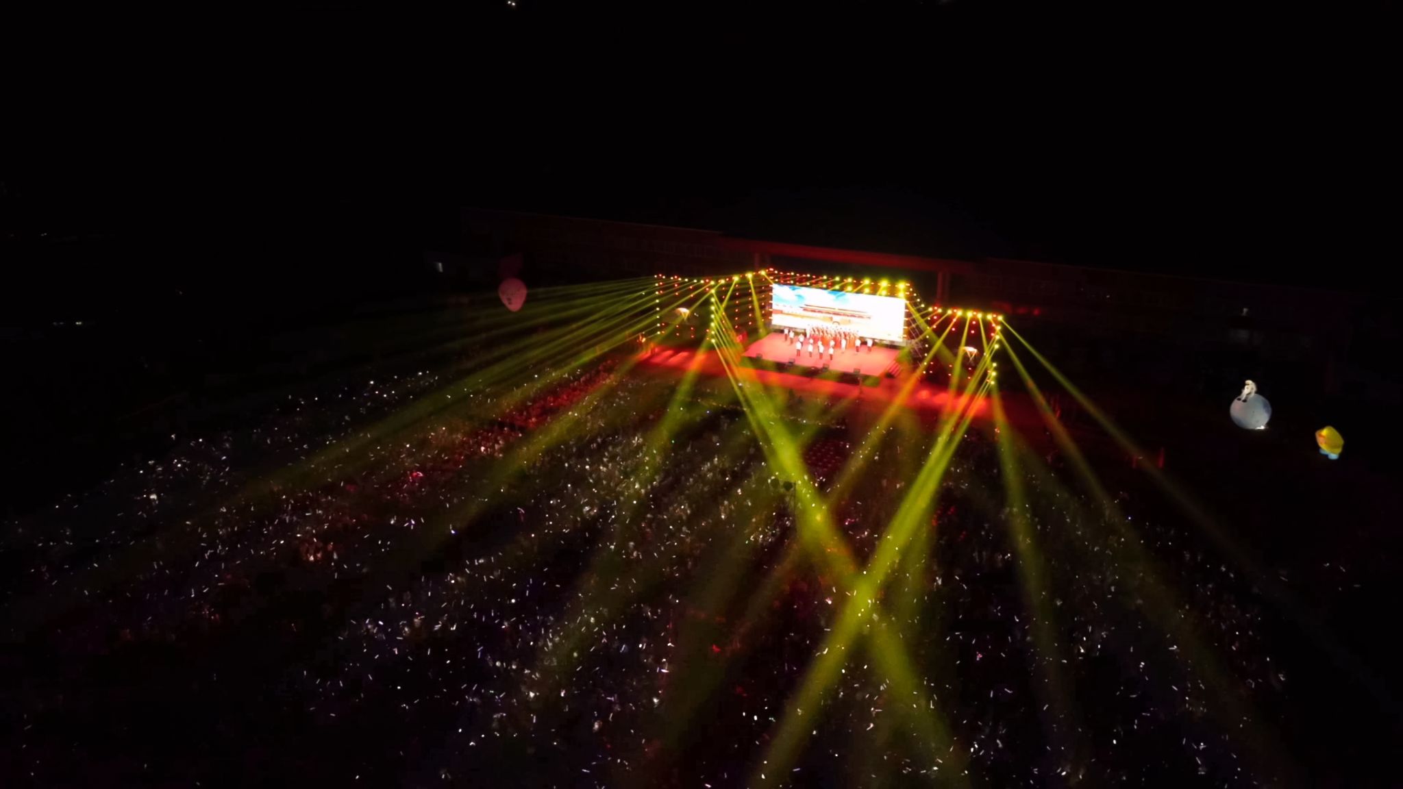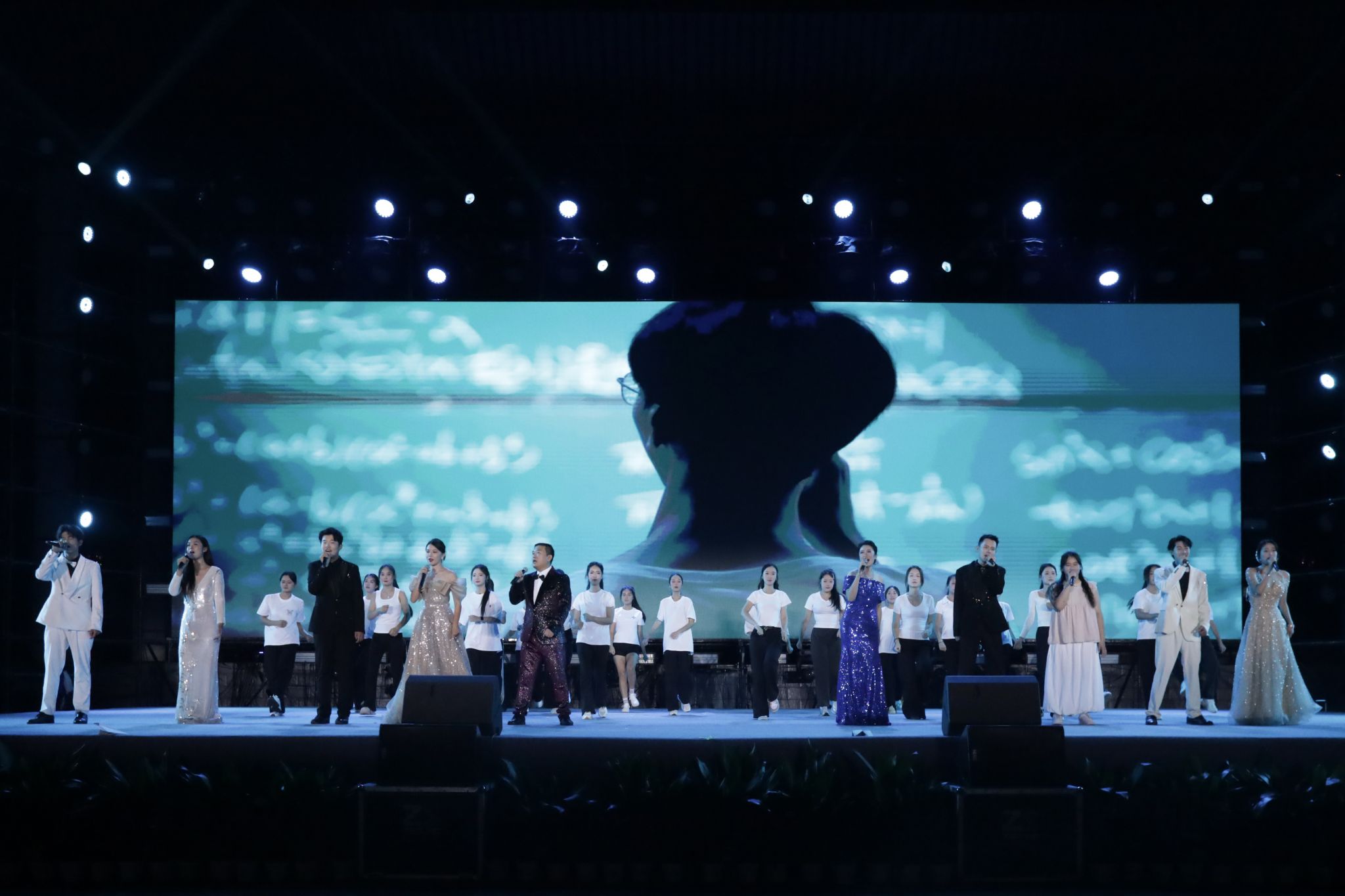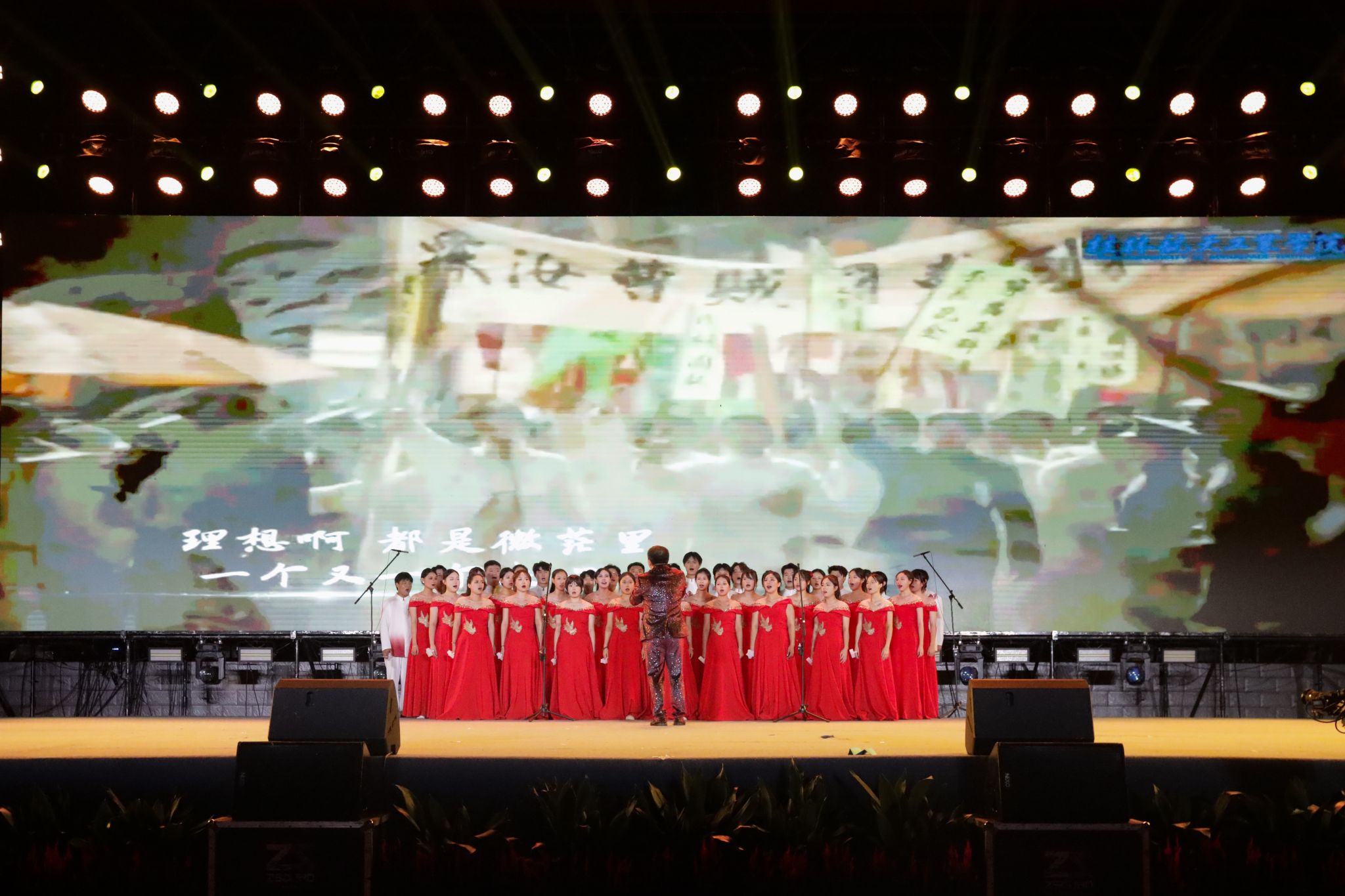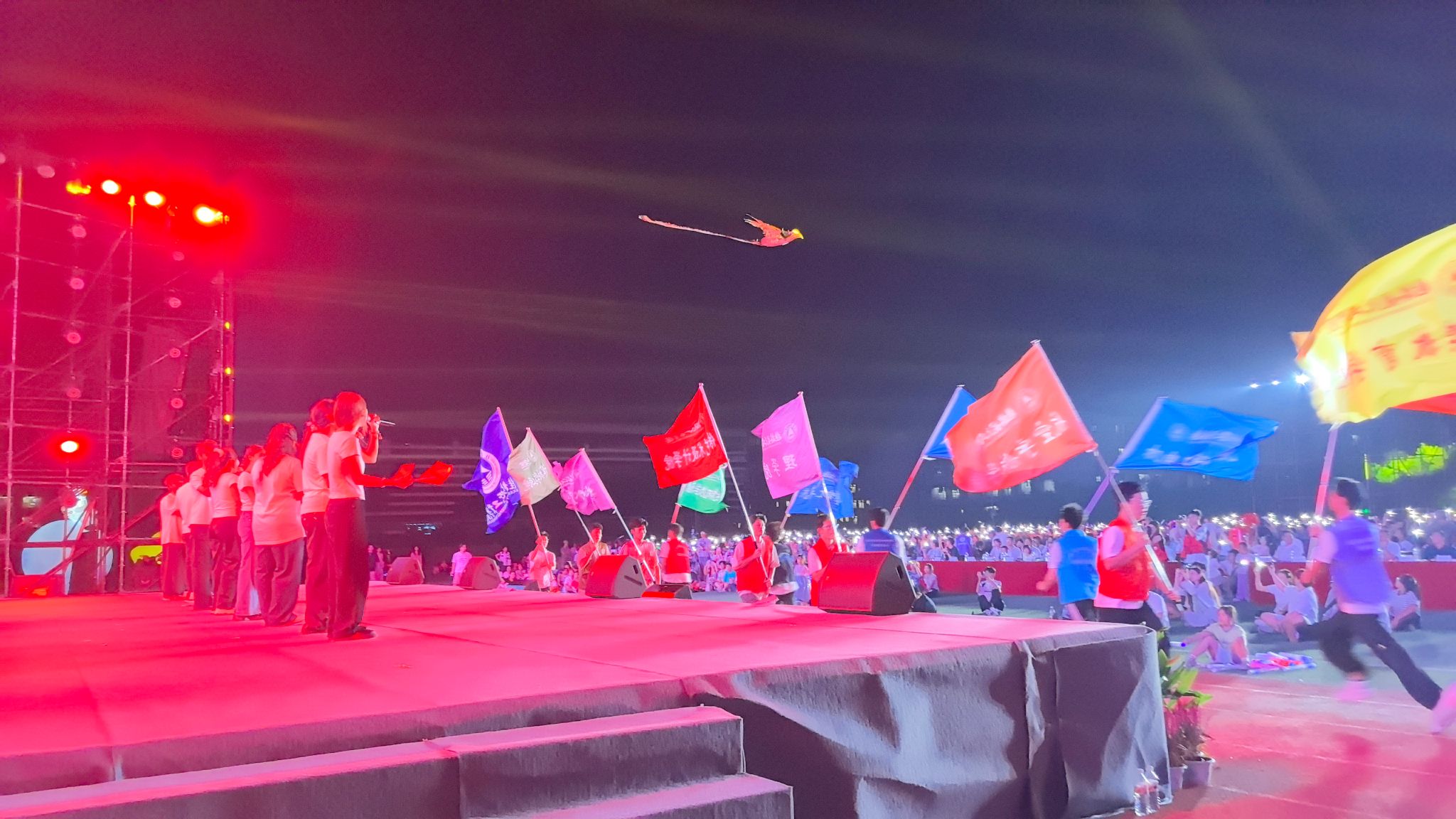 晚会尾声,合唱《初光》《蝴蝶泉边》《我爱你中国》将现场氛围推向高潮。在《蝴蝶泉边》婉转的旋律中,五架蝴蝶扑翼机在夜空中划出绚丽弧线,象征着青春梦想自由翱翔。最后在《我爱你中国》的歌声中,凤凰航空模型起飞,全场师生齐声高歌,用歌声表达对祖国的热爱与祝福。
