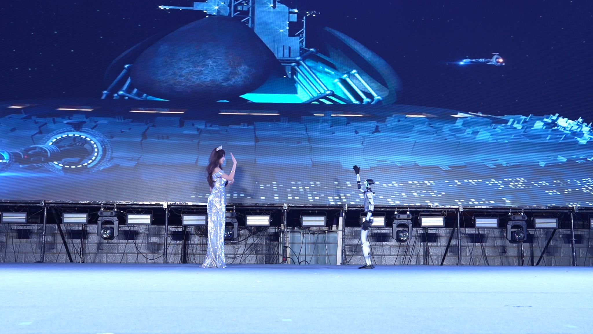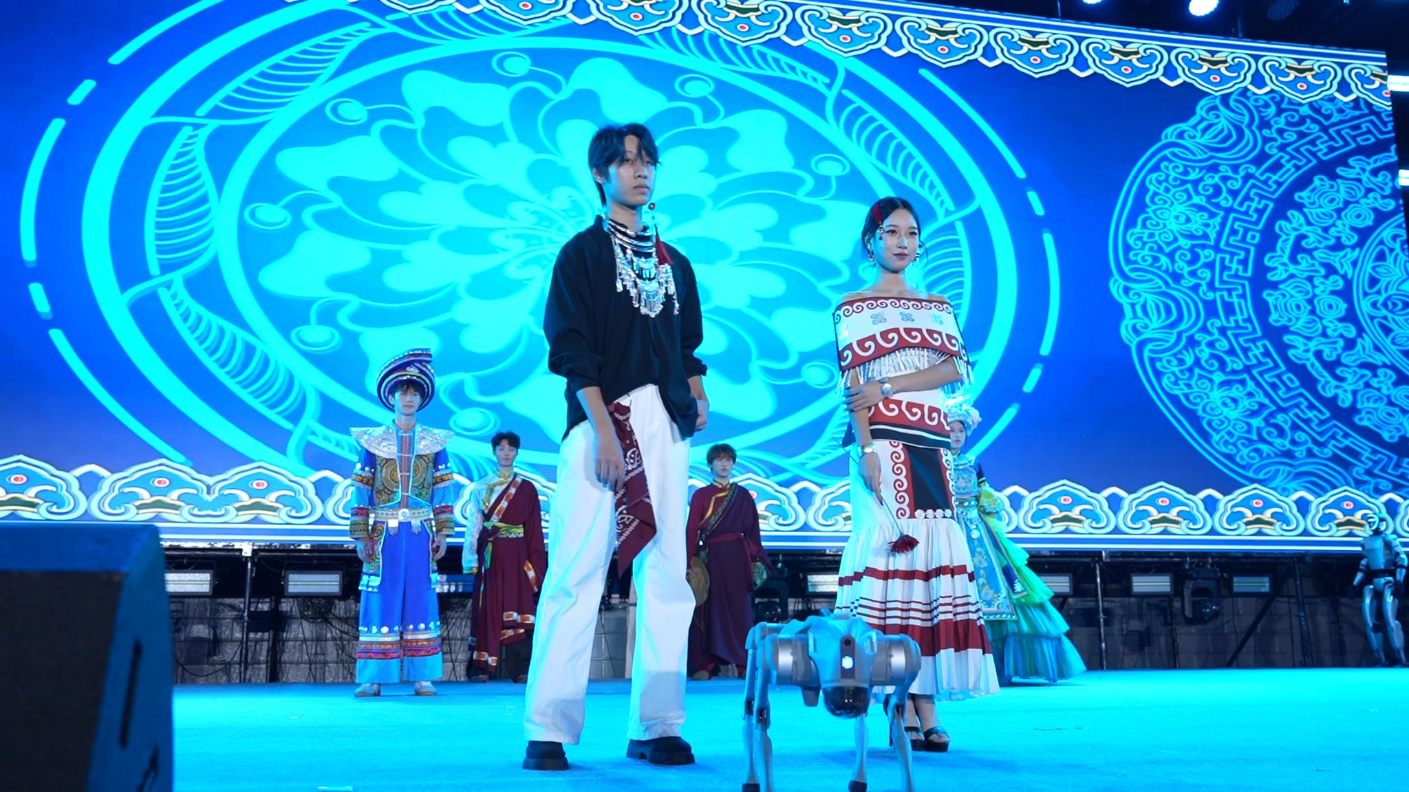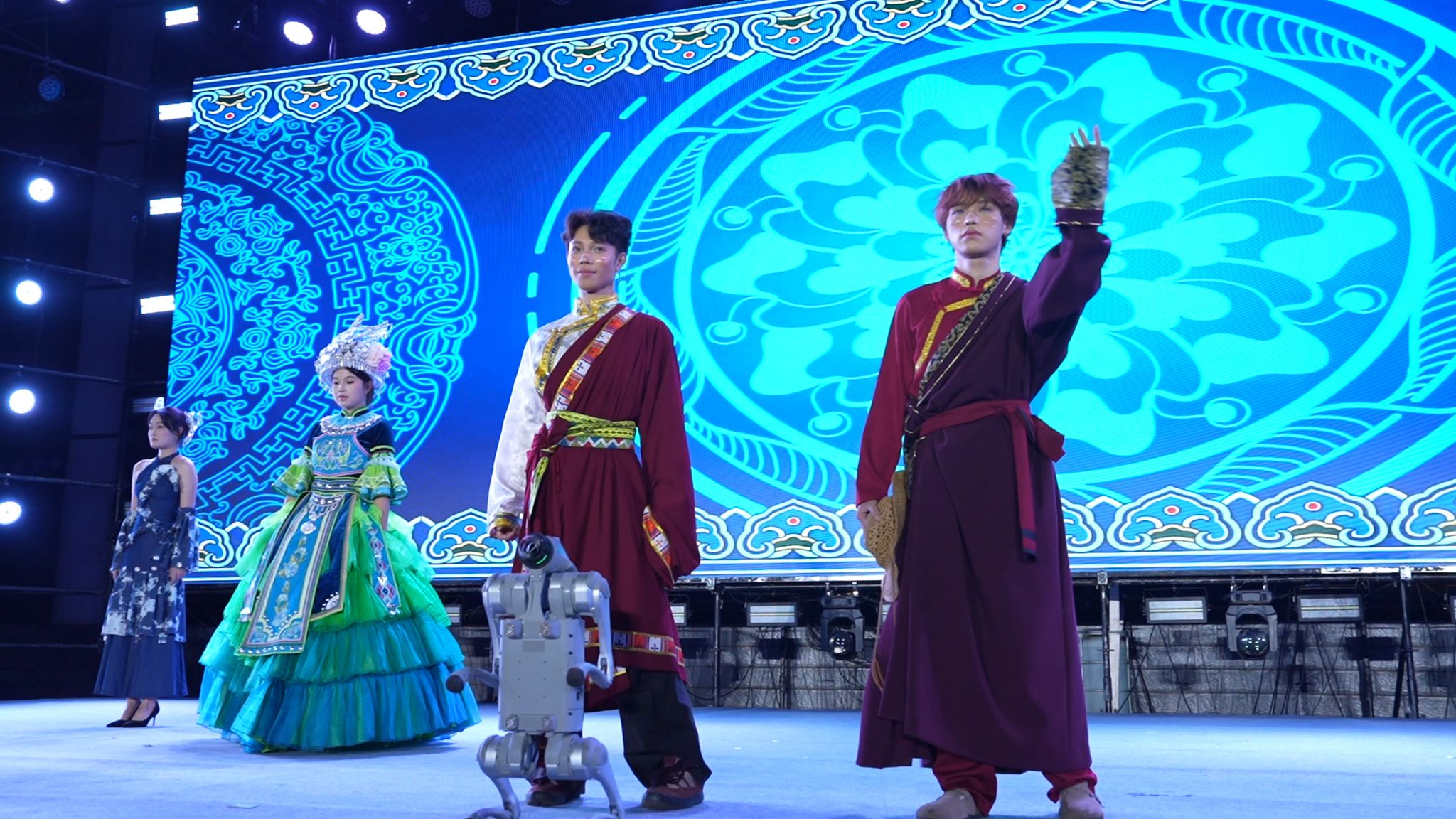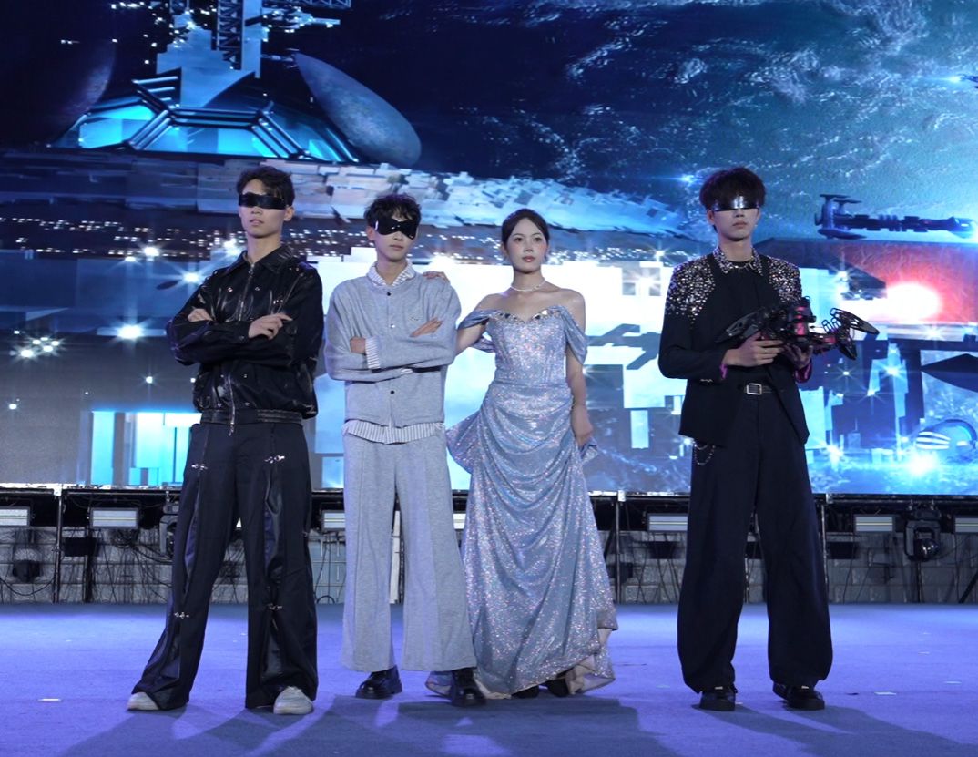 本届晚会深度融合科技元素与艺术表演,打造出一场极具航空航天特色的视听盛宴。街舞《翼动节拍》将无人机飞行轨迹与街舞动作精准配合,展现青春节奏与科技灵动的完美融合;走秀《寰宇衣章》创新引入“机器人”、“机器狗”与演员同台表演,在民族服饰中融入航天符号,同时展示了学校物联网创新创业基地和电子爱好者协会学生自主设计的科技产品,呈现“科技+民族”的创意对话;情景舞蹈《你好,新同学》通过C919起航的舞台意象,寓意新生大学生活的全新启航。