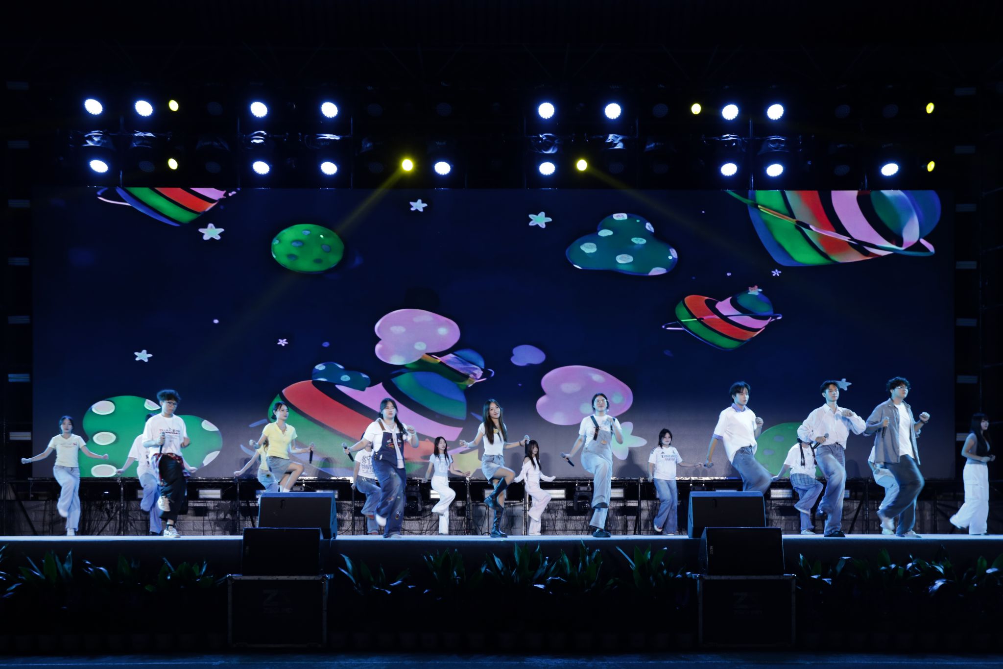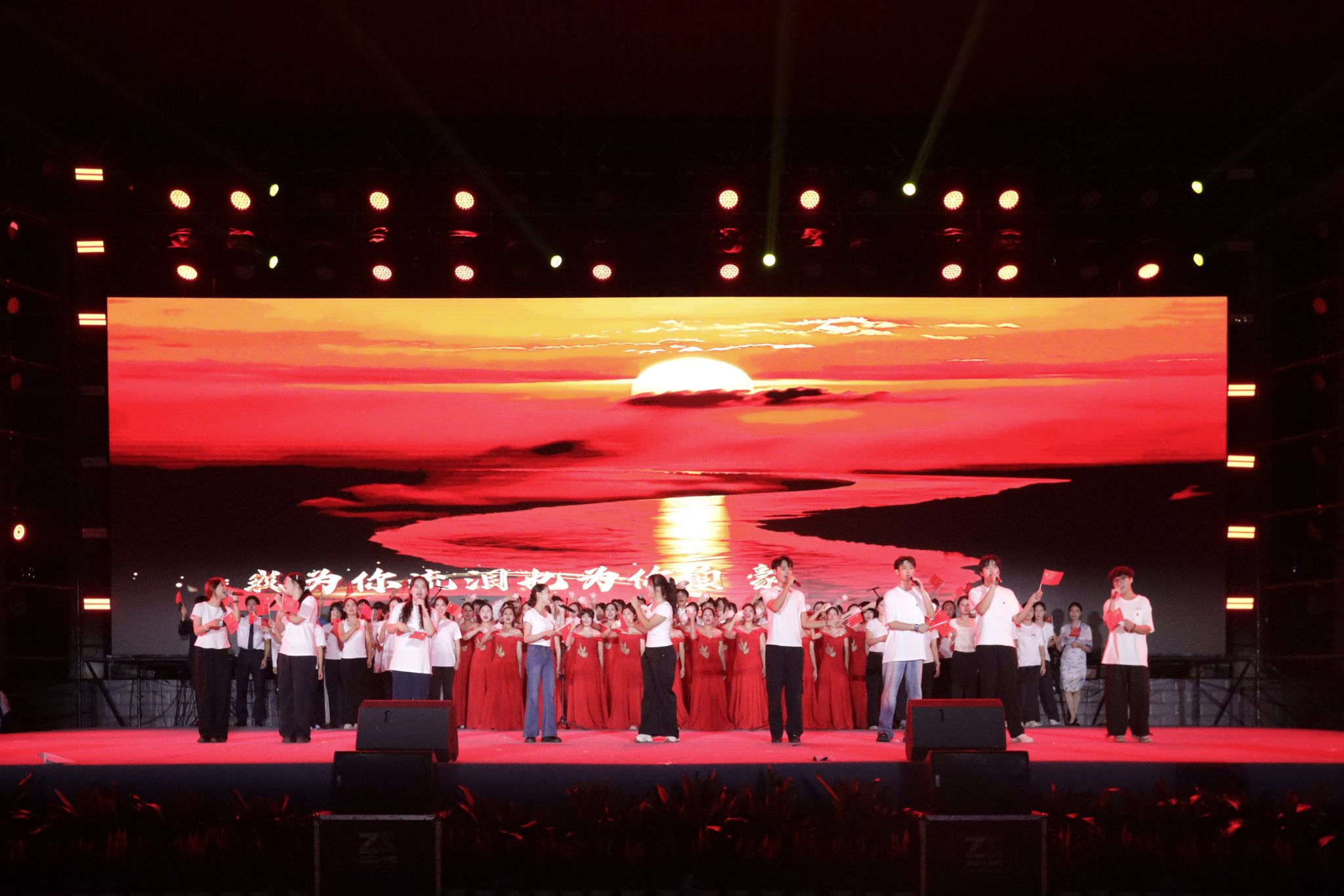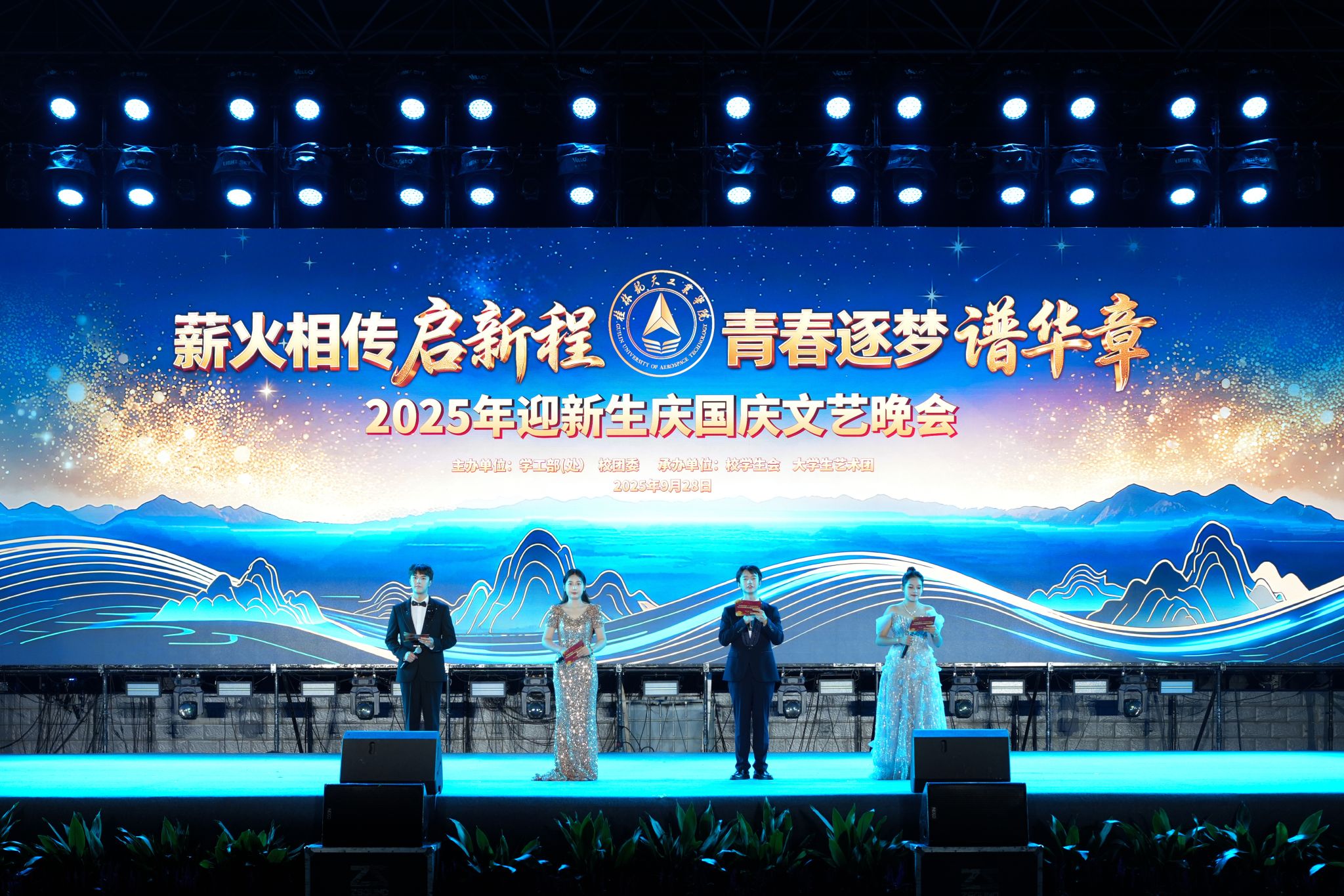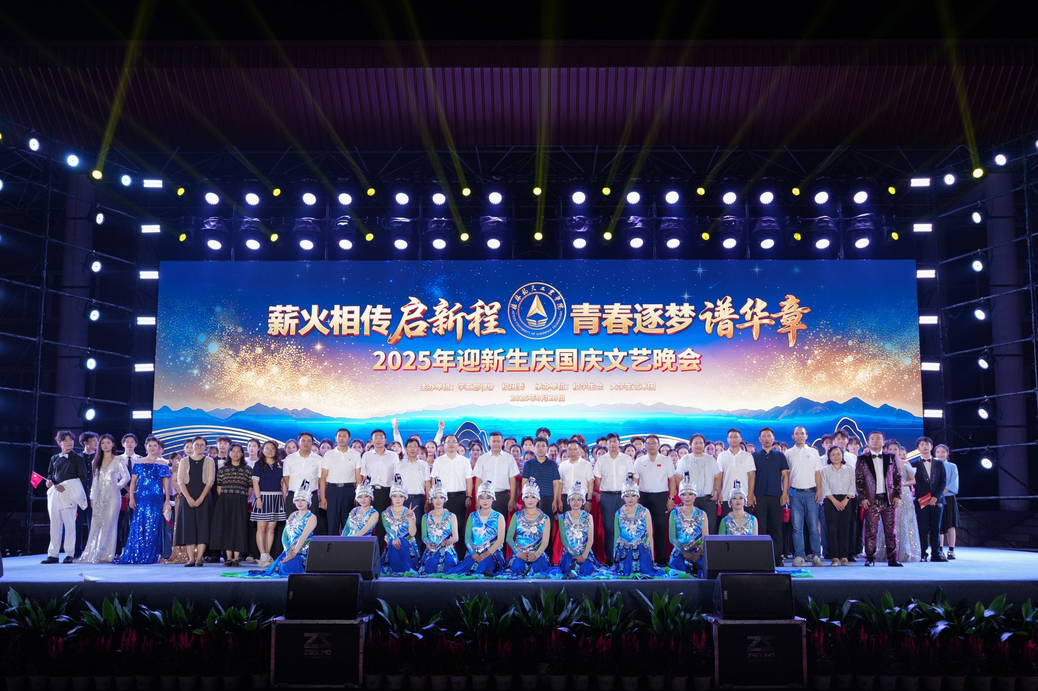 为庆祝中华人民共和国成立76周年,赓续航天精神,繁荣校园文化,喜迎2025级新同学的到来。9月28日晚,由学工部(处)、校团委主办,校学生会、大学生艺术团共同承办的“薪火相传启新程·青春逐梦谱华章”2025年迎新生庆国庆文艺晚会在Beat365南校区田径场隆重举行。学校领导韩峻峰、孙山林、柯君行、杨永昌,各职能部门负责人、教学单位负责人、军训教官、教师代表、校友代表以及全体新生5000余人共同观看了本次晚会。