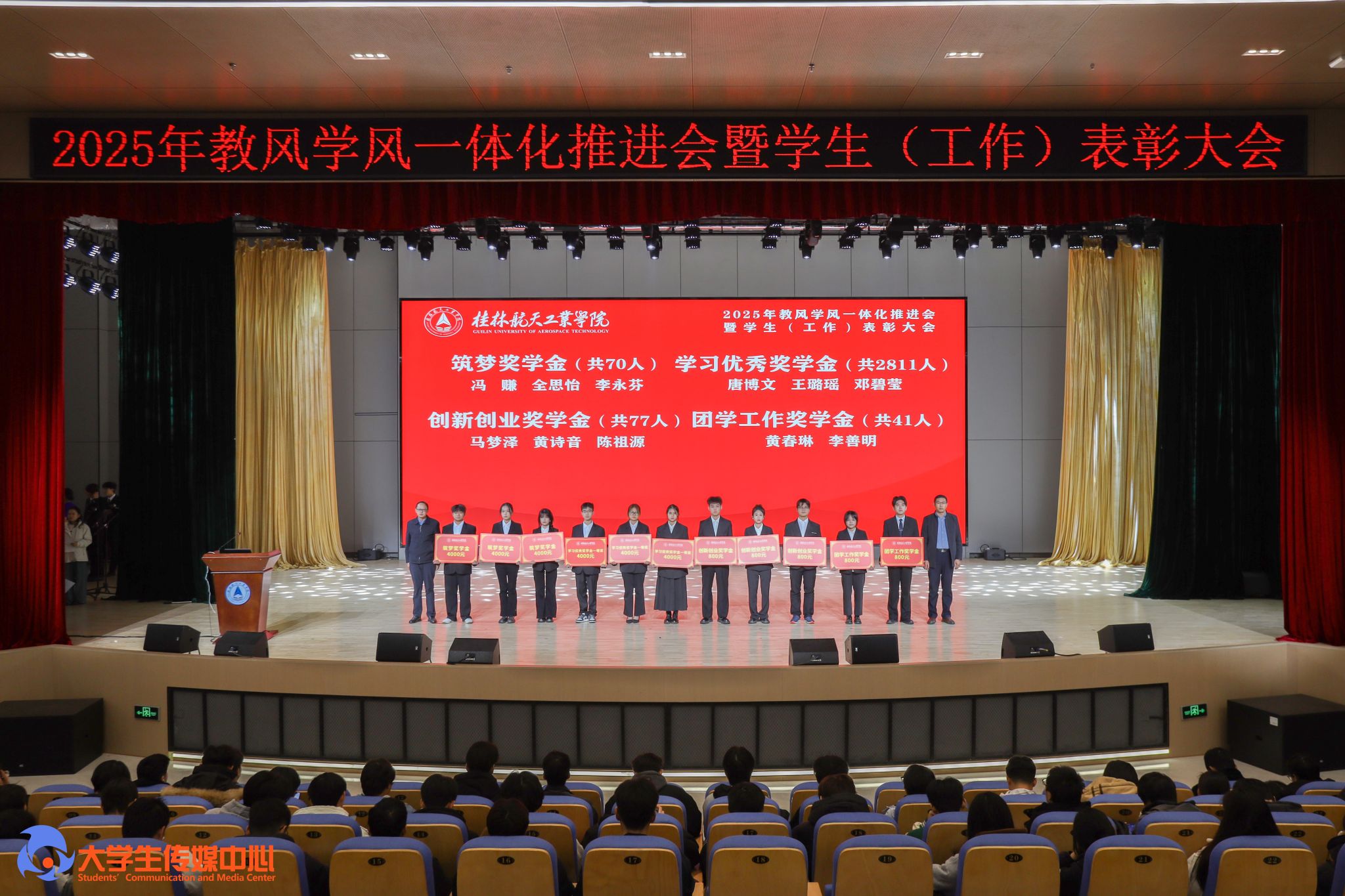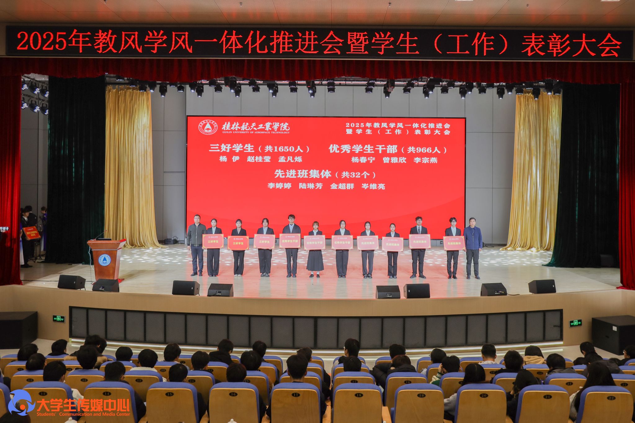 12月23日下午,学校在问天楼图书馆报告厅举行“星辰耀桂航·领航启新章”2025年教风学风一体化推进会暨学生(工作)表彰大会。学校党委书记韩峻峰,党委副书记、校长吴尽昭,党委副书记孙山林出席大会。桂林爱尔眼科医院党支部书记段绪艳、学校党校办、组织部、宣传部、学工部(处)、教务处、校团委等职能部门负责人,各学院党政负责人、专业负责人、教研室主任、辅导员、班主任及获奖学生、在校学生代表共同参加了会议。