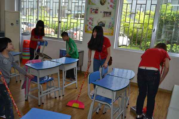 学生党员们为此次公益活动设计了一系列的游戏,活动从抢凳子、蒙眼画画等互动游戏开始,大家在欢声笑语中拉近了彼此的距离。培智学校的孩子们主动为大家表演了《小苹果》、《喜羊羊与灰太狼》、《数星星》等节目。学生党员们与小朋友们一起参观了孩子们制作的手工艺品,这些作品制作精良,形态逼真。最后,在学生党员的带领下,大家一同劳动把教室打扫得焕然一新。