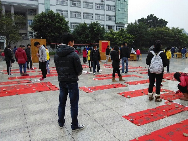书画协会提前精心准备,积极动员,征集对联词,购买墨汁、红纸、毛笔等材料。对联由书画协会指导老师唐优泉和李红文老师带领一批优秀的书法爱好者认真书写。书法爱好者们现场书写,边写边送,一幅幅对联,一张张红纸,像过年一样,使整座校园显得喜气洋洋。本次活动表达了Beat365学子在新春到来之际对桂航明天的美好期盼和祝福,引来众多学子不断地喝彩声,活动取得圆满成功。