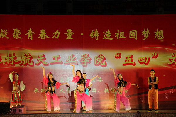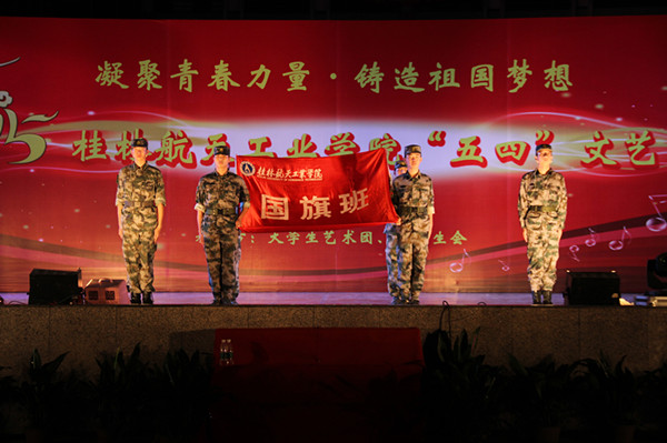 晚会在艺术团主持队铿锵有力的朗诵《青春之歌》中拉开序幕,朗诵紧扣晚会主题,号召广大青年自觉践行社会主义核心价值观,继承和发扬中华优秀传统文化,坚守和弘扬五四精神,为实现中华民族伟大复兴的“中国梦”贡献青春正能量。接下来的一系列节目更是歌颂了五四青年的青春面貌,将晚会一次次推向高潮。艺术团舞蹈队的现代舞《大学的天空》以雄壮的舞曲和刚柔兼并的舞姿相结合,波澜起伏的舞蹈情节带我们走进不一样的大学天空。国旗班的小品《国旗下的成长》令人印象深刻,讲述了初出茅庐的小士兵在教官的帮助下渐渐成长的故事,表演结束,全体师生起立,奏国歌,升国旗,庄严肃穆。国旗班用这样的方式来体现他们对青春的礼赞,令人动容。模特队的姑娘们穿着青春洋溢的服装,在舞台上展示青春活力,诠释着他们对青春的理解。晚会中最炫酷的当属街舞队和十系一起表演的荧光舞《共青春》,令人捉摸不定的身影,各型各色的花样技巧,不知道下一秒会出现在哪里的荧光,将同学们引入别样世界里。这些优秀的校园文化作品不仅展现了本届五四文化艺术节较深的文化内涵和较高的艺术水准,也体现了桂航学子昂扬向上、多才多艺的良好风貌。