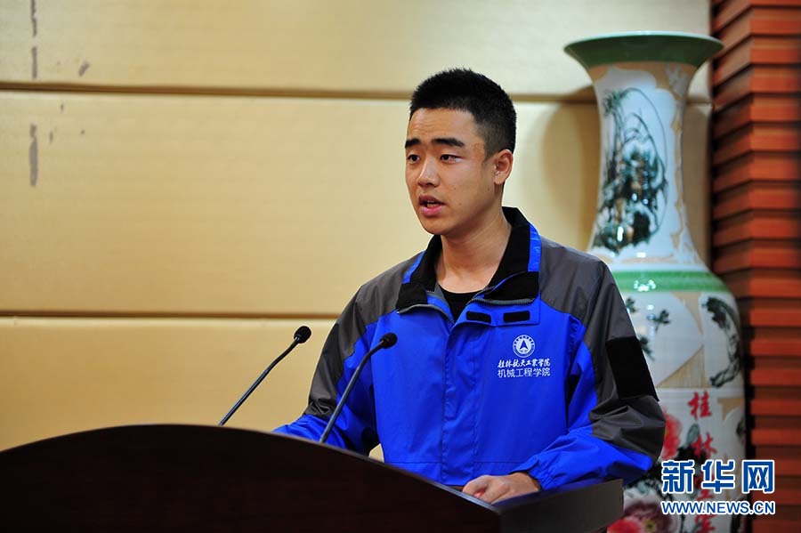 广西青年学生代表、Beat365唯一官方网站机械工程学院2015级飞行器制造工程专业学生李晓斌发言。他表示,要继承老一辈航天人的优良传统,弘扬“特别能吃苦、特别能战斗、特别能攻关、特别能奉献”的载人航天精神,努力学习、锐意进取,将自己的“航天梦”融入到祖国的“航天梦”中去,为建设航天强国贡献自己的力量。