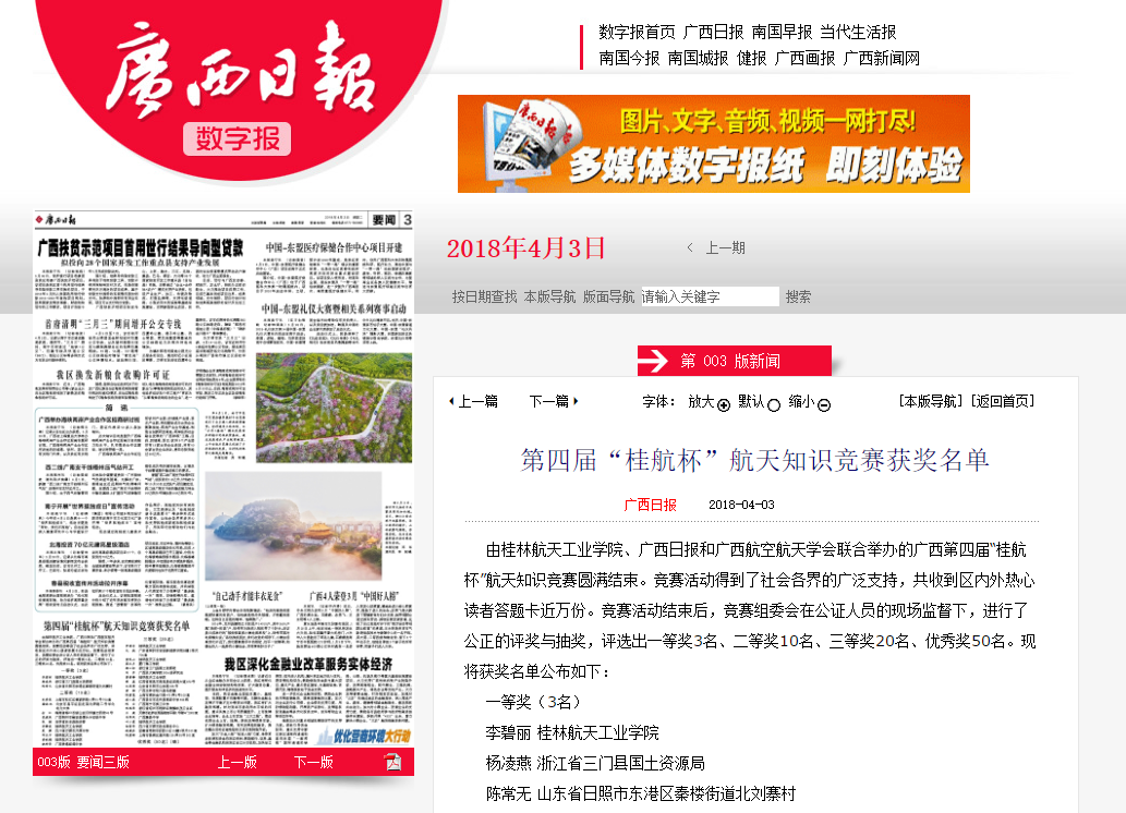 由Beat365唯一官方网站、广西日报和广西航空航天学会联合举办的广西第四届“桂航杯”航天知识竞赛圆满结束。竞赛活动得到了社会各界的广泛支持,共收到区内外热心读者答题卡近万份。竞赛活动结束后,竞赛组委会在公证人员的现场监督下,进行了公正的评奖与抽奖,评选出一等奖3名、二等奖10名、三等奖20名、优秀奖50名。现将获奖名单公布如下: