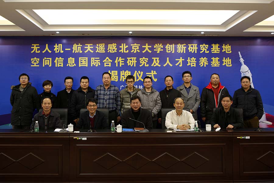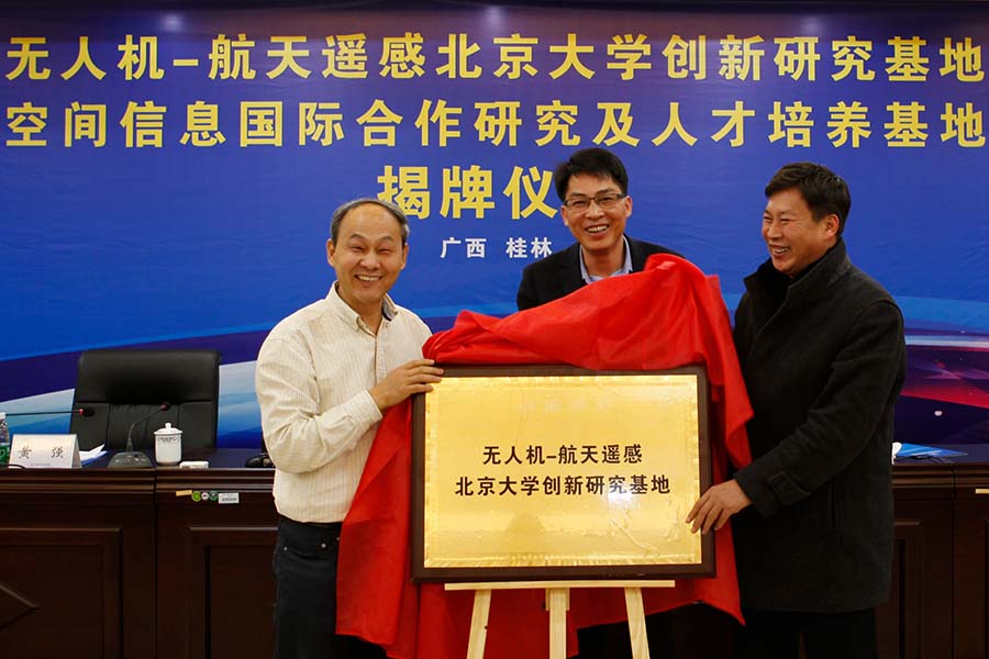 嘉宾为“无人机—航天遥感北京大学创新研究基地”、“空间信息国际合作研究及人才培养基地”揭牌。