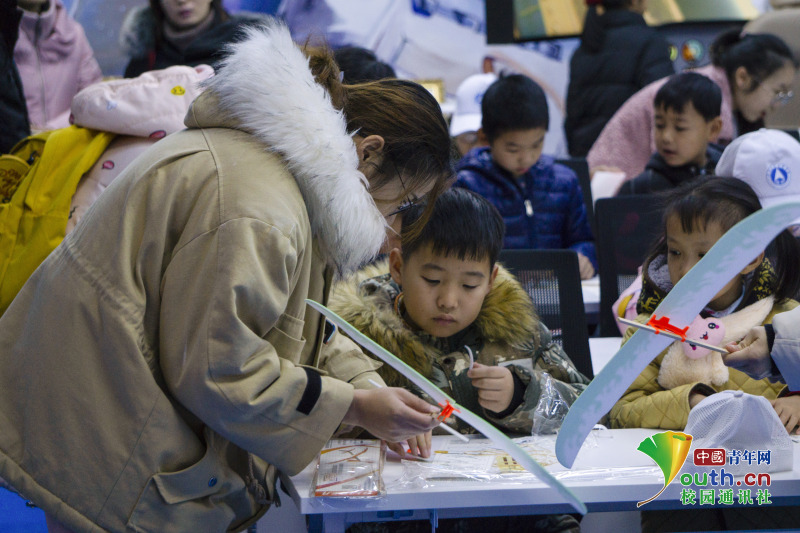 图为工作人员指导小朋友制作弹簧飞机。中国青年网通讯员 范新琦 摄