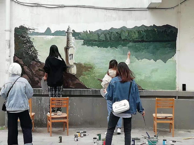 为配合桂林七星村委上关村持续推进美丽乡村建设,提升乡村风貌,打造乡村风貌精品示范型村屯的活动,受穿山街道办副主任、七星村包村领导邀请,传媒与艺术设计学院选派优秀党员教师与视觉传达设计专业的同学利用业余时间为上关村义务精心设计绘制了系列乡村壁画,在村道巷口的墙壁上一一展现。壁画内容包括上关村历史老照片、漓江风光、赛龙舟、包粽子、打粑粑、磨豆腐等历史、景观和传统民间节日风俗题材,记录往昔岁月、展望美丽乡村发展前景,将生态文明、乡村振兴等与本村特色元素结合。