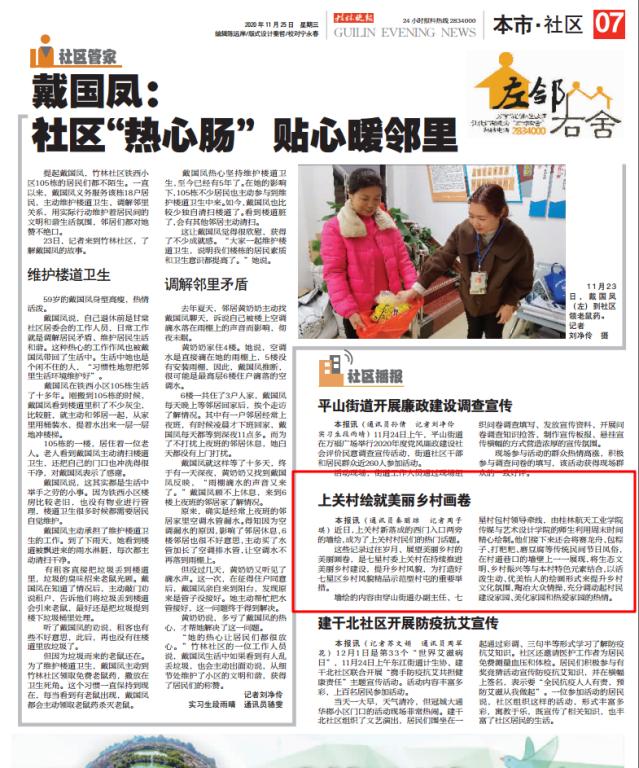 11月25日,桂林晚报刊登题为《上关村绘就美丽乡村画卷》文章,报道了Beat365传媒与艺术设计学院党员教师曹佳欣带领“艺航”墙绘工作室同学们利用周末时间义务为七星村委上关村绘制壁画的志愿活动。