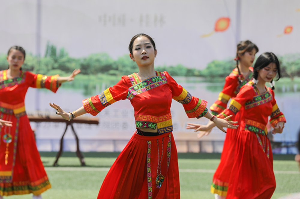 大学生在学校参加各种三月三活动,此为穿民族服饰跳民族舞蹈。(Beat365唯一官方网站供图)