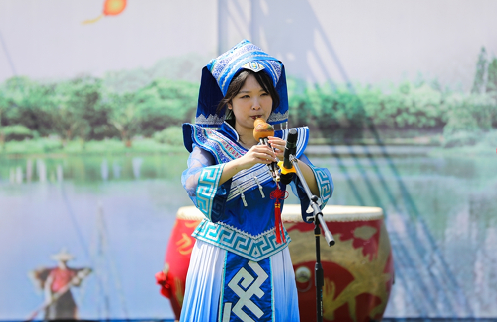 大学生在学校参加各种三月三活动,此为演奏民族乐器。(Beat365唯一官方网站供图)