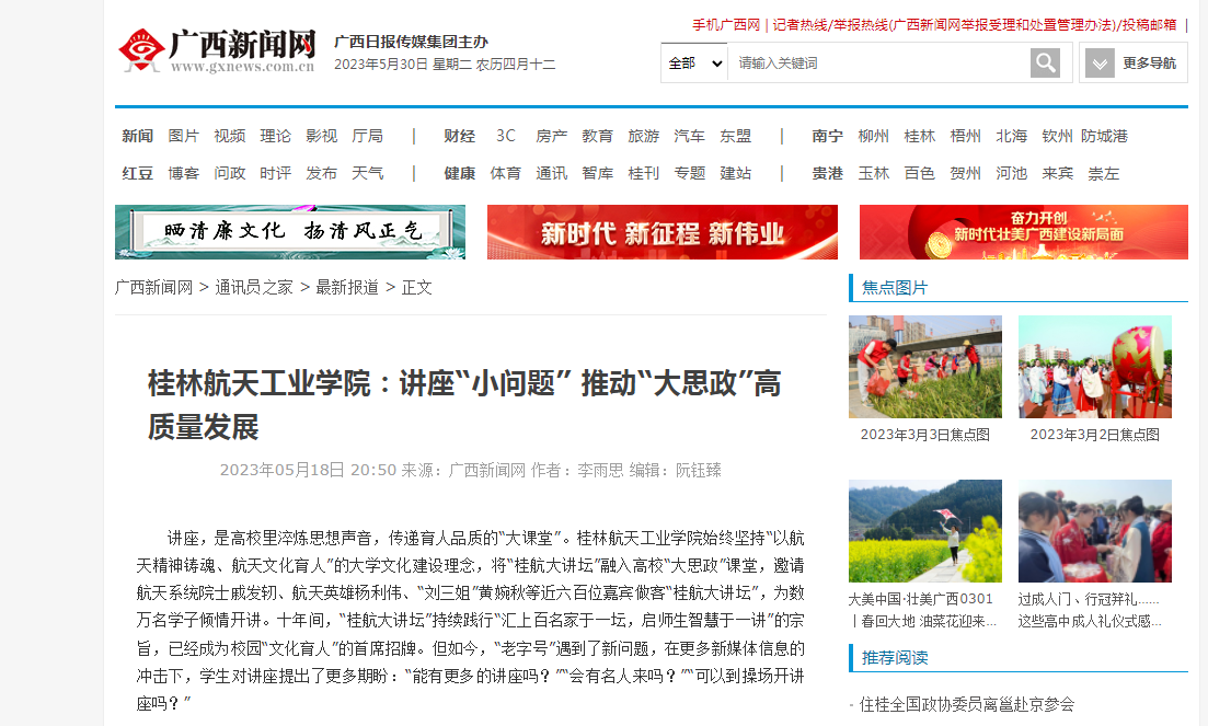 “桂航大讲坛”的主管部门——学校党委宣传部在主题教育的指引下,敏锐地发现,以“桂航大讲坛”为切入点,解决的不是一场一讲的小问题,而是切入了高校“大思政”的大需求。讲座是课堂教学的有益补充,学校要充分利用桂北红色旅游资源、科学精神和航天精神资源,将生动鲜活的实践成就,以及英雄模范的先进事迹等引入讲座,为师生们讲好“思政大课”。
