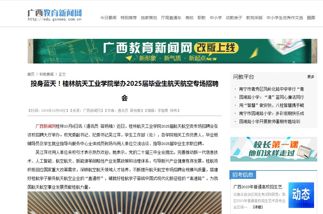 航天航空专场招聘会成功举办十余载来,已成为桂航凸显办学特色,搭建学校与行业之间沟通桥梁的良好平台。下一步,桂航将进一步落实就业“一把手工程”,举办2025届毕业生校园综合双选会,校友单位专场招聘会,“小精专优”专场等多场次招聘会,创新深化校企校地合作,广泛挖掘行业资源,全力推动用人单位与毕业生供需对接,努力促进毕业生更高质量更加充分就业。