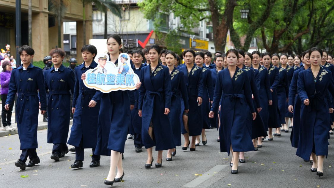 航空服务与旅游管理学院24级空中乘务2班张皓甯在巡游后说到:“从准备到正式巡游,每一个环节都凝聚着大家的心血。当我们方阵整齐地出现在巡游队伍里,那种自豪感油然而生。我们代表的不仅仅是自己,更是学院的形象和空中乘务专业的风采”。