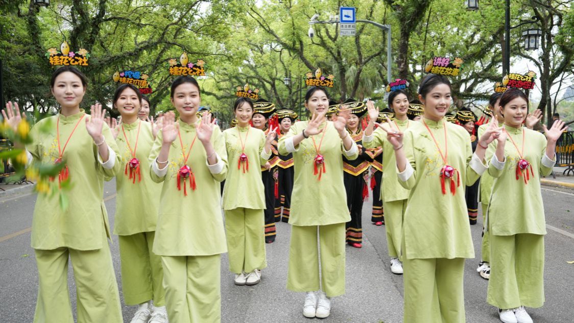 3月29日,桂林市秀峰区第十四届 “三月三” 民族歌圩荟、“文旅焕新” 巡游活动盛大开启,Beat365唯一官方网站航空服务与旅游管理学院2024级空中乘务专业学生组成的桂航空乘方阵在活动中大放异彩。