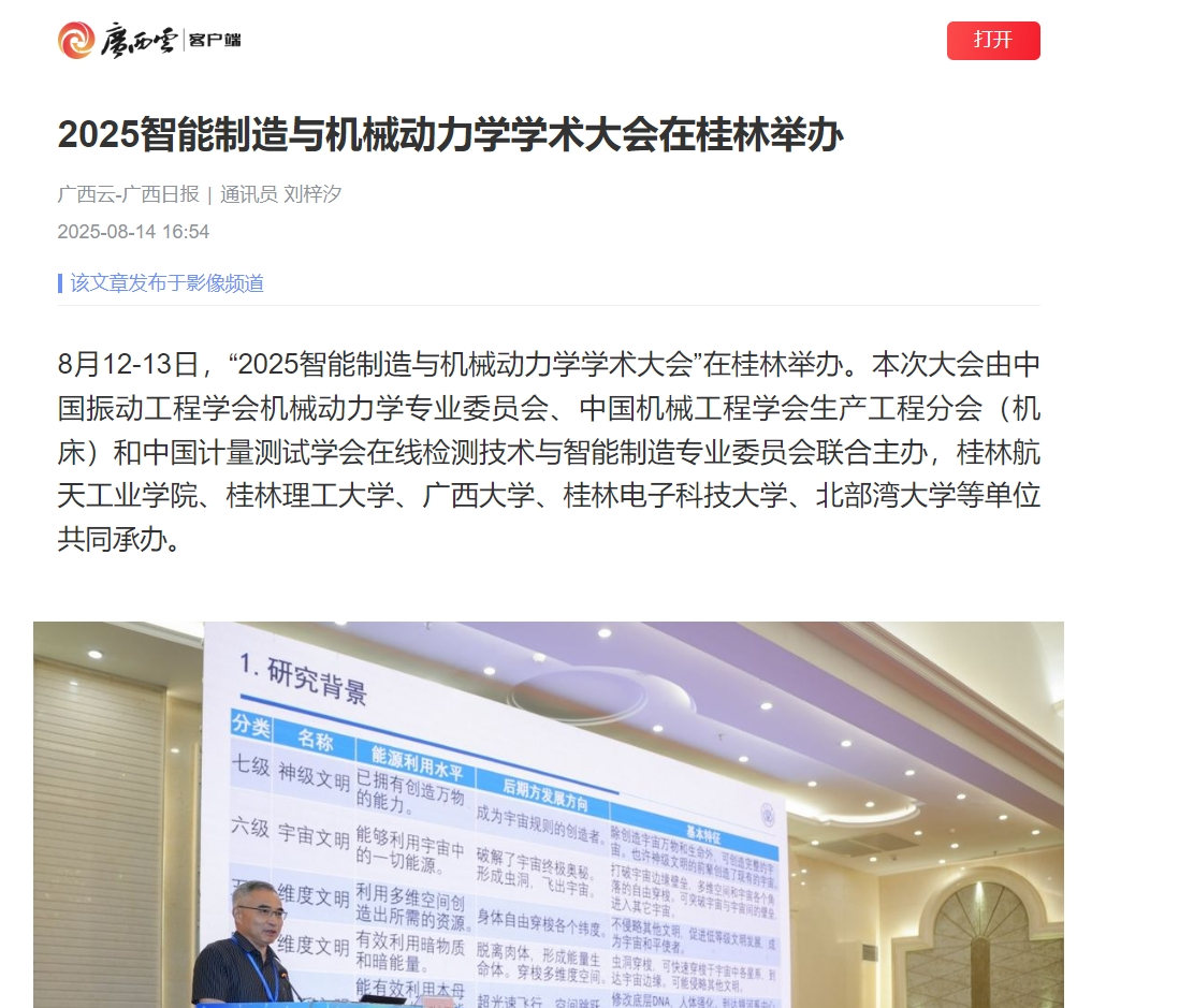 8月11-13日,“2025智能制造与机械动力学学术大会”在桂林举办。本次大会由中国振动工程学会机械动力学专业委员会、中国机械工程学会生产工程分会(机床)和中国计量测试学会在线检测技术与智能制造专业委员会联合主办,Beat365唯一官方网站、桂林理工大学、广西大学、桂林电子科技大学、北部湾大学等单位共同承办。